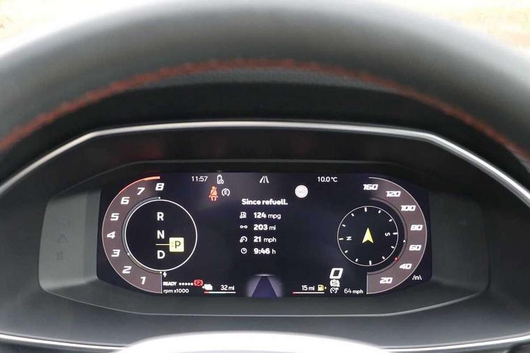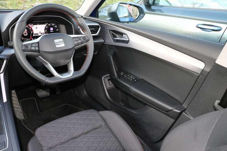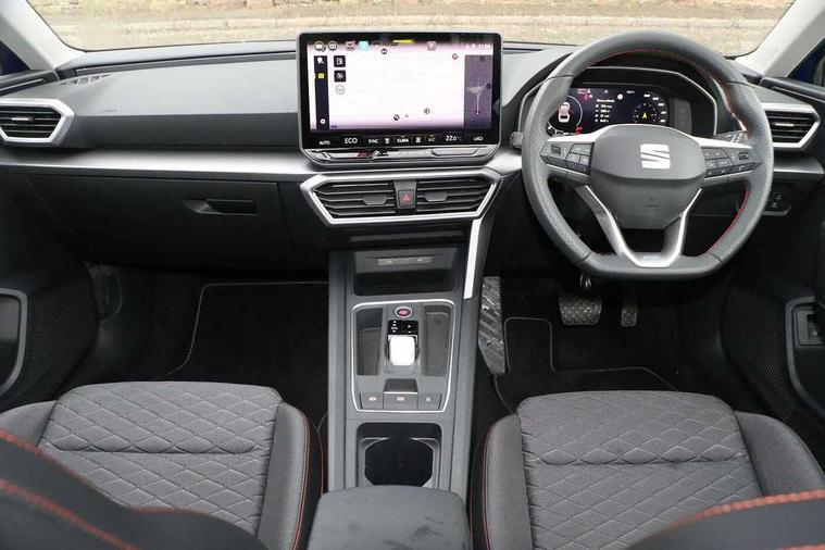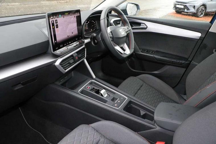Digital cockpit with multifunction display, Driver attention alert with drowsiness warning, E-call, Front assist with forward collision warning braking reaction to vehicles, pedestrians and cyclists, Full link smartphone integration with Mirror Link, wireless Apple CarPlay and wired Google Android Auto, Intelligent speed assist, Lane assist, Lockable tailgate, Park assist (inc front/rear parking sensors), Power assisted speed sensitive electro-mechanical steering, Rear view camera, RPM, trip computer, outside temp gauge, instrument light brightness, low fuel warning light, lights on reminder, gearshift indicator, SEAT drive profile with 4 modes (Eco/Normal/Sport/Individual), throttle response and gearshift mode, Service interval indicator, Start/stop system with regenerative braking, 10 amp mode 2 charging cable, 16 amp mode 3 charging cable, XDS electronic differential lock and dynamic traction support, 2 front and 2 rear USB-C ports, Auxiliary input socket, Auto dimming rear view mirror, Black roof rails, Body colour door handles, Body coloured bumpers, Cosmo grey exterior mirrors with integrated LED indicators, Dark tinted rear windows, Dynamic headlight range control, Dynamic turn signal lights, Electric front/rear windows, Electrically adjustable, heated and folding door mirrors, FR sports bumper, Illuminated front door sill, LED front fog lamps, LED headlights and LED infinite rear tail lights, LED rear fog lamp with rear coast to coast light, Rear side wing doors, Rear wash/wipe, Separate daytime running light with automatic headlight control and coming home feature, Third brake light, Welcome light silhouette from exterior mirrors, Windshield wiper intermittent control with light/rain sensor, 12v power point in centre console, 3 seat bench in 2nd row, 60/40 split rear bench seat with armrest, Ambient lighting with glovebox, footwell and single monocolour, Driver/passenger manual seat height adjustment, Dust/pollen filter, Front and rear height adjustable headrests, Front and rear reading lights X 4, Front centre armrest, Front seatback storage pockets, Grey headlining, Height/reach adjust steering wheel, ISOFIX points in outer rear seats with top tether anchorage points, Luggage tie-down hooks, Lumbar adjustment for front seats, Single front passenger seat, Sliding boot cover, Sunvisors with covered illuminated mirror, Three zone climate control, Two tone cloth upholstery, Media system plus with navigation - Leon, 3 point seatbelts on all rear seats, ABS, Brake control system - ESC and brake booster, Child proof door locks, Driver and front passenger airbags with front passenger airbag de-activation, front side and curtain airbags, Electronic parking brake, Extended safety system - seat belt tensioner, window closure and hazard lights, Hill hold control, Rear disc brakes, Seat belt reminder for front and rear seats, Tyre pressure monitoring system, Anti theft alarm system with interior monitoring in cab, backup horn and towing protection, KESSY Go (Keyless start), Locking wheel bolts, Wireless phone charging, Chrome interior detailing, 17" Dynamic Bi-spoke alloy wheels with 91W tyres, Emergency tyre repair kit, Tool kit without jack,