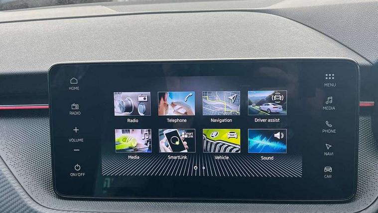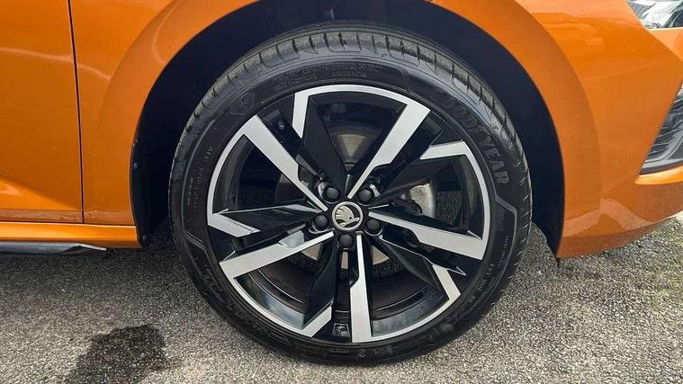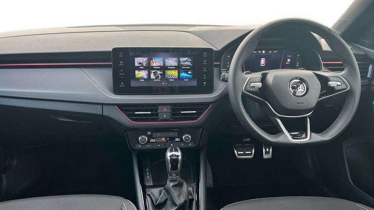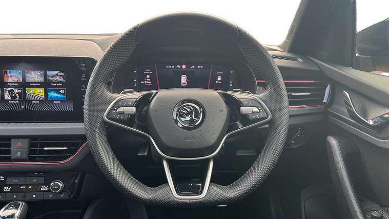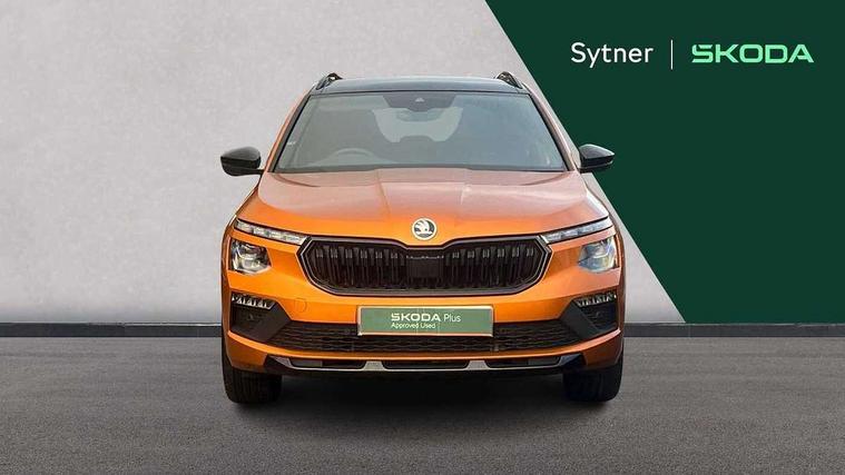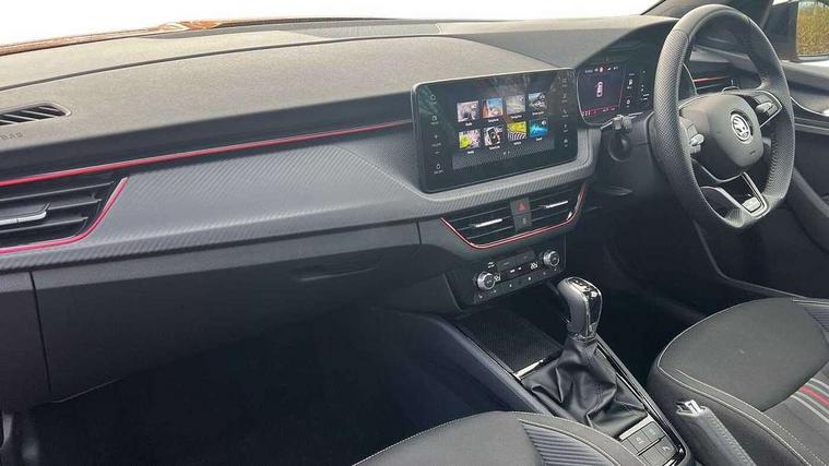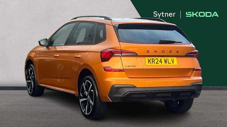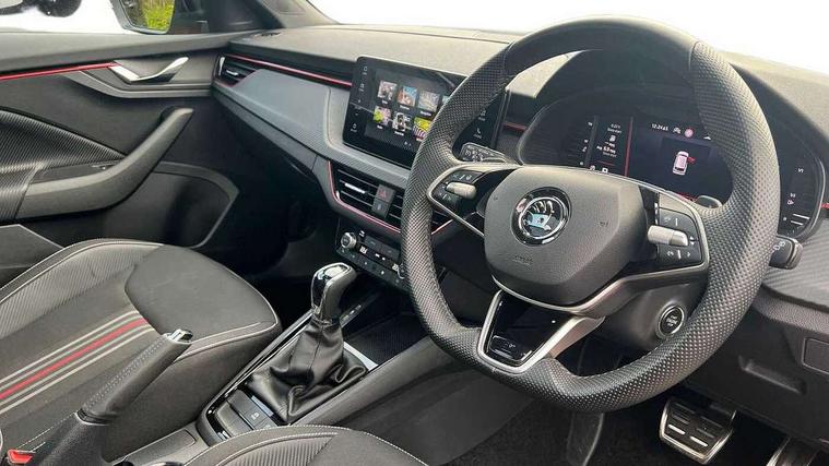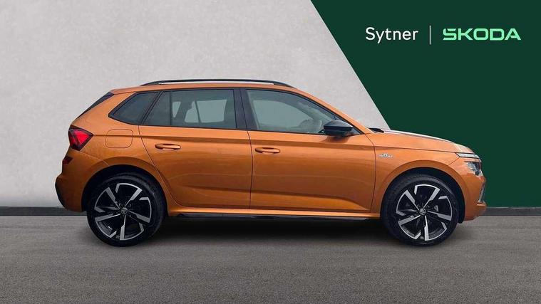 Advanced driver attention and drowsiness monitor, Bluetooth system, E-call, Front assist system, PAS, Rear parking sensors, Service indicator, Speed limiter, Traffic sign recognition, Virtual cockpit with 10.25" display, Voice control system, Wireless smartlink, 4 USB C ports, 8 Speakers, 9.2" Skoda navigation display, DAB Digital radio, Auto dimming rear view mirror, Automatic headlight control with coming home and leaving home feature, Automatic headlights, Black door mirrors, Black radiator grille, Black rear diffuser, Black roof spoiler, Body colour bumpers, Body colour door handles, Boot lettering in black, Extended tailgate glass, Fixed panoramic sunroof with black roof rails, Front and rear electric windows, Heated rear window, LED daytime running lights, LED high beam, LED low beam, LED third brake light, Monte carlo plaque, Privacy glass, Rear side wing doors, Rear wiper, Ticket holder inside windscreen, 12V socket in luggage compartment, 3 seat bench in 2nd row, Aluminium pedals, Ambient lighting in white/red, Art leather carbon decor inserts, Art leather carbon door inserts, Black roof lining, Cargo elements, Chrome inner door handles, Driver and passenger sun visors with vanity mirror, Dual zone climate control, Front and rear roof lights, Front centre armrest, Front head restraints, Glove compartment with illumination, Height adjustable driver seat, Height adjustable front passenger seat, Ice scraper, Inner circulation control with pollen filter, ISOFIX on front passenger seat, Isofix preparation for back seats, Leather gearknob and handbrake lever, Manual lumbar support for front seats, Monte Carlo cloth upholstery, Net package and top tether hooks in boot space, Net under rear shelf, Pocket on the back of both front seats include mobile phone pockets, Rake/reach adjustable steering wheel, Reading lights, Rear centre armrests, Red hotstamping, Single front passenger seat, Sports seats, Textile floor mats, Third rear headrest, Top tether for front passenger seat, Umbrella in driver's door, Light and view plus package - Kamiq, 3x3 point rear seatbelts, Airbags - driver and front passenger, Disc brakes, ESP, Extended and predictive pedestrian/cyclist protection, Front passenger airbag deactivation switch, Front side airbags with curtain airbags, Hill hold control, Manual leather parking brake, Manual rear child locks, One tone horn, Seatbelt reminder for driver an co-driver, Traction control, Tyre pressure monitor, Anti-theft alarm system with interior monitoring, backup horn, towing protection and remote central locking with SAFE system, Anti-theft wheel bolts, Electronic engine immobilizer, 18" Ursa black diamond cut alloy wheels,