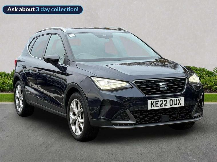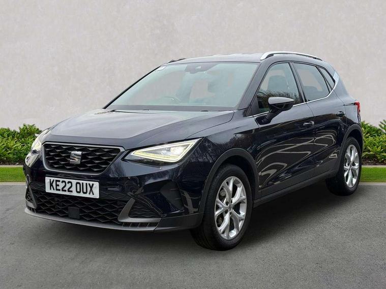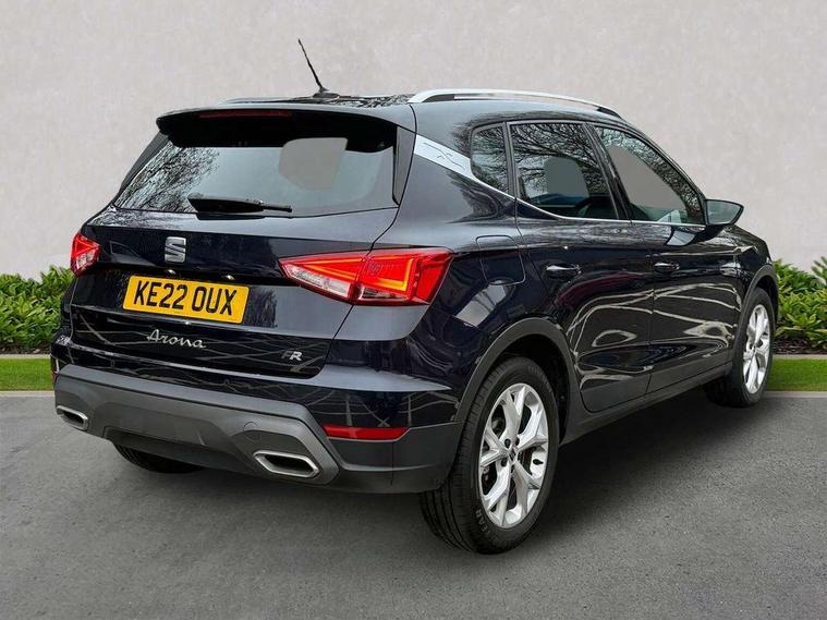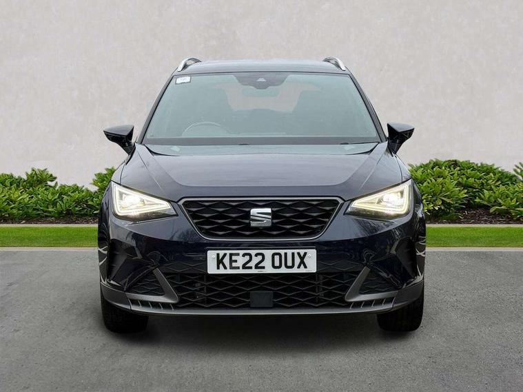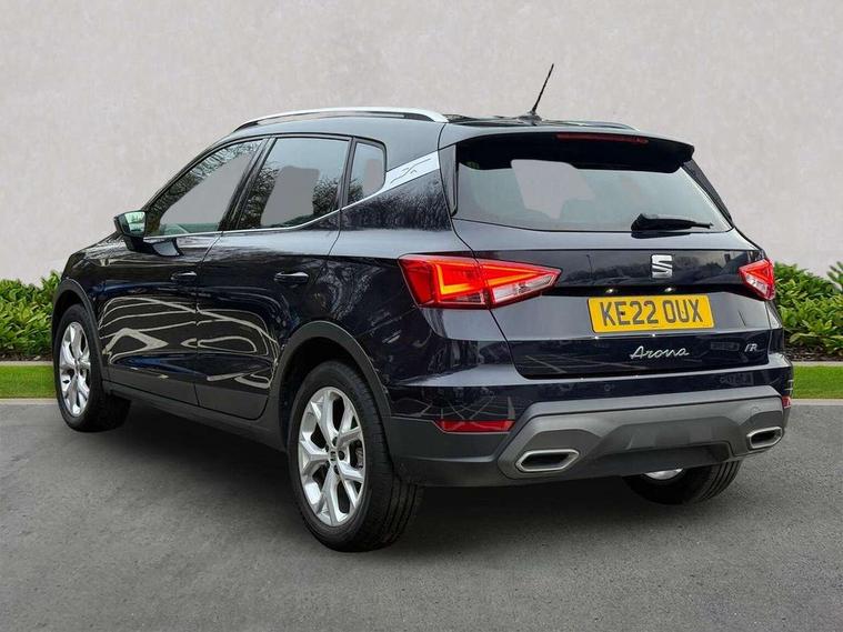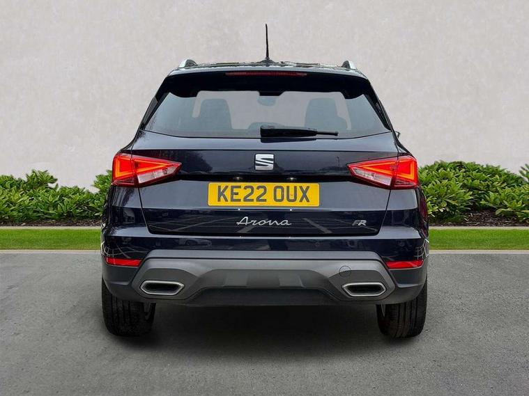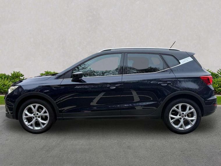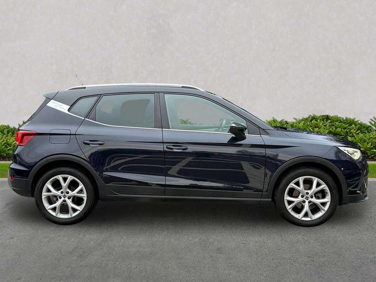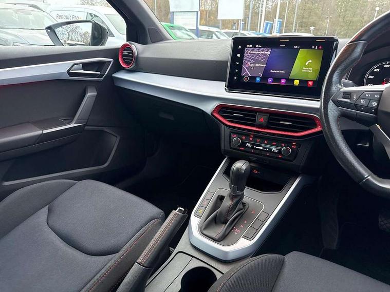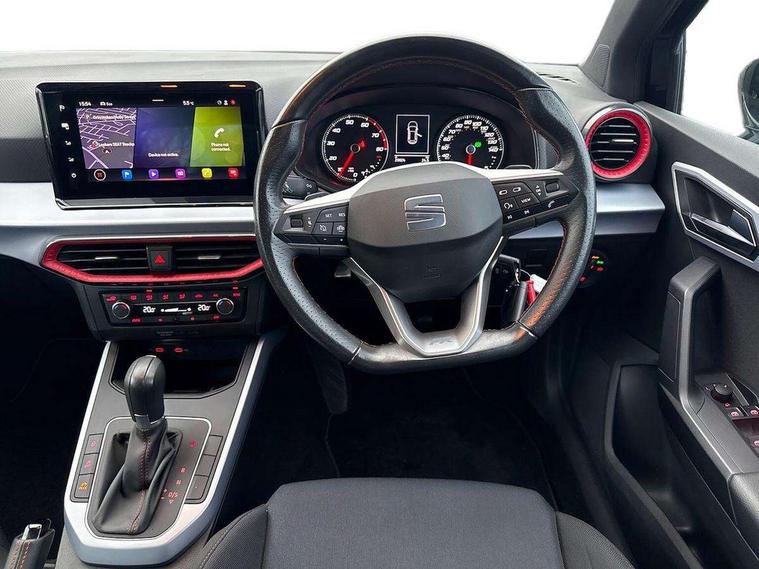 'Lights On' Reminder warning buzzer, Digital clock, E-call, Electric speed sensitive power steering, Full Link Smartphone Integration with Mirror Link, Apple Car Play, Google Android Auto with USB Type C cable for Apple and Android compatibility, Lane keeping system, Low fuel warning light, Outside temperature display, Rear parking sensor, RPM counter, Seat connect with safety, service, remote and online, SEAT Drive profile - Four different models normal-sport-eco-individual, steering response, throttle response and gear shifts mode, Trip computer, Bluetooth interface for hands free and audio streaming, DAB digital radio and AM/FM radio, Steering wheel mounted audio controls, Anti theft roof antenna, Auto dimming interior rear view mirror, Automatic activation of hazard warning lights, Body coloured bumpers, Body coloured door handle inserts, Chrome roof rails and window surrounds, Chrome window trim, Dark tinted rear windows, Electric front/rear windows, Electrically adjustable, heated and folding door mirrors, FULL LED automatic headlights with dynamic headlight range control, coming and leaving home, LED daytime running lights, LED rear tail lights and licence plate lights, Protective side mouldings, Rain sensing wipers, Rear side wing doors, Rear spoiler, Rear window wash/wipe, Roof colour door mirrors, Third brake light, Twin exhaust pipe styling hidden exhaust pipe, Visible VIN plate, Windshield wiper with intermittent control and potentiometer, 2 cupholders, 3 seat bench in 2nd row, 60/40 split folding rear seat, Aircare filter, Black interior roof, Cloth upholstery, Daring red Illuminated coloured air vent, Double boot floor, Driver sunvisor with covered mirror + card holder, Dual zone climate control, Front courtesy light with 2x front and 2x rear reading lights, Front sport seats, Gear shift indicator, Height adjustable front seats, Height/reach adjustable steering column, Illuminated boot, Instrument lighting with brightness control, Interior ambient lighting, Interior light in footwell, central console and door panel, ISOFIX points in outer rear seats with top tether anchorage points, Passenger sunvisor with vanity mirror, Perforated flat bottomed leather steering wheel/gear knob/handbrake with red stitching and FR logo, Single front passenger seat, Steering wheel mounted gearshift paddles, Two front and three rear height adjustable headrests, Connectivity pack plus - Arona, Interior chrome pack - Arona, 3 point seatbelts on all rear seats, ABS, Active front headrests, Child locks on rear doors, Driver and front passenger airbags with front passenger airbag de activation, front side and curtain airbags, Electronic stability control, Emergency Brake Assist (EBA) and front assist, Front and rear seatbelt reminder, Hill hold control, Multi-Collision braking, Tiredness recognition system, Traction control, Tyre pressure monitoring system, Alarm with back-up horn, Electronic engine immobiliser, Locking wheel bolts, Remote central locking + deadlocks, Tow away protection, Titan black dashboard, 17" Dynamic alloy wheels,
