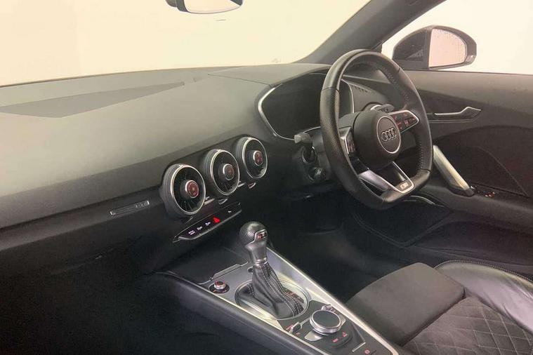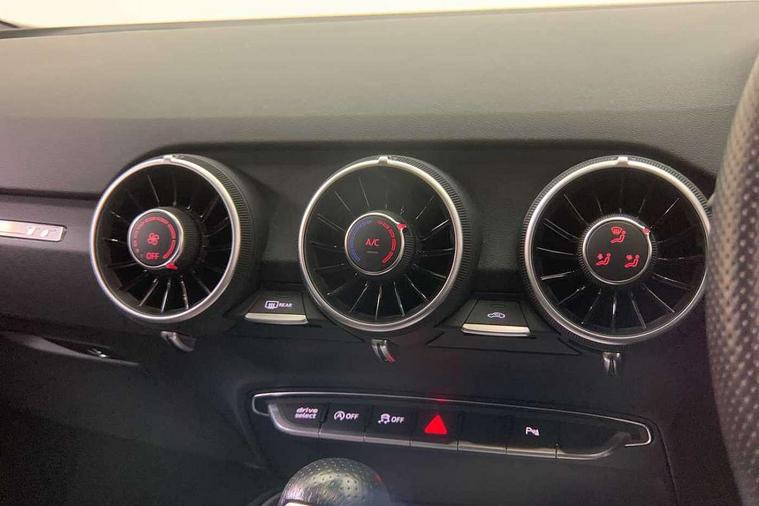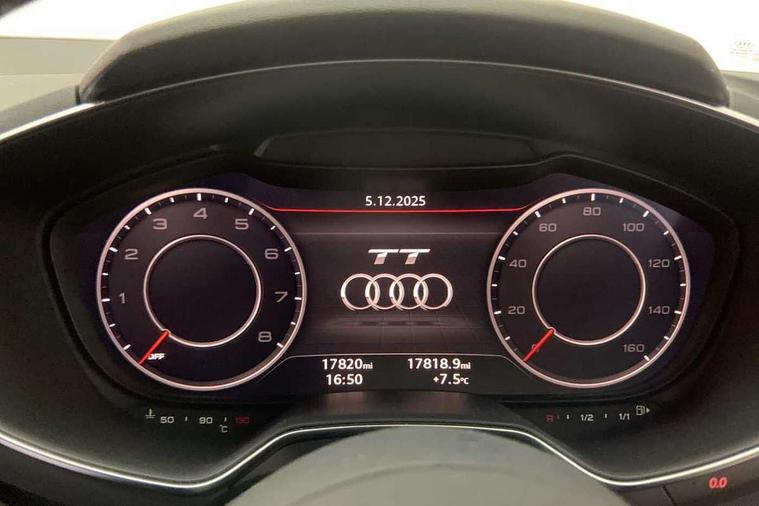 Audi drive select with 4 Pre configured modes, Audi smartphone interface, Audi virtual cockpit - 12.3" high-resolution LCD display with fully customisable instrument cluster, Cruise control + speed limiter, Emergency call service, MMI touch panel, Mobile phone preparation with bluetooth interface, Progressive power assisted steering, Service interval indicator, Start/Stop system with energy recuperation, TP memo, Sports suspension, AM/FM radio, Bluetooth audio streaming, DAB Digital radio, MMI Radio with CD player and SD/XC card slot, Auto dimming rear view mirror, Auto headlight range control, Black chrome tailpipe, Dark privacy glass from B-pillar backwards, Electric folding door mirrors, Electric front windows, Electrically adjustable and heated door mirrors with integrated LED side indicators, Front fog lights, Green tinted heat insulating glass, LED 3rd brake light, LED daytime running lights, LED headlights with LED rear lights + dynamic rear indicators, Light and rain sensors, Rear boot, Sunband for windscreen, 12V socket, 2 rear seats, 3 spoke flat bottomed high multi-function leather sport steering wheel with gearshift paddles, 4 way electric lumbar support for driver and front passenger, Black headlining, Contrasting silver stitching in steering wheel, Door sill trims, Extended aluminium look with stainless steel pedals, Front centre armrest, Front passenger seat, Front super sports seats, Heated front seats, Height adjustable driver's seat, Height adjustable front head restraints, Height/reach adjust steering wheel, ISOFIX child seat mounting for front passenger seat with airbag deactivation, Manual adjustment of seat height, fore/aft position, seat angle, seat depth and backrest angle, Perforated leather gearknob in black, Rear head restraints, Rear top tether child seat ISOFIX attachment, Split folding rear seat, Tool kit, Black styling pack - TT, Non smoking pack - TT/TT RS, 3 point front seat belts, ABS, ASR traction control, Curtain airbags, Driver and front passenger airbag with front passenger airbag deactivation, EDL traction control, Electromechanical parking brake, ESP, First aid kit, Front side airbags, Head airbags, Hill hold assist, Seatbelt warning, Tyre pressure loss indicator, Warning triangle, Anti theft alarm, Anti theft wheel bolts, Immobiliser, Keyless Go, Remote central locking, Matt brushed aluminium inlays, Tyre repair kit,