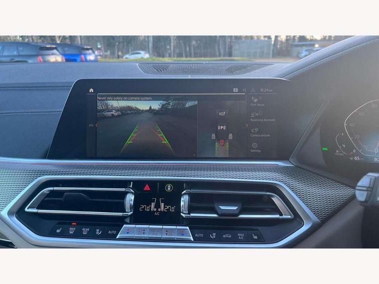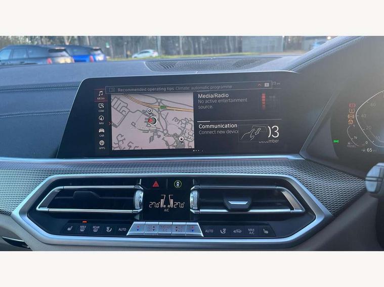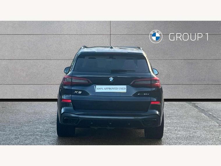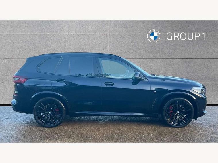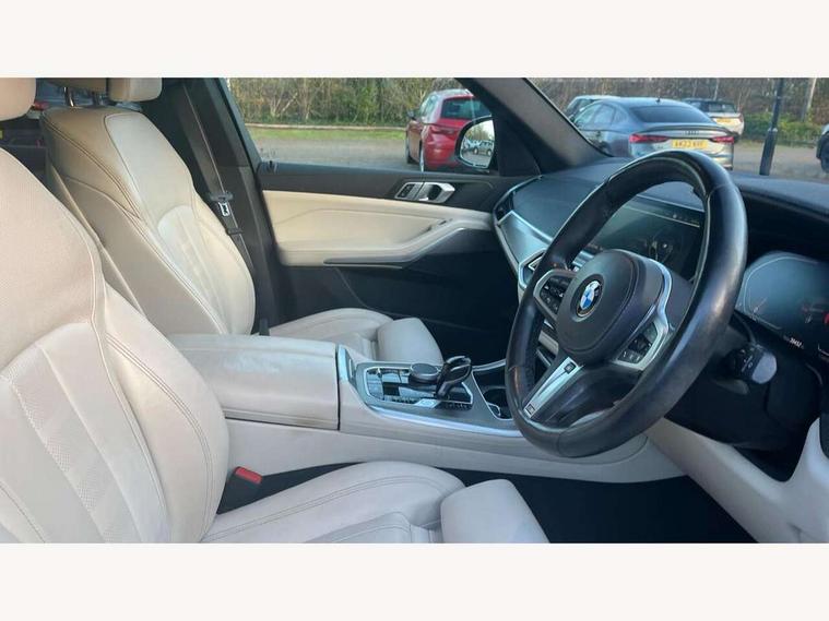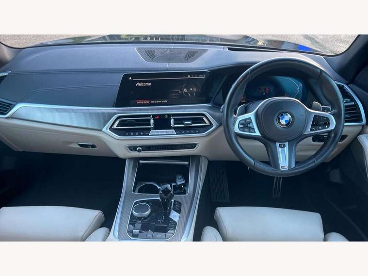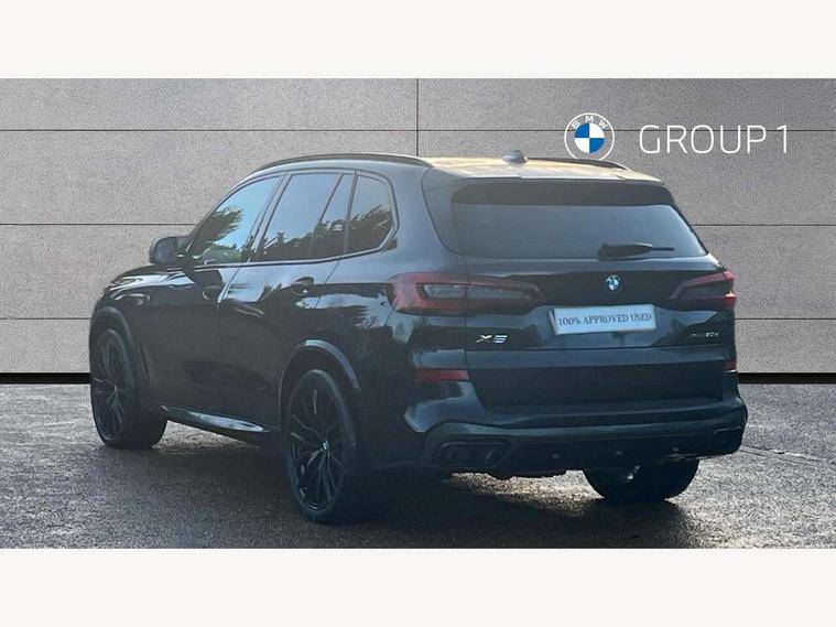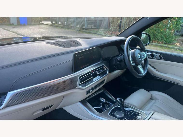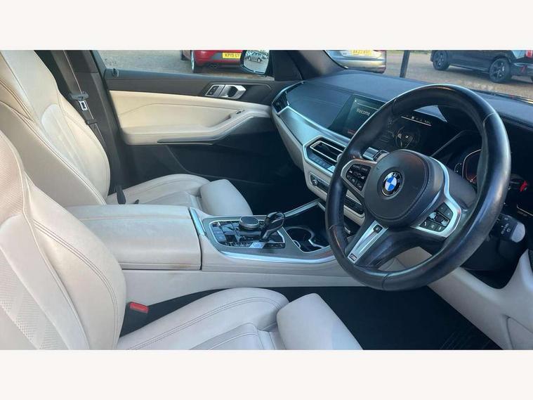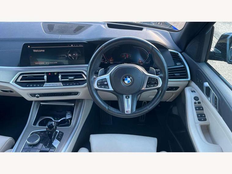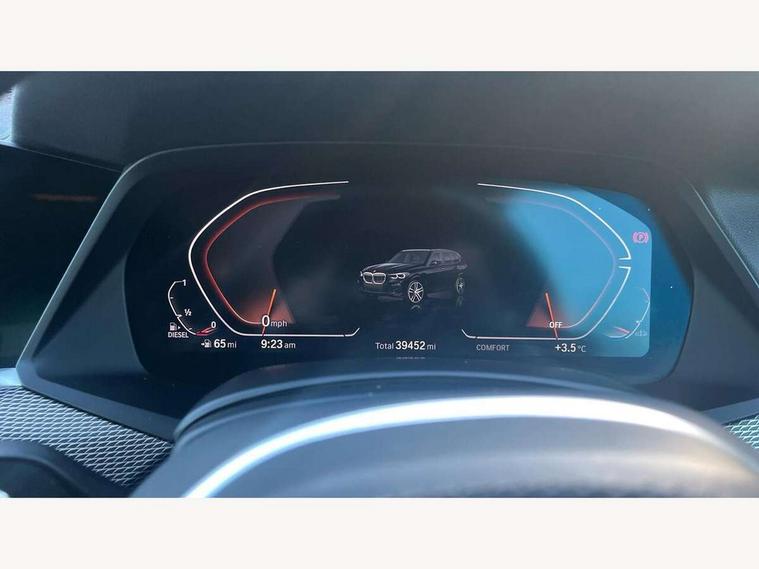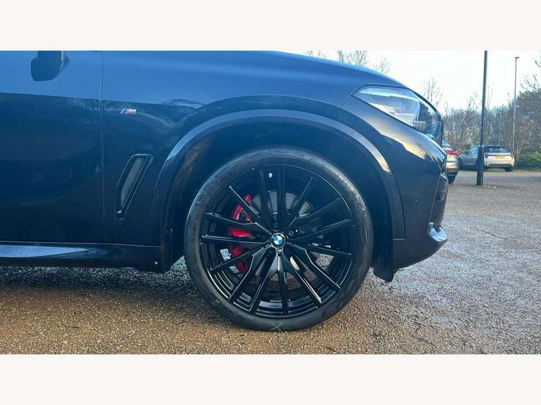 20GB hard disc drive (HDD) memory, Active guard plus, Attentiveness assist, Automatic tailgate with top hinged section open and manual bottom hinged section, BMW ConnectedDrive online services, BMW digital live cockpit professional - 12.3" digital instrument panel and 12.3" CID, with touch/voice command, BMW legal emergency call, BMW Teleservices, Brake force display, Brake pad wear indicator warning light, Cruise control with brake assist, Enhanced bluetooth with wireless charging, Front/rear park distance control, iDrive touch controller with shortcut buttons, Lights on warning, Oil sensor for level and grade, On board computer inc. average speed, fuel consumption, liquid crystal Info display, journey computer, outside temperature display, personal profile, Service interval indicator, Speed limit info display, Speed limiting function, Wi-Fi hotspot, 48V Mild hybrid technology, Adaptive 2-axle air suspension, Common rail technology, Diesel particulate filter, Double wishbone front axle, Drive performance control with ECO PRO comfort + sport mode, Eight speed steptronic sport automatic transmission and gearshift paddles on the steering wheel, Safety battery terminal clamp, Variable vane geometry, DAB Tuner enables digital radio reception, Favourite buttons, Hi-Fi loudspeaker system, USB connection, USB type A 1.5A in cupholder, USB Type C 3A in centre armrest, Active Air Stream kidney grille with high-gloss chrome, Adaptive air flap control bar in high-gloss black, Automatically dimming rear view mirror, BMW Individual high gloss black shadow line roof rails, Body colour bumpers, Body colour door handles, Dynamic brake lights with LED technology, Exhaust tailpipes - single, left and right with Chrome finisher, Follow me home headlight function, Front and rear electric windows with open and close fingertip control, anti trap facility and comfort closing, Heated windscreen washer jets, High beam assistant, High gloss black outer and central air intakes on front bumper with pearlescent chrome finish, High gloss black Side elements, LED daytime running lights, LED rear lights, M aerodynamic body styling, M designation on left and right front side panels, Pearlescent chrome front grille bars, Rain sensor with automatic headlight activation and windscreen wiper control, Rear side wing doors, Satin aluminium side window graphic, Third brake light in rear spoiler, Variable intermittent rear wash/wipe, Welcome light carpet, X5 on left tailgate, xDrive designation on right tailgate, 12V - Power sockets with 2x centre console and 1x luggage compartment, 3 seat bench in 2nd row, 40:20:40 split folding rear seats, Ambient interior lighting with 6 pre-designed selectable lights including dynamic function, Centre and rear interior light, Child seat ISOFIX attachment with rear outer seats includes top tether, Compartment in front of cupholder, Electric front seat adjustment with driver and front passenger memory function, Electrical steering column with adjustable height and length with activation and control on the steering column, Foldable rear centre armrest with 2 cupholders and storage compartment, Front and rear cupholders x 2, Front and rear door pockets, Front and rear door sill inlays with illuminated BMW M designation, Front and rear side armrest integrated into door trim, Front footwell lights, Front reading lights, Light inside glove compartment, Lockable glove compartment, Luggage compartment floor panel with integral storage tray, Luggage compartment lighting, M leather steering wheel, M specific key, M specific steering wheel, M specific velour floor mats, Make-up mirror lights, Multifunction controls for leather steering wheel, Multifunctional hooks, Rear head restraints, Seat back with flap pocket, Securing rings in luggage compartment, Single front passenger seat, Storage bins on all doors, Storage tray and compartment with cover in centre console, Sunvisors with illuminated vanity mirrors, Toolkit located in luggage compartment, Connected Package Professional - X5, Expanded exterior mirror pack - X5/X5 M, Non-smokers pack - X5, Airbags - driver/front passenger, rear and side, first and second row seats head airbags, front passenger seat airbag deactivation + knee airbag, Anti-lock braking system (ABS), Automatic Stability Control (ASC), Brake drying, Brake energy regeneration, Brake fade compensation, Braking pre-tensioning, Cornering brake control (CBC), Crash sensor activating central locking release, hazard warning lights, fuel cut off, interior lighting + activation of safety battery terminal clamp, Deformation zones - front and rear with door reinforcements and bumpers up to 2.5 mph, DSC - Dynamic Stability Control, Dynamic brake control, Dynamic Traction Control - DTC, Electromechanical parking brake with automatic drive away release and auto hold function, Electronic brake force distribution, Front and rear seatbelts with seatbelt stopper, seatbelt tensioner for front and outer rear seats and belt force limiter, Front head restraints with anti-whiplash, Height adjustable front seatbelts, Hill start assistant, Integrated brake system, M Sport braking system in blue high gloss + blue painted brake calipers with M designation, Mechanical child proof lock on rear doors, Passive protection for pedestrians, Seat occupancy detection for driver and passenger side, Side impact protection, Three 3 point inertia reel seatbelts, Two tone horn, Tyre pressure monitoring system, Ventilated front and rear disc brakes, Warning triangle and first aid kit, Closing system with central locking, Driver and front passenger door centre lock switch, Locking wheel bolts, Thatcham 1 alarm system with remote control and engine immobiliser, Start/stop toggle diamond shaped trim finisher in pearl chrome,