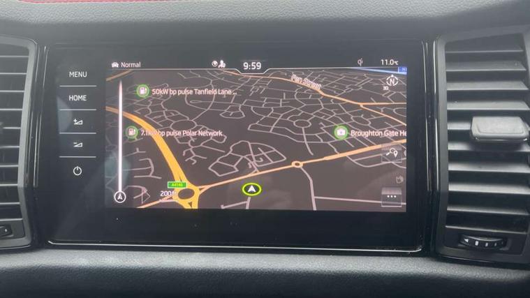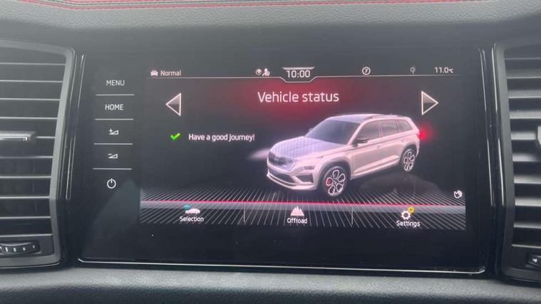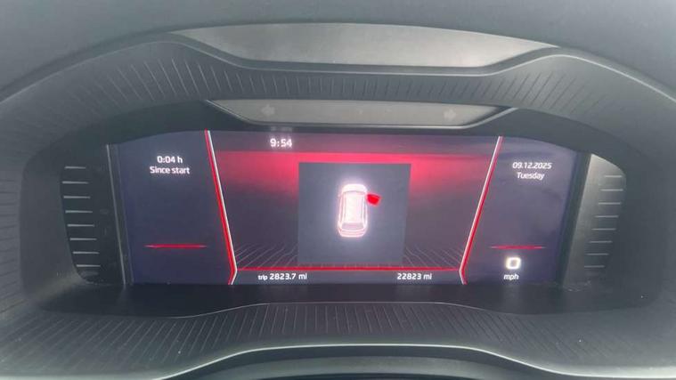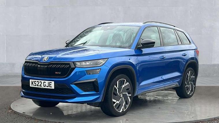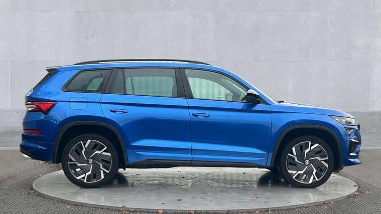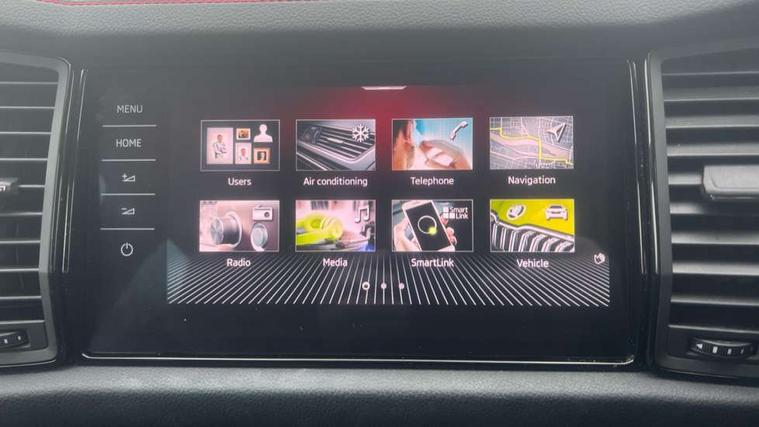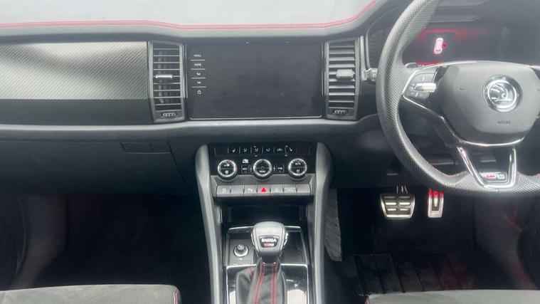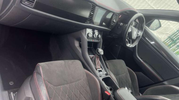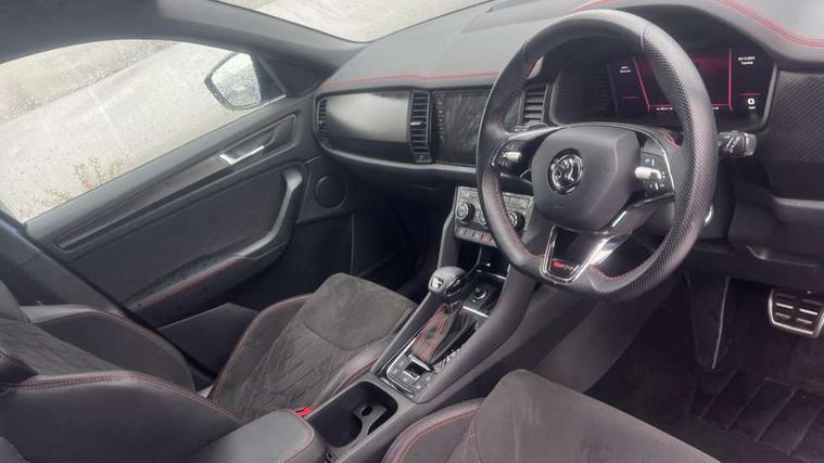 Bluetooth system, Columbus satellite navigation with 9.2" touchscreen, integrated Wi-Fi, web radio, Digital voice enhancement, E-call, ECO Stop/start function, Exterior temperature indicator, Progressive steering, Rear view camera, Smartlink wireless for apple carplay and wired for android auto, Speed limiter, Tailgate unlocking from outside, USB C Port x 2 in front centre console, Virtual Cockpit - 10.25" digital display, Wireless charging, Dynamic Chassis Control including off-road function, 8 Speakers, DAB Digital radio, Dynamic sound booster, Aero front windscreen wipers with intermittent function, Aero rear window wiper, Auto dimming rear view mirror, Black wheel arch surrounds, Body colour bumpers, Body colour door handles, Chrome exhaust tailpipe, Electric adjustable/heated/folding door mirrors, driver side auto dimming with boarding sports and memory function, Electric front and rear windows, Extended rear spoiler with finlets in gloss black, Front fog lights, Full LED matrix headlights with AFS (adaptive front light system), cornering function and AWL (all weather lighting system), Gloss black door mirrors, Gloss black roof rails, Heated rear window, LED daytime running lights, LED rear fog light, LED third brake light in rear spoiler, Light assistant (coming/leaving home/tunnel light), Off-road style lower front bumper element, Privacy glass, Rain and light sensors, Rear diffuser, Rear LED lights (high functionality) with welcome effect and dynamic indicators, Rear side wing doors, Safety reflectors on front and rear doors, vRS exterior design - vRS front and rear bumpers with vRS badging (gloss black on tailgate and chrome on radiator grille) + black window surround, Window control switches with black trim, Without engine designation, 12V socket in boot, 2 rails with 2 hooks, 2 seat bench in 3rd row, 3 seat bench in 2nd row, 4 foldable roof handles with rear coat hooks, 60:40 foldable rear seat with sliding adjustment and backrest angle adjustment, Aluminium pedals, Black roof headlining, Bottle holders in door panel in the 1.5 litre front and 1 litre rear, Cargo storage compartments, Chrome headlight control button, Chrome interior door handles, Coat hooks on B pillar, Covered storage compartment on driver side, Front centre armrest with storage compartment, cup holder and 12V socket, Front courtesy lights, Gear shift lever with chrome frame and black gloss insert with vRS logo, Height adjustable front headrests, Illuminated and cooled glovebox, Illuminated luggage compartment, Isofix child seat fittings in outer rear seats with top tether, Manually adjustable steering column, Microsuede door panels with vRS black stitching, Net programme in boot (1x horizontal Net, 2x vertical Nets), Overhead glasses storage compartment, Pollen filter, Rear centre armrest with cupholders, Single front passenger seat, Sliding trunk cover, Small Bags on the inner sides of the front backrests, Sports seats, Sunvisors with illuminated vanity mirrors, Three rear height adjustable headrests, Ticket holder on A Pillar, Umbrella in door panel, Variable boot floor, vRS red stitching in front and rear armrests and door panel armrests, LED Interior light pack - Kodiaq, Auto door release and activation of warning lights in the event of an accident, Child locks on rear doors, Driver and front passenger airbag with knee airbag and front passenger airbag deactivation, Electronic parking brake with hill start assist, Emergency rear braking signal, ESC (incl. ABS+MSR+ASR+EDS+HBA+DSR+RBS+MKB), Front assist with autonomous emergency braking, Front side airbags with curtain airbags, Fuel cut off safety device, Height adjustable front 3 point seatbelts + pretensioners, Hill hold control, Rear disc brakes, Red brake calipers, Safety vest holder in door, Seat belt reminder for all seats, Three point rear seat belts, Two tone horn, Tyre pressure monitor, Alarm with interior monitoring and tilt sensor with safe function, Anti-theft wheel bolts, Immobiliser, Keyless entry and start system (KESSY), Remote central locking with 2 keys, Black air vent surround, Carbon finish dashboard and door inserts, Red stitching in dashboard, 20" Sagitarius anthracite alloy wheels with aero covers, Temporary spare wheel (space saver),