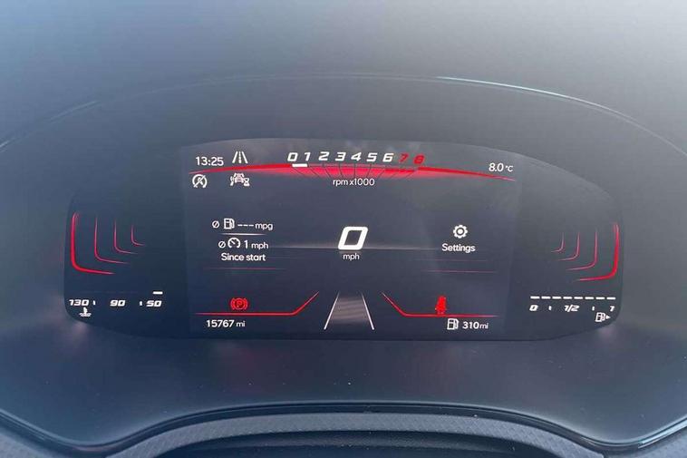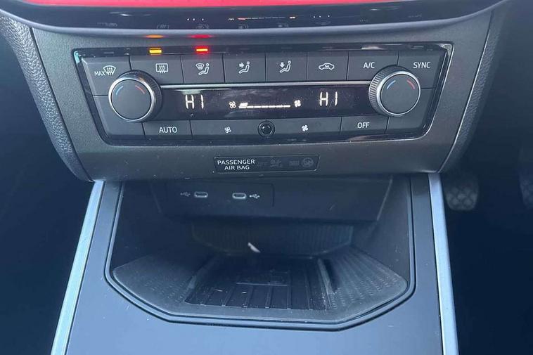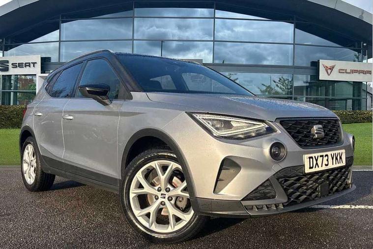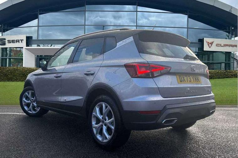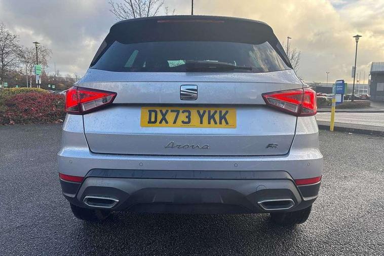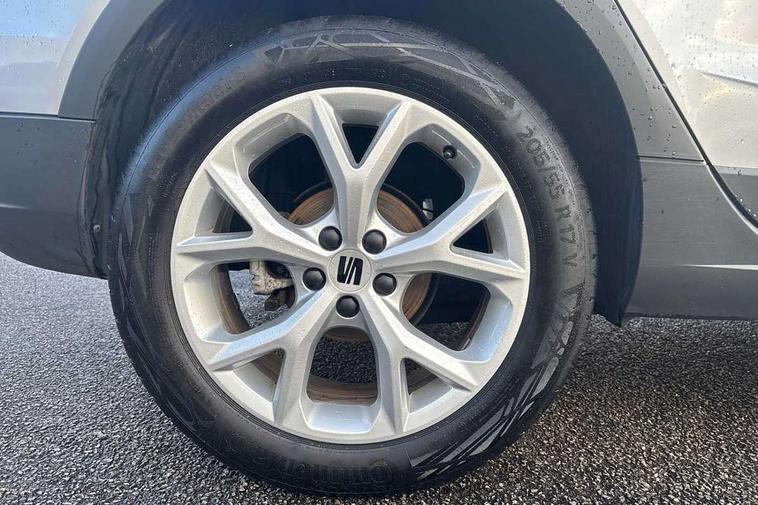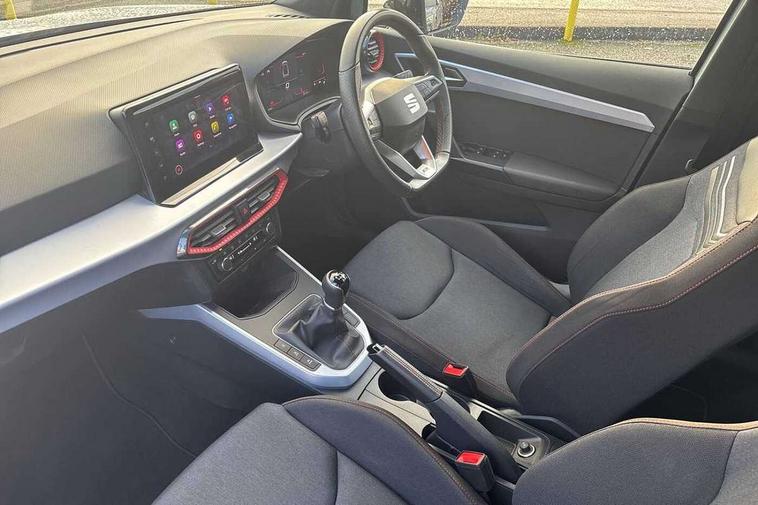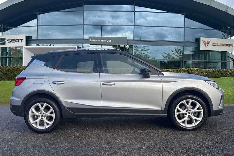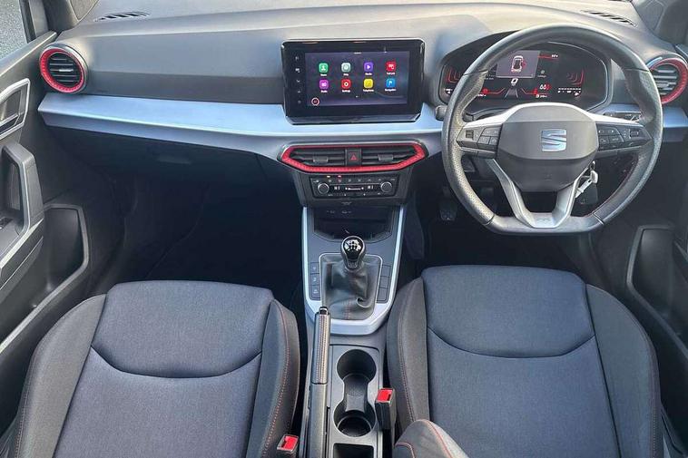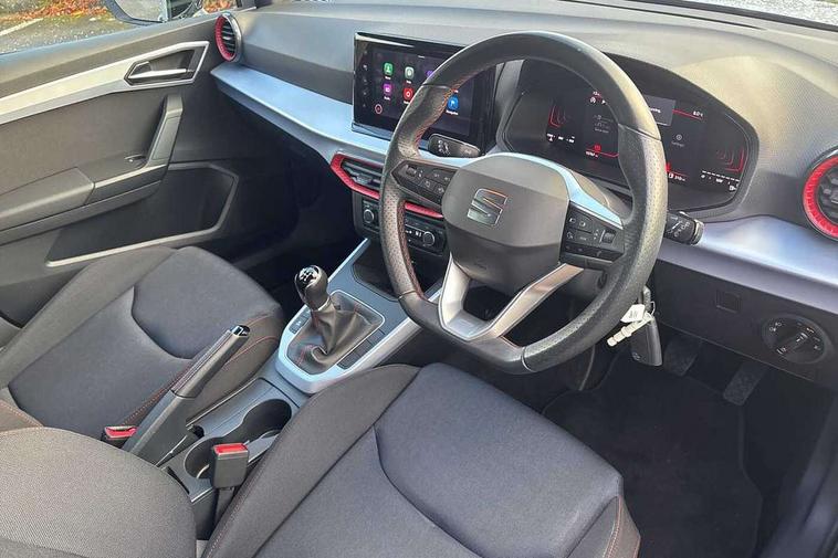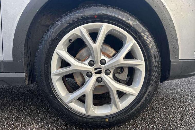 'Lights On' Reminder warning buzzer, 8" Digital cockpit, Digital clock, E-call, Electric speed sensitive power steering, Full Link Smartphone Integration with Mirror Link, Apple Car Play, Google Android Auto with USB Type C cable for Apple and Android compatibility, Lane keeping system, Low fuel warning light, Outside temperature display, Rear parking sensor, RPM counter, Seat connect with safety, service, remote and online, SEAT Drive profile - Four different models normal-sport-eco-individual, steering response, throttle response, Trip computer, Wireless phone charger, 9.2" colour touchscreen with navigation system, voice control and USB port (type c), Bluetooth interface for hands free and audio streaming, DAB digital radio and AM/FM radio, Steering wheel mounted audio controls, Anti theft roof antenna, Auto dimming interior rear view mirror, Automatic activation of hazard warning lights, Body coloured bumpers, Body coloured door handle inserts, Chrome roof rails and window surrounds, Dark tinted rear windows, Electric front/rear windows, Electrically adjustable, heated and folding door mirrors, Front fog lights with cornering function and rear fog light, FULL LED automatic headlights with dynamic headlight range control, coming and leaving home, LED daytime running lights, LED rear tail lights and licence plate lights, Protective side mouldings, Rain sensing wipers, Rear side wing doors, Rear spoiler, Rear window wash/wipe, Roof colour door mirrors, Third brake light, Twin exhaust pipe styling hidden exhaust pipe, Visible VIN plate, Windshield wiper with intermittent control and potentiometer, 2 cupholders, 3 seat bench in 2nd row, 60/40 split folding rear seat, Aircare filter, Black interior roof, Cloth upholstery, Double boot floor, Driver sunvisor with covered mirror + card holder, Dual zone climate control, Front courtesy light with front reading lights, Front sport seats, Gear shift indicator, Height adjustable front seats, Height/reach adjustable steering column, Illuminated boot, Instrument lighting with brightness control, Interior ambient lighting, Interior light in footwell, central console and door panel, ISOFIX points in outer rear seats with top tether anchorage points, Passenger sunvisor with vanity mirror, Perforated flat bottomed leather steering wheel/gear knob/handbrake with red stitching and FR logo, Single front passenger seat, Two front and three rear height adjustable headrests, Interior chrome pack - Arona, 3 point seatbelts on all rear seats, ABS, Active front headrests, Child locks on rear doors, Driver and front passenger airbags with front passenger airbag de activation, front side and curtain airbags, Electronic stability control, Emergency Brake Assist (EBA) and front assist, Front and rear seatbelt reminder, Hill hold control, Multi-Collision braking, Tiredness recognition system, Traction control, Tyre pressure monitoring system, Alarm with back-up horn, Electronic engine immobiliser, Locking wheel bolts, Remote central locking + deadlocks, Tow away protection, Titan black dashboard, 17" Dynamic alloy wheels,