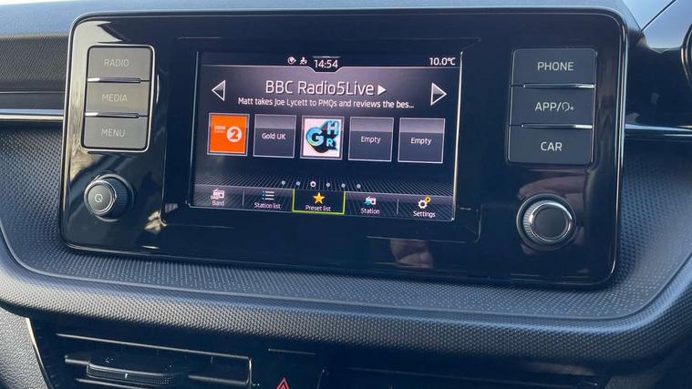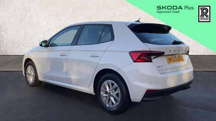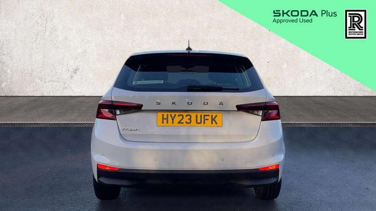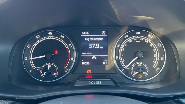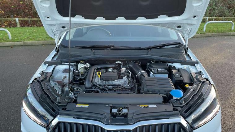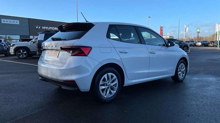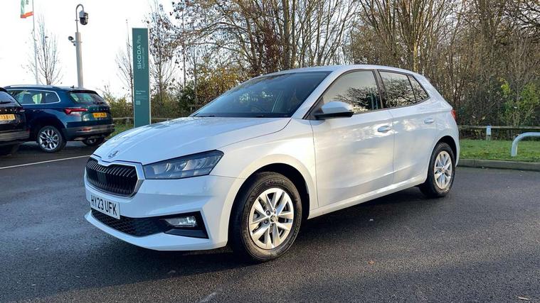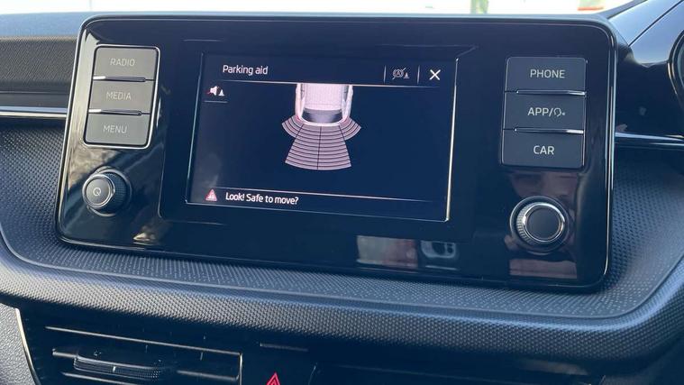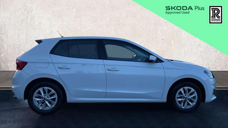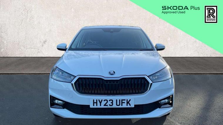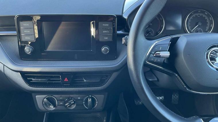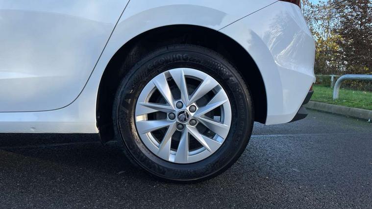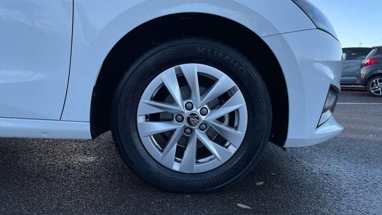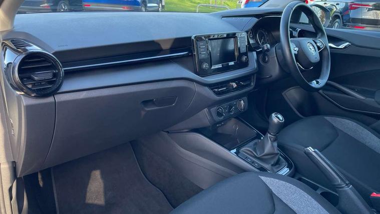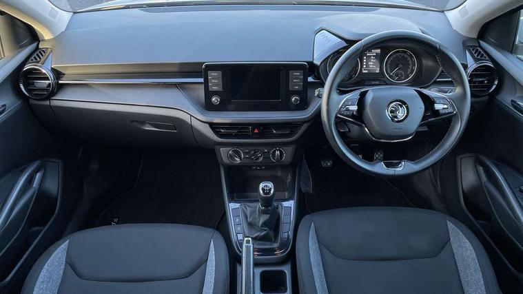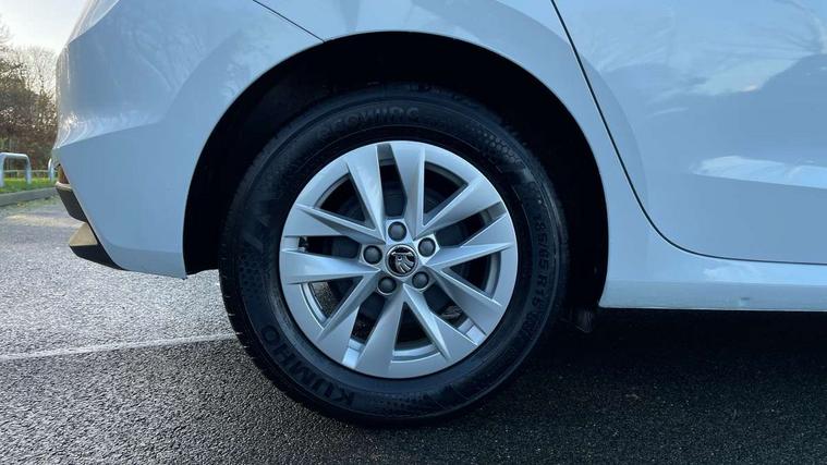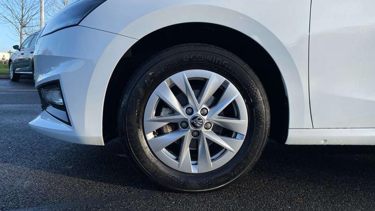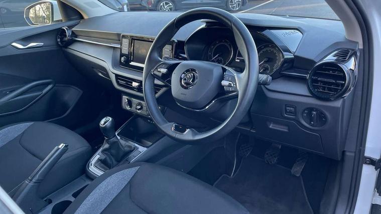 Bluetooth connection, Driver alert system - DAS, Electromechanical power steering, Exterior temperature gauge, Lane assist including road edge detection, Multifunction trip computer in black and white, Service interval indicator, SmartLink, Speed limiter, 2x USB-C in the front (for data transmission and charging), 4 speakers in front, Auxiliary socket for external MP3 player, DAB digital radio reception, Radio Swing with 6.5" colour display, Basic LED Headlights, Basic rear light, Body colour door mirrors, Body coloured bumpers, Dimming rear view mirror with black frame, Door mirror integrated indicators, Electrically adjustable and heated door mirrors, Electrically adjustable front windows with function auto up/down, Front fog lights, Front window wiper intermittent control, Headlight range control - Automatic, Ice scraper in fuel cap, LED daytime running lights with coming and leaving home feature, Mechanical adjustable rear windows, Rain sensor, Rear LED fog light, Rear side wing doors, Rear window wiper with washing nozzles, Roof mounted spoiler, SKODA tailgate lettering in chrome, Third brake light, 2 reading lights in front and 2 reading lights in rear, 2 spoke leather multifunction steering wheel, 3 rear headrests, Backrest split and folding, Central console with fixed cup holder and storage box, Chrome handbrake release button, Fabric upholstery, Gearshift knob/handle in leather, Grain satin black interior door handles, Hand brake lever handle in leather, Height adjustable front headrests, Height adjustable front seats, Height adjustable steering wheel, ISOFIX and TopTether anchorage points to the outer rear seats, ISOFIX and TopTether on the front passenger seat, Luggage compartment lighting, Manual air conditioning, Manually adjustable lumbar support in front seats, Pollen filter, Rear seat bench unsplit, Single front passenger seat, Storm grey headlining, Sun visors with mirror and airbag label on passenger side, Ticket holder, 3-point height adjustable front seats belts with pretensioner and force limiter, Automatic warning lights in case of crash, Driver and passengers airbag with switch off function, e-Call+, ESC including ABS, MSR, ASR, EDS, HBA and XDS, Front and rear seat belt warning, FRONT ASSIST (AEB City and AEB Inter Urban), Front side airbags, Head airbags, One tone horn, Pedestrian protection, Three rear 3-points safety seat belts with pretensioner and force limiter including stop function for outer rear seat belts, Tyre pressure monitoring system, Anti-theft alarm system including immobiliser, interior monitoring, backup horn, and towing protection, Central locking with radio remote control, interior controls, SAFE function and 2 foldable keys, Black painted air vents, Glossy black decorative trim, Grain satin black central console cover, Grain satin black lower decorative trim, Satin black door and side trim panel in front, Anti-theft wheel bolts protection, Super-low rolling resistance tyres,