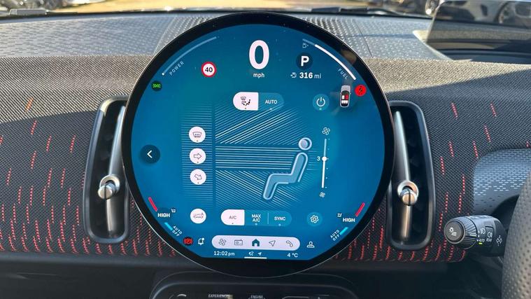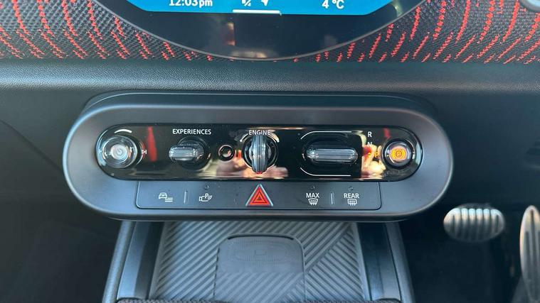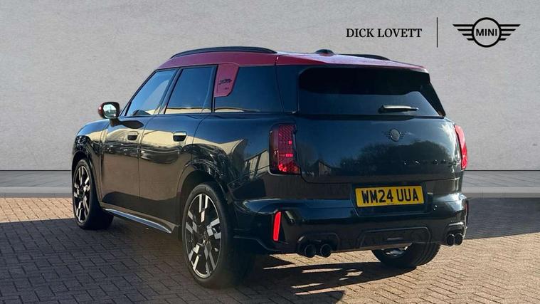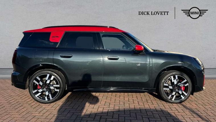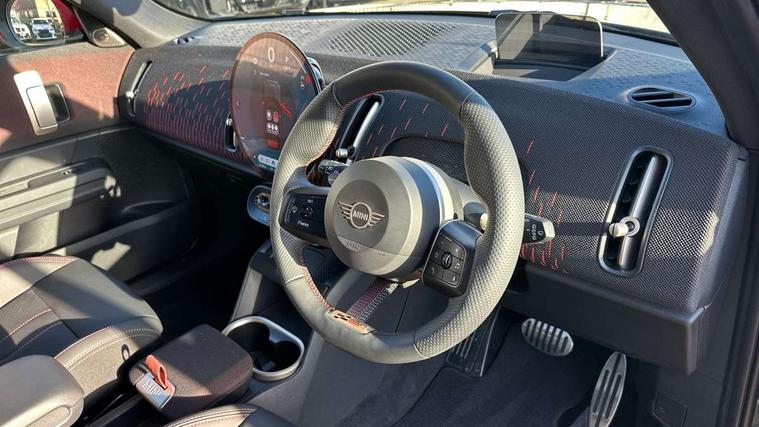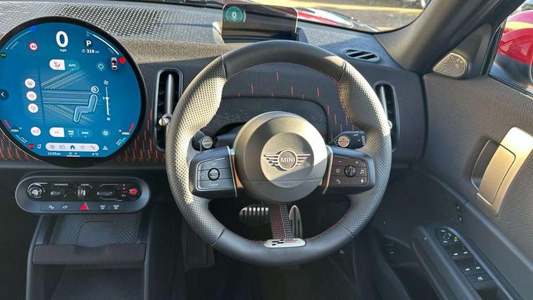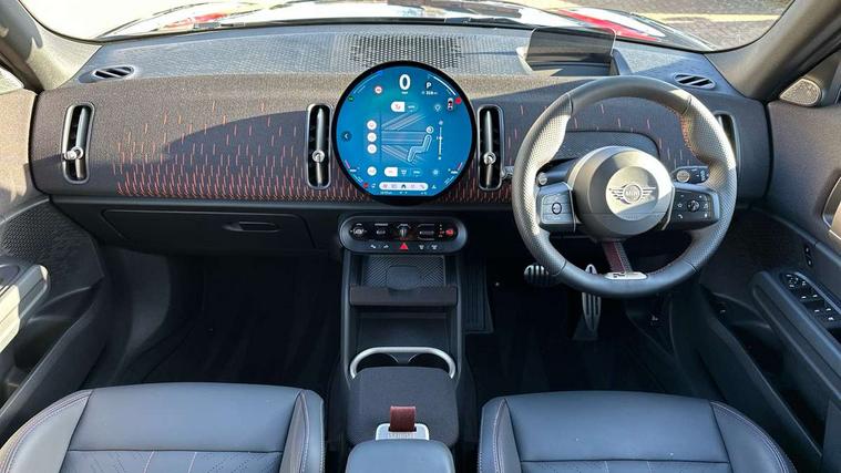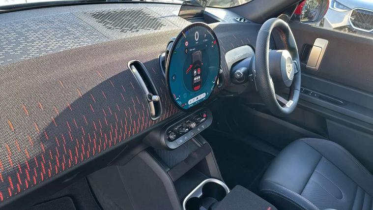 Bluetooth connection, Circular OLED Screen, Compatible mobile phone bluetooth with audio streaming, Cruise Control (DCC), Digital dashboard display, Driving Assistant Plus Preparation, E-call, Electro-mechanical speed dependant steering assistance, MINI Experience Modes, MINI Head up display, Mini navigation system, MINI TeleServices, Parking assistant in camera and ultrasound based assistance system, rear view camera, parking aid and distance control, Double clutch sports transmission, Quad exhaust system, DAB Digital radio, Harman Kardon surround sound system, Personal eSim, Auto tailgate, Electric adjustable heated door mirrors, Front and rear apron, Front and rear electric windows, Heated rear window, High beam assistant, High gloss hexagonal patterned grille surround, Interior rear-view mirror with automatic anti-dazzle function, LED daytime running lights, LED headlights with extended contents including Adaptable light signatures, LED rear lights, LED third brake light, Rain sensor with auto headlights, Rear roof spoiler with airblades, Rear side wing doors, Rear window wiper, Roof rails, 3 seat bench in 2nd row, 60/40 split rear bench seat, Anthracite headliner, Auto air conditioning, Driver and front passenger seat heating, Floor mats, Front armrest, Front headrests, Heated steering wheel, Height and length steering column adjustment, JCW Front sports seats, Lidded storage box in Black/Red knit, Luggage compartment separating net, Perforated Vescin steering wheel, Rear headrests, Seat adjustment for rear seats, Single front passenger seat, Sunvisors with vanity mirrors, Vescin/Cloth upholstery, Wireless charging tray, Interior and exterior mirror package - Mini Countryman, 3x3 point rear seat belts, 6 Airbags - front, side, head and seat belt tensioners, ABS, DSC - Dynamic Stability Control, Electronic handbrake, Electronic Stability Programme (ESP), Front ISOFIX (iSize), Hill descent control, Hill hold assist, Hill start assist, JCW logo in brake calipers, JCW Sport brakes with Chilli Red calipers, Manual rear child locks, Traction control, Tyre pressure monitoring system, Warning triangle, Alarm system with tilt sensor, monitoring doors, bonnet interior and tailgate, Auto drive away locking, Comfort access system, Deadlocking function, Electronic vehicle immobiliser, Locking wheel bolts, Remote control locking, Start/stop toggle with keyless go, JCW Black/Red dashboard knit, 19" JCW Runway Spoke Black alloy wheels, MINI Mobility Kit,