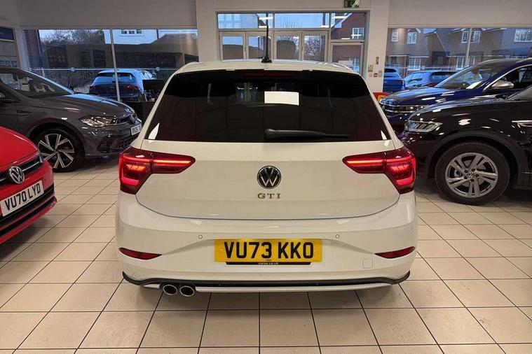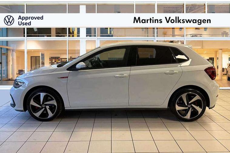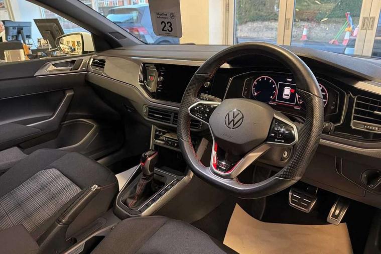 Adaptive cruise control with follow-to-stop and speed limiter, Bluetooth mobile phone interface, Digital Cockpit Pro with 10.25" Display, Driver alert system, Dynamic road sign display, Eco mode, Emergency call service, Power assisted speed sensitive steering, Preparation for We connect and We connect plus, Speedo and rev counter, electronic odometer, trip, service interval display and fuel gauge, Travel Assist - Lane keeping system and traffic jam assist, Travel assist including emergency assist, Trip computer, Warning signal and warning light for front and rear seatbelts not fastened, Washer fluid level indicator, Wireless app connect, Adaptive chassis control, Front wheel drive, Heavy duty rear axle, Rear shock absorpion sports version, Sports select suspension lowered by 15mm, Start-stop system with battery regeneration (recuperation - energy recovery during braking), DAB Digital radio, Diversity antenna for FM reception, Front and rear 6 speakers, Body colour bumpers, Body colour door handles, Electric front windows, Front scuff plates in aluminium with GTI logo, Heat insulating darkened glass in side and rear windows, Heat insulating glass windscreen, Power folding adjustable/heated exterior mirrors and front passenger exterior mirror lowering function, Rain sensor, Rear electric windows, Rear fog light, Rear side wing doors, Rear windscreen washer and wiper with interval delay, Sport bumpers with air intakes with honeycomb structure, Third brake light, Twin chrome exhaust tailpipes, 12V power socket in centre console, 2 USB-C ports in the front, 2 USB-C charging sockets on the center console in the rear, 3 rear head restraints, 60/40 split folding rear seat and rear seat bench not split, Air care climatronic air conditoning system with active combination filter and 2-zone temperature control, Black roof lining, Chrome plated radiator grille inserts, air vent surrounds and light switch surrounds, Door and side trim panel, Driver and front passenger seat height adjustment, Driver/passenger sunvisors with illuminated vanity mirrors, Front + rear carpet mats in recycled material, Front centre armrest, Front footwell illumination, Front seat backrest storage pockets, GTI sports gearshift knob in aluminium leather, Handbrake lever handle in leather, Headliner in recycled material, Isofix child seat preparation easy-fit (for two outer rear seats, and front passenger seat) compatible with I-size, LED interior light with switch off delay and dimmer, 2 reading lights front and rear, Luggage compartment cover, Luggage compartment floor, Luggage compartment lighting, Single front passenger seat, Stainless steel pedals, Standard pedal cluster, Three spoke leather wrapped multifunction sports steering wheel with shifting paddles, IQ LED matrix headlights pack - Polo, Light and sight pack - Polo GTI, 3 point height adj front seatbelts + pretensioners, 3x3 point rear seatbelts, ABS, Driver and front passenger airbag with front passenger airbag deactivation, Drivers and front passengers safety optimised head restraints, ESC (Electronic stability control) + EDL (Electronic Differntial lock) and ASR (Traction control), Extended and predictive pedestrian/ cyclist protection, Front and rear disc brakes with red brake calipers, Front curtain and side airbags with center airbag, Hill hold control, Manual child lock in rear doors, Two tone horn, Tyre pressure loss indicator, Alarm with interior protection, Anti-theft alarm system with interior monitoring, backup horn, and towing protection, Anti-theft wheel bolts, Electronic engine immobiliser, Chrome applications on rotary light, mirror adjustment, window regulator switches, outlet with frame in black, Low rolling resistance tyres,