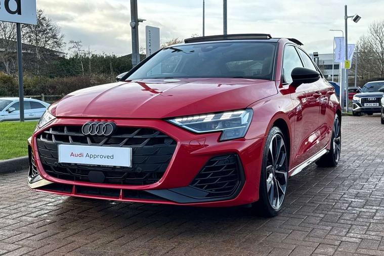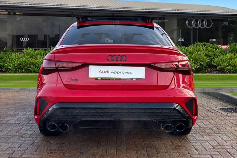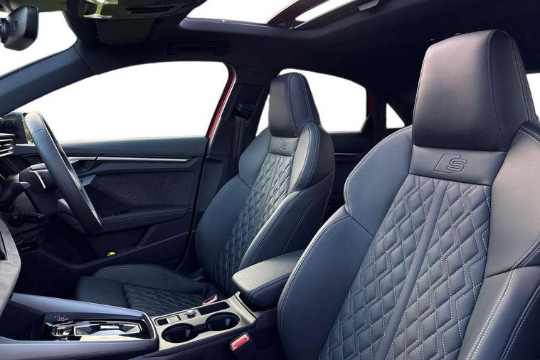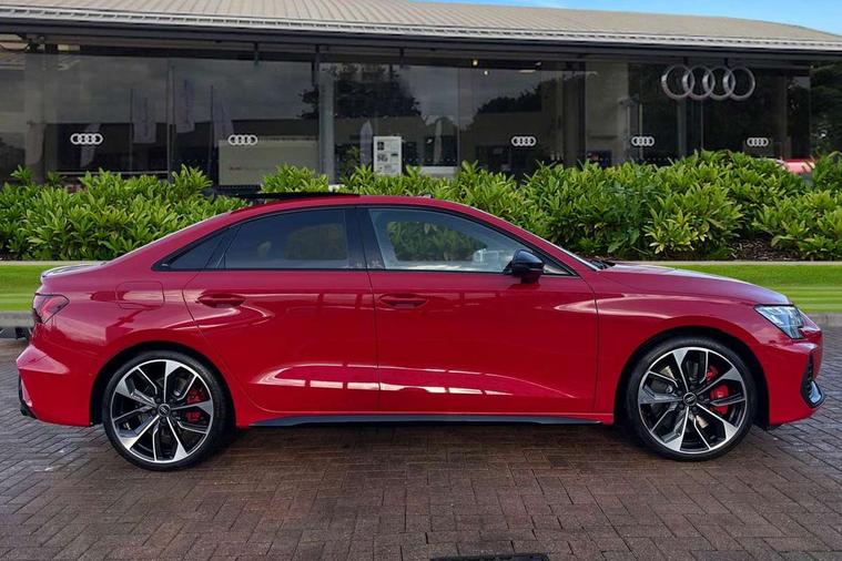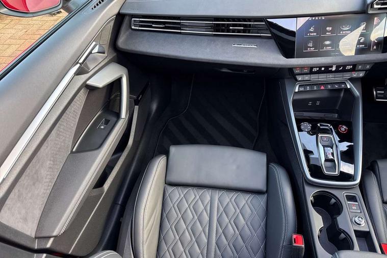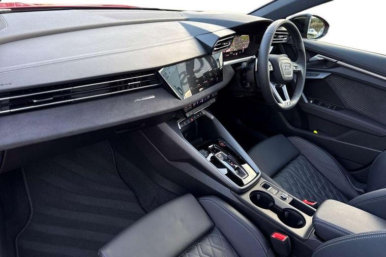 Adjustable speed limiter, Audi drive select, Audi smartphone interface with app store includes wireless Apple carplay, Android auto and Amazon alexa integration, Audi virtual cockpit plus - 12.3" full HD resolution dynamic digital instrument cluster, Automatic start/stop system with recuperation, Bluetooth interface, Camera based traffic sign recognition, Collision avoidance assistant, Distraction and Fatigue warning, e-Call (emergency call), Emergency assist, Lane departure warning system, MMI Navigation Plus with high resolution 10.1" colour touch screen display, Park Assist with parking system Plus, Progressive steering, Service indicator, Trip computer, Voice control system with natural language interaction, quattro permanent all-wheel drive with torque splitter, S sport suspension with spring damper adjustment and lowering by 15mm, Audi Phonebox light with wireless charging, DAB Digital radio, USB ports with charging function in the rear, All weather light, Anthracite grey Audi rings (front and rear), Audi Beam uses LEDs to project the rhombus S logo onto the ground as you exit your S3, Auto dimming frameless rear view mirror, Automatic dynamic range control, Black accents front and rear bumpers including air inlets, Black accents in front grille and frame, Black accents in window trims, Dipped beam, main beam, position light and turning light, Electrically adjustable/heated/folding/auto dimming door mirrors with integrated LED indications + kerb view function for passenger side, Exterior model badging, Front electric windows, Headlight washers, Heat insulating glass windscreen, Illuminated door sills with aluminium inserts at the front with S logo, Intersection light, LED 3rd brake light, LED brake lights, LED daytime running x3, LED headlights with LED rear lights and dynamic rear indicators, LED rear number plate lights, LED reverse light, LED tail lights, Light and rain sensors, Manoeuvring light, Motorway light, Privacy glass - dark tinted rear window, rear door and side windows, Rear boot, Rear diffuser and grill in grained matt black with inlay in dark liquid chrome, Rear electric windows, Rear side wing doors, S grille, S3 front bumper with S specific air intake grilles, Static cornering light, 12V socket and storage compartment in front centre console, 3 seat bench in 2nd row, 3 spoke flat bottomed leather multifunction sport steering wheel with gear shift paddles, 3-zone deluxe automatic air conditioning, 4 way electrically adjustable lumbar support for driver and front passenger, 40/20/40 split folding rear seat bench, Black cloth headlining, Black front and rear floor mats, Fine Nappa leather upholstery with front sports seats S embossed logo, Front and rear centre armrest in artificial leather with contrasting stitching on armrests and instrument panel, Front and rear headrests, Heated front seats, Height and reach adjustable steering wheel, Manual boot compartment lid, Manually adjustable front seats, Rear centre armrest with cupholder, S badging on the steering wheel, Seat side bolsters, Single front passenger seat, Stainless steel pedals and front footrest in black, Aluminium interior elements pack - A3, Storage package - A3 Saloon, Technology package - A3, 3x3 point rear seat belts, Driver and front passenger airbag with passenger airbag deactivation, Electronic Stabilisation Control (ESC) including ABS, ASR and EDL, First aid kit with warning triangle and 2 safety vests, Front side airbags with head airbags and interaction airbag, Hill hold assist, Pre-sense front with pedestrian and cyclist detection, Seatbelt monitoring, Tyre pressure loss indicator, Anti theft alarm, Anti-theft wheel bolts, Electronically operated child locks, Immobiliser, Remote central locking with safelock, Black dashboard, Tyre repair kit,
