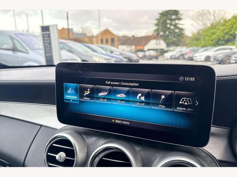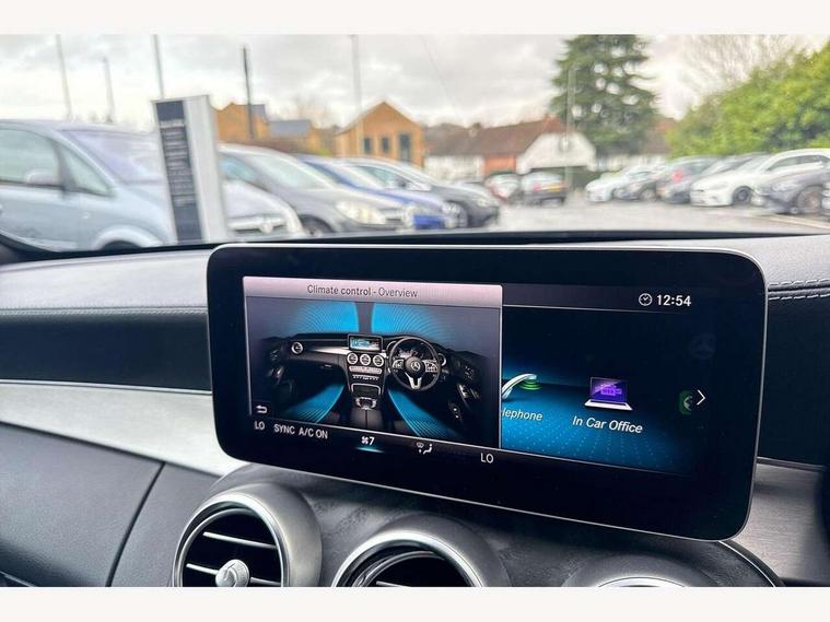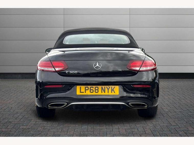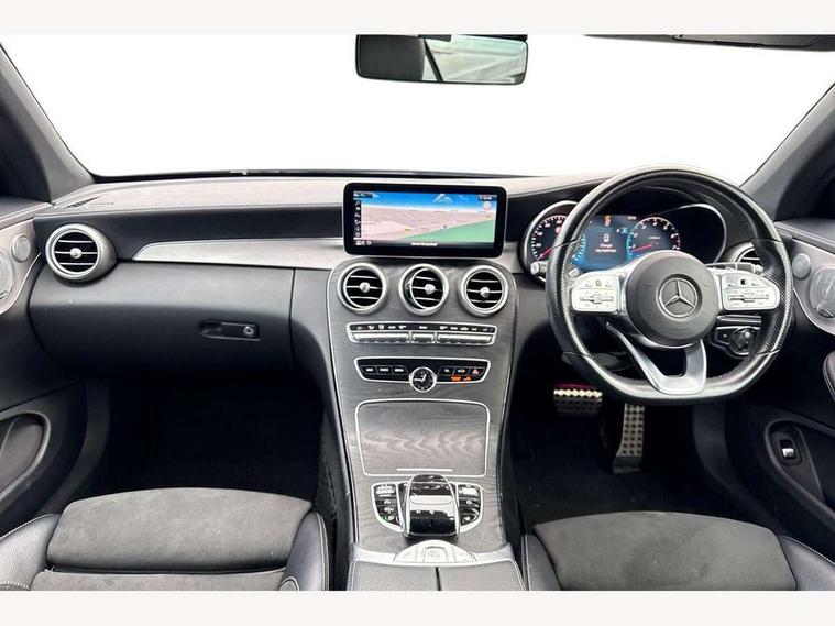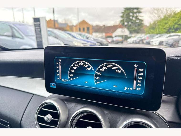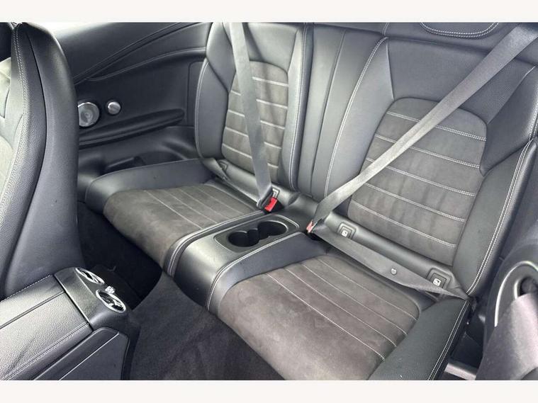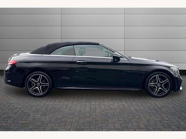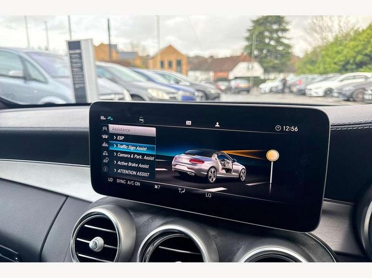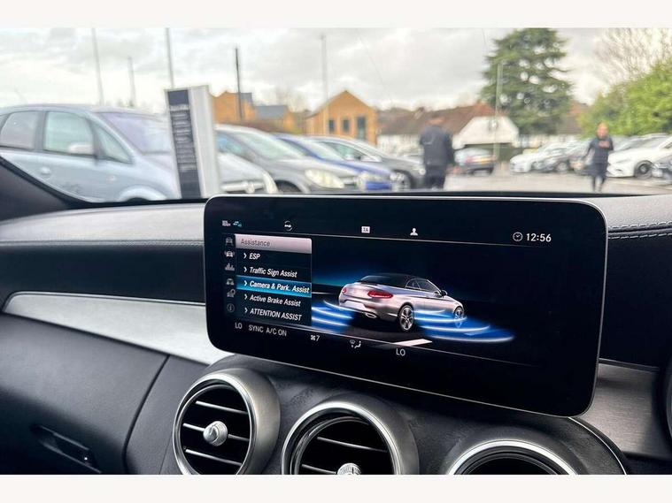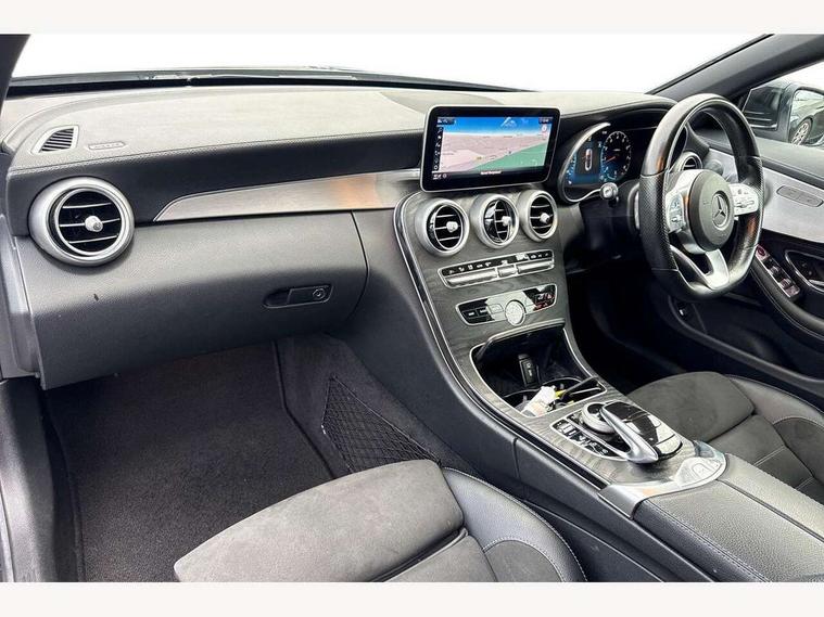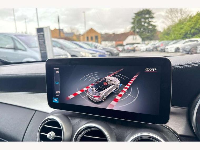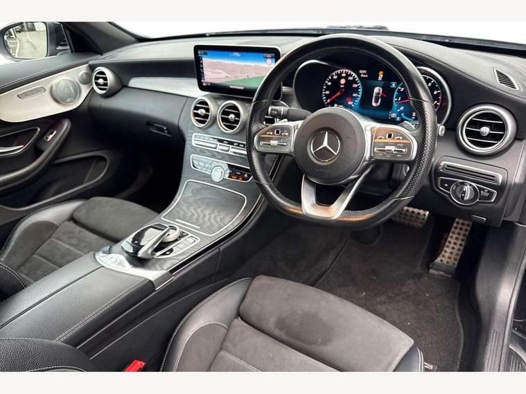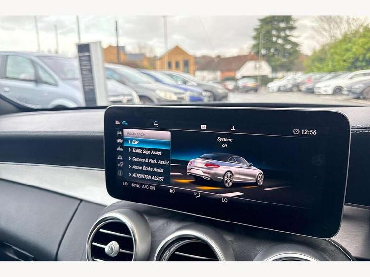 12.3" Active TFT crystal driver's instrument display, Active park assist with parktronic system, Attention assist, Bluetooth interface for hands free telephone, Collision prevention assist plus, Comand Online HDD Nav with media interface, radio/CD/DVD/MP3, 10.25 screen, linguatronic voice control, DYNAMIC SELECT with a choice of driving modes (ECO, Comfort, Sport, Sport+ and Individual), Mercedes connect me with remote online, Multi function trip computer, Outside temperature gauge, Remote boot release, Service indicator (ASSYST), Smartphone integration with Apple CarPlay and Android auto, Speed sensitive steering, Stop/start system, Surround camera system, Wireless charging, Petrol Particulate Filter, Sport exhaust system, 2 USB ports, Burmester surround sound system, DAB digital radio module, Mercedes Audio 20 radio/single CD, SD card slot, Acoustic soft-top with enhanced climate and noise comfort, Adaptive brake lights, AMG front, rear apron and side skirts, Auto dimming driver's door mirror, Auto dimming rear view mirror, Body coloured bumpers, Body coloured door mirrors, Chrome grille surround, Chrome pins diamond radiator grille with integrated stars, Door sill plates with "Mercedes-Benz" lettering, Electric adjustable/heated/folding door mirrors, Electric windows one touch open/close, Green tinted glass, LED daytime running lights, LED Indicators, LED tail lights, LED third brake light, Multi beam LED headlights, Radio aerial in side window, Rain sensor windscreen wipers, Side windows surround in polished aluminium, Twin exhaust tailpipes x2, Wind deflector, 2 cupholders in front centre console, 2 rear head restraints, 3 spoke flat bottom multi-function leather AMG steering wheel, 40:20:40 split folding rear seats, Airscarf - neck level heating, Ambient lighting, AMG floormats, Artico man-made leather upper dashboard and beltlines with contrast stitching, Auto dual-zone climate control system, Auto Mercedes-Benz child seat recognition sensor, Automatic boot separator, Door courtesy lamps, Electrically adjustable front seats, Front centre armrest with storage compartment, Front footwell illumination, Heated front seats, Height adjustable front seats, Illuminated front/rear door handle recesses, Illuminated glovebox, Isofix rear child seat fastenings, LED reading lights, LED rear reading lights, Sports pedals with stainless steel surfaces and rubber studs, Sports seats with integrated headrests, Steering wheel audio controls, Steering wheel gearshift paddles, Sunvisors with illuminated vanity mirrors, Seat comfort pack - C Class, Stowage space pack - C Class, 2 rear seatbelts, 3 point automatic seatbelts, ABS, Active bonnet, Adaptive brake system, Black seat belts, Brake calipers with Mercedes-Benz lettering + perforated brake discs, Crash sensor, Drivers knee airbag, Drivers pelvis airbag, Dual stage driver/passenger airbags, Electronic parking brake, Electronic stability control, Front and rear window airbags, Front seatbelt pretensioners, Front side airbags, Hill hold control, Hill start assist, Tyre pressure monitoring system, Warning triangle and first aid kit, Alarm system/interior protection/immobiliser, Automatic door locking, Chrome surround electric key, Keyless entry and keyless start, Remote central locking, Tow away protection,