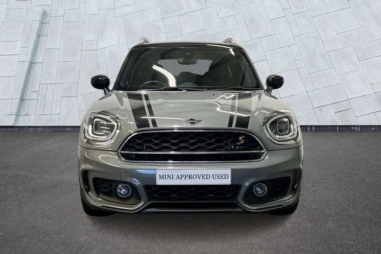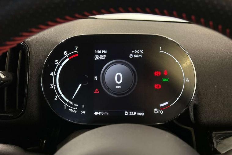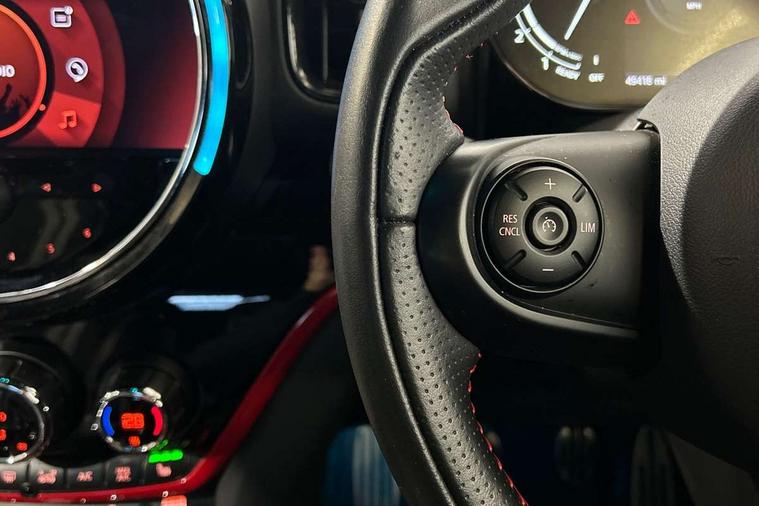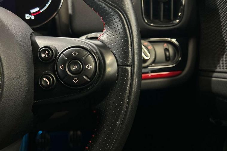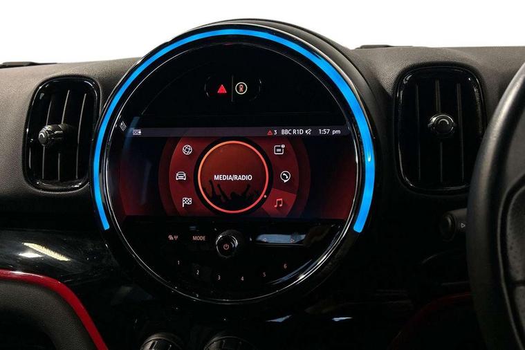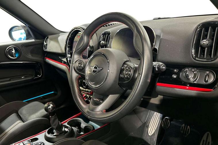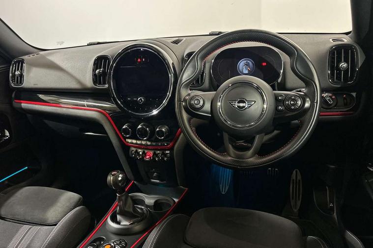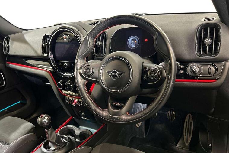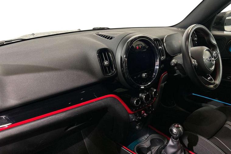 Active Guard incl speed limiting and lane departure functions with auto steering, and front collision warning with brake intervention, Automatic start/stop function with brake energy recuperation, Digital cockpit, Electro-mechanical speed dependant steering assistance, Instrument cluster, MINI Driving Modes - centre toggle switch to control driving setting (sport, mid and green), Mini E-call, MINI TeleServices, On board computer, Rear parking distance control, Double Vanos system, Fully variable valve control, High precision injection, Performance Control, FM tuner and DAB digital radio, Bonnet scoop, Chrome border honeycomb structure radiator grille with S badge, Chrome fuel filler cap, Day time driving lights, Dynamic brake lights, Electric windows, Heated rear window, Heated windscreen washer jets, John Cooper Works - aerodynamic kit (front and rear apron, spoiler), front and rear sport bumpers and part-painted side sills with door sill finishers, John Cooper Works Logo, John Cooper Works rear spoiler, LED fog lights, LED Headlights, Metal door sill strips with Cooper S imprint, Model logo, Model logo on Tailgate, Rain sensor with auto headlights, Rear fog lights, Rear window wiper, Side scuttle panel with integrated indicator, Split rear doors, Sun/heat protection glass, Twin exhaust tailpipe, White indicator lenses, 12V Accessory socket in centre console, 360L luggage compartment capacity, 4 lashing eyes in luggage compartment, 40:20:40 split folding rear seats, Anthracite headlining with grab handles and clothes hooks, Chrome interior highlights, Colour line - Carbon black, Cupholders, English handbook, Front headrests, Glove compartment, Height and length steering column adjustment, Interior lighting with 12 basic colours selectable via toggle switch in roof, Isofix rear child seat preparation, John Cooper Works perforated leather steering wheel with contrast stitching in chilli red and John Cooper Works logo, Leather gearshift lever and handbrake gaiters, LED reading lights, vanity mirror lights, front foot well light and spotlight on front seats, Manual air conditioning, Multifunction steering wheel, Passenger seat height adjuster, Rear headrests, Storage compartments in doors, Sunvisors with vanity mirrors, Excitement pack - Countryman, Navigation pack - Countryman, 2 tone horn, 3 point seatbelts on all seats, 6 Airbags - front, side, head and seat belt tensioners, Anti-lock braking system (ABS), DSC - Dynamic Stability Control, Electronic handbrake, Front and rear disc brakes, Hill start assist, Tyre pressure monitoring system, Alarm system with tilt sensor, monitoring doors, bonnet interior and tailgate, Auto drive away locking, Deadlocking function, Electronic vehicle immobiliser, Locking wheel bolts, Start/stop toggle with keyless go, Piano black JCW interior trim, Tool kit,
