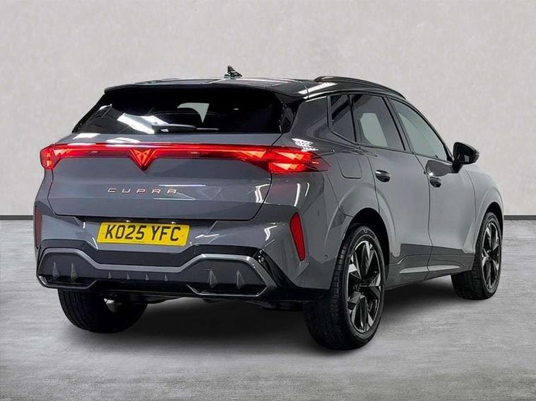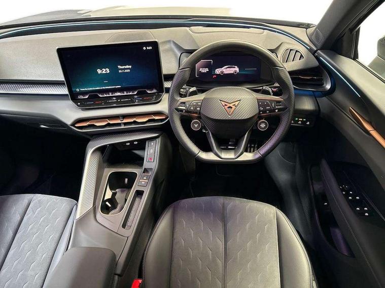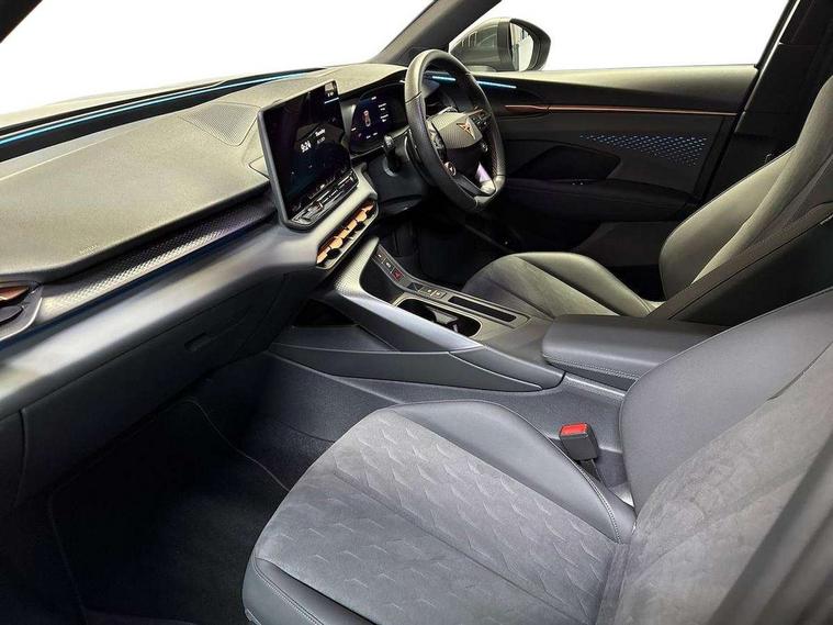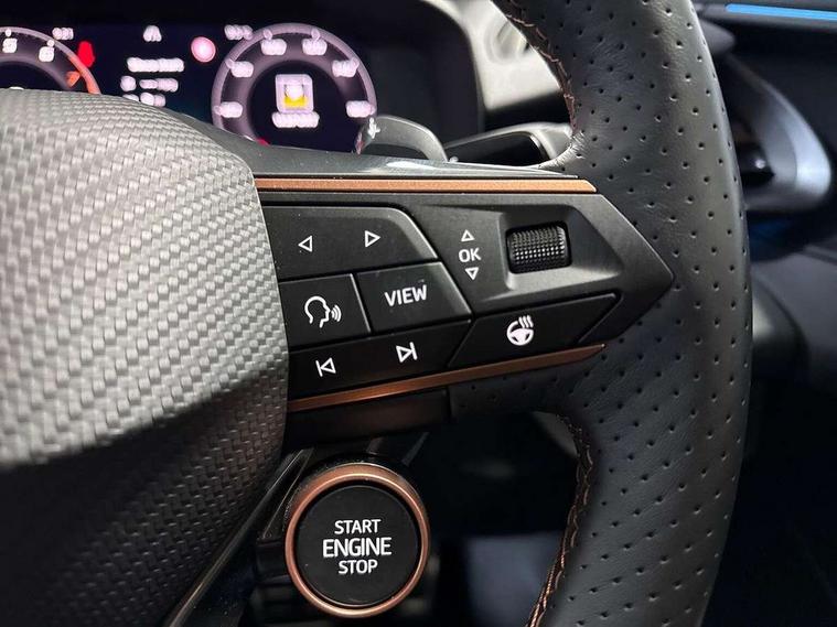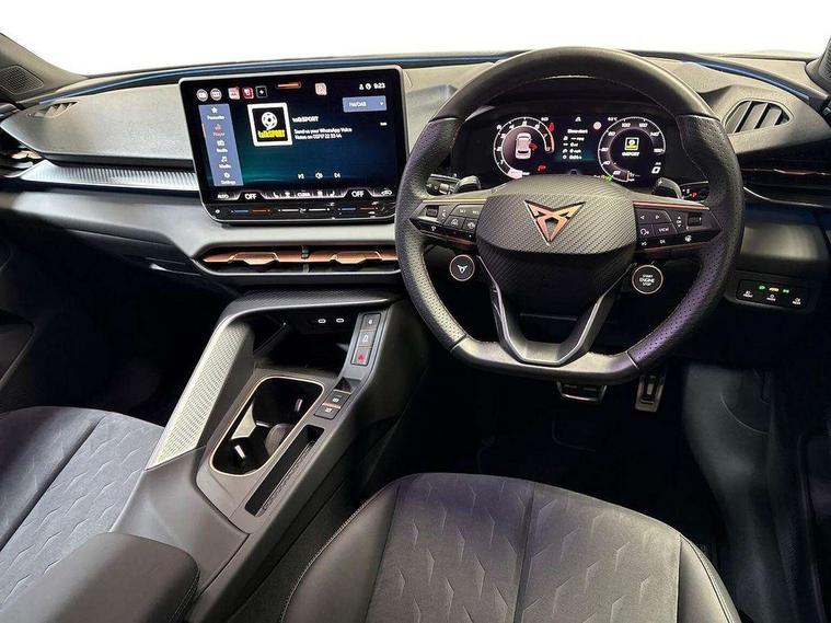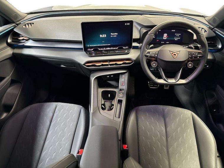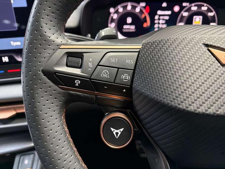 10.25" digital cockpit and configurable dashboard, Adaptive cruise control with follow-to-stop and speed limiter, Advanced driver alert system, Advanced lane assist with semi-automatic vehicle control in a medical emergency and traffic jam assist, Driving profile selection and conventional shock absorber, Dynamic road sign display, E-call, Electric tailgate with virtual pedal, Emergency steering support with turn assist, Four x USB Type C ports (2 in front and 2 in rear), Front and rear parking sensors, Front assist (Forward collision warning with automatic braking) with multifunction camera and front cross traffic assist, Head up Display, Intelligent park assist, Media system with Nav - 12.9" touch display, voice control, full link phone (wired/wireless), DAB and Steering wheel mounted controls, Rear traffic assist, Side and exit assist, Speed sensitive power steering, Start/stop system with regenerative braking, Top view camera (front camera, rear camera, 2 side cameras), Wireless phone charger, Auto dimming rear view mirror, Black roof rails, CUPRA 3D rear lights with ceremony & swiping indicator and illuminated logo, Dark tinted rear windows, Daytime running lights with automatic headlight control and Coming and Leaving home function, Door mirrors with memory function and lowing function on passenger mirror, Dynamic headlight range control, Electric front/rear windows, Electrically adjustable, heated and folding door mirrors, Front fog lamps with cornering function, Heat reflecting windscreen, High beam assist, LED headlamps with signature "CUPRA LED", Rain sensing wipers, Rear fog light on one side, back up light on both sides, Rear side wing doors, Rear wash/wipe, Third brake light, Welcome lights (within exterior mirror housing), 3 seat bench in 2nd row, Black roof lining, Cupra sports pedals, Dinamica cloth upholstery, Driver seat memory function, Electrically adjustable front seats including lumbar support, Front and rear head restraints, Front and rear reading lights X 4, Front centre armrest, Heated front seats, Heated leather wrapped multi function sports steering wheel with tiptronic, Illuminated interior front door sills, Isofix, Operating voltage 12V, Single front passenger seat, Smart wraparound interior lighting, Sunvisors with illuminated mirror, Three zone climate control with control panel in rear, Unsplit rear seat bench, split folding backrest, with centre armrest, Variable luggage/load compartment floor, 3 point seatbelts in front with pretensioner and electric height adjustment, 3 point seatbelts on all rear seats, Brake control system - ESC and brake booster, Child proof door locks, Driver and front passenger airbags, Electronic parking brake, Front and rear disc brakes, Front interaction airbag, Front passenger airbag deactivation switch, Front side airbags with curtain airbags, Pre-crash front and rear seat belt tensioner, window closure and hazard lights, Tyre pressure monitoring system, Visual and acoustic seat belt reminder, electric contact in front and rear, Anti theft alarm, Keyless locking and starting system with keyless access, Locking wheel bolts, Black decorative trims, Chrome interior detailing, 19" Spectrum exclusive machine alloy wheels, Tool kit,