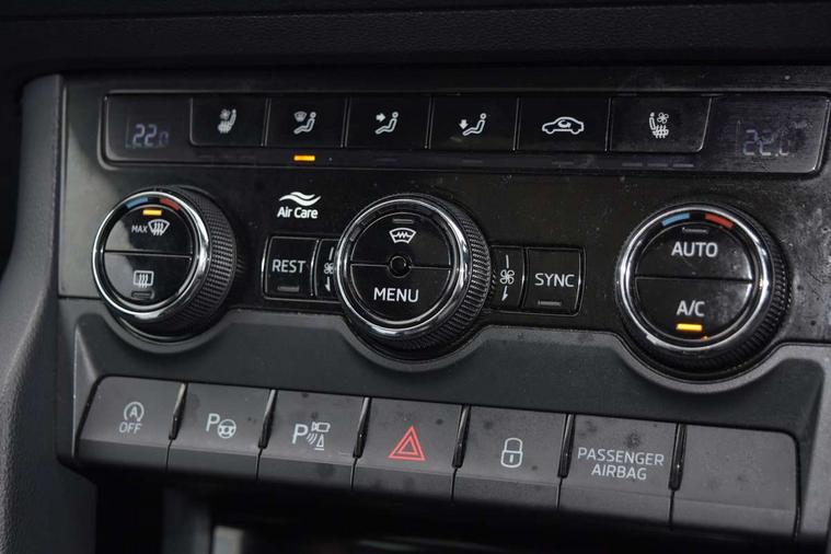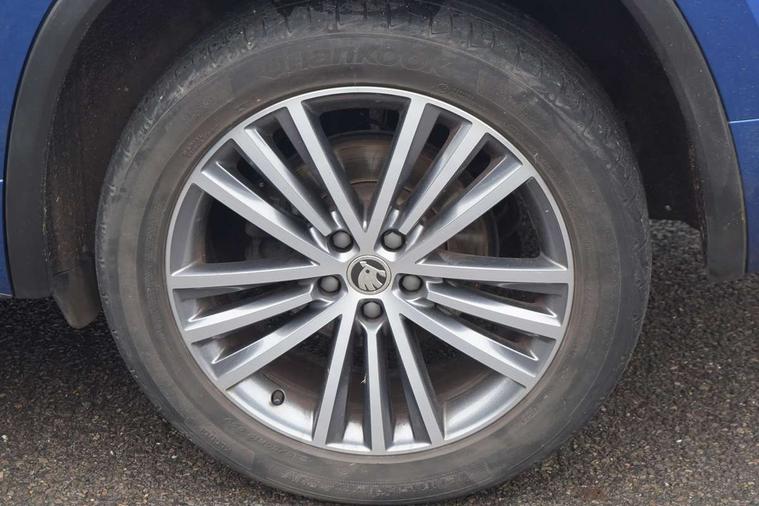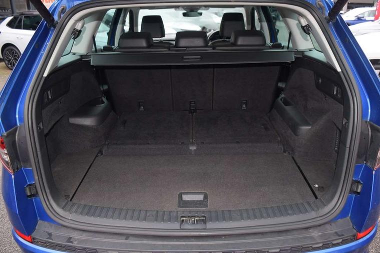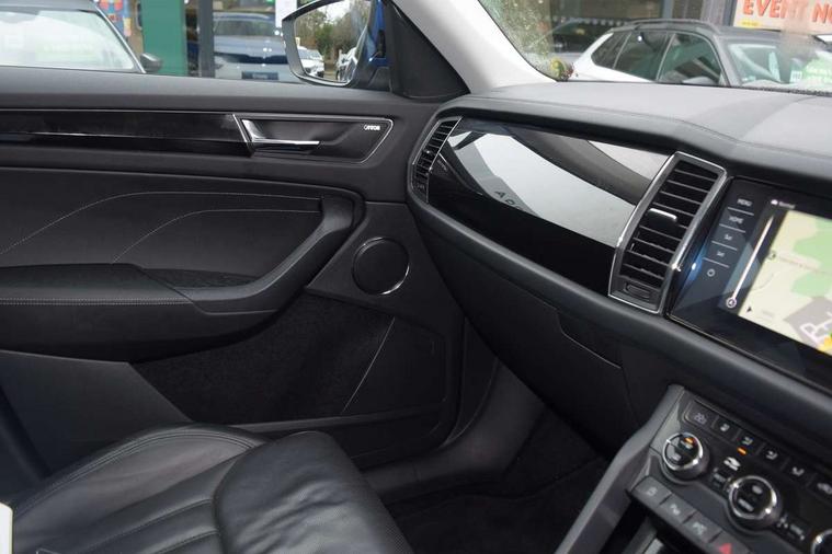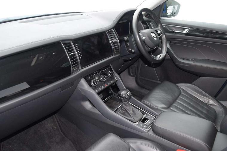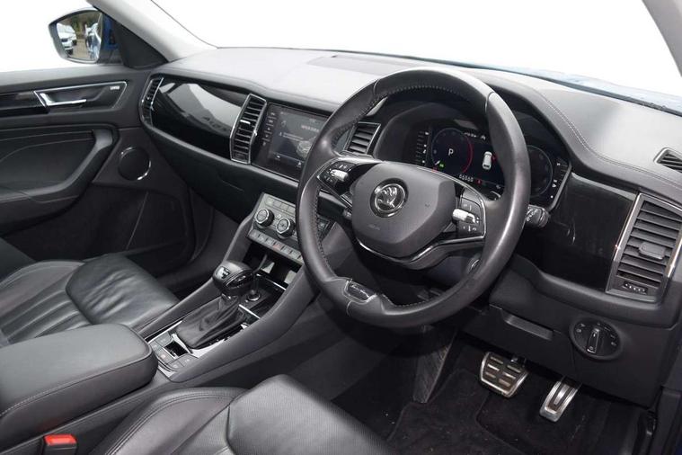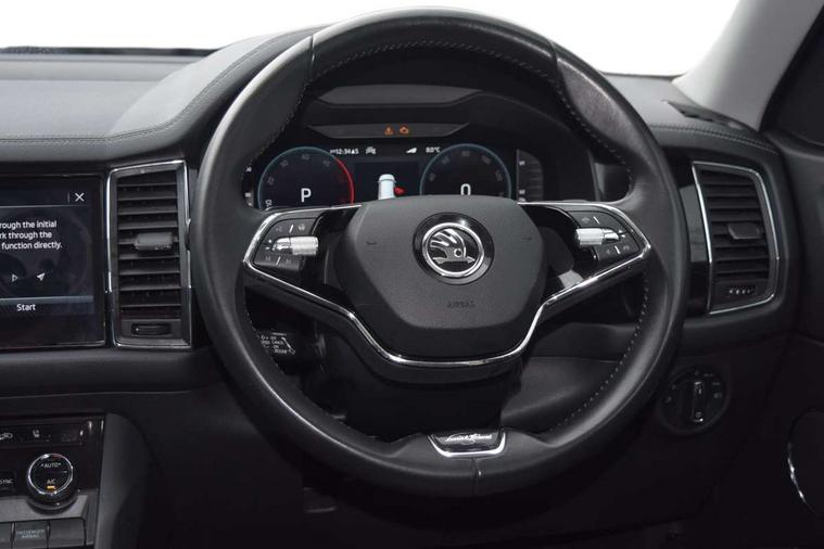 Area view, Blind spot detection system, Bluetooth system, Columbus satellite navigation with 9.2" touchscreen, integrated Wi-Fi, web radio, Digital voice enhancement, E-call, ECO Stop/start function, Exterior temperature indicator, Progressive steering, Smartlink wireless for apple carplay and wired for android auto, Speed limiter, Tailgate unlocking from outside, USB C Port x 2 in front centre console, Virtual Cockpit - 10.25" digital display, Wireless charging, Canton sound system, DAB Digital radio, Aero front windscreen wipers with intermittent function, Aero rear window wiper, Auto dimming rear view mirror, Black wheel arch surrounds, Body colour bumpers, Body colour door mirrors and handles, Body colour door panels, Chrome front grille, Chrome roof rails with chrome window surround, Electric adjustable/heated/folding door mirrors, driver side auto dimming with boarding sports and memory function, Electric front and rear windows, Extended rear spoiler with finlets in gloss black, Front fog lights, Full LED matrix headlights with AFS (adaptive front light system), cornering function and AWL (all weather lighting system), Headlight washers, Heated rear window, Invisible tailpipe, L&K front and rear bumpers including lower rear chrome strip, LED daytime running lights, LED rear fog light, LED third brake light in rear spoiler, Light assistant (coming/leaving home/tunnel light), Off-road style lower front bumper element, Panoramic sunroof, Privacy glass, Rain and light sensors, Rear LED lights (high functionality) with welcome effect and dynamic indicators, Rear side wing doors, Safety reflectors on front and rear doors, Window control switches with black trim, Without engine designation, 12V socket in boot, 2 rails with 2 hooks, 2 seat bench in 3rd row, 3 seat bench in 2nd row, 4 foldable roof handles with rear coat hooks, 60:40 foldable rear seat with sliding adjustment and backrest angle adjustment, Aluminium pedals, Bottle holders in door panel in the 1.5 litre front and 1 litre rear, Cargo storage compartments, Chrome headlight control button, Chrome interior door handles, Coat hooks on B pillar, Covered storage compartment on driver side, Front centre armrest with storage compartment, cup holder and 12V socket, Front courtesy lights, Gear shift lever with chrome frame and black gloss insert, Grey stitching in front and rear armrests and door armrests + door inserts, Height adjustable front headrests, Illuminated and cooled glovebox, Illuminated luggage compartment, Isofix child seat fittings in outer rear seats with top tether, Manually adjustable steering column, Net programme in boot (1x horizontal Net, 2x vertical Nets), Overhead glasses storage compartment, Pollen filter, Rear centre armrest with cupholders, Single front passenger seat, Sliding trunk cover, Small Bags on the inner sides of the front backrests, Sunvisors with illuminated vanity mirrors, Three rear height adjustable headrests, Ticket holder on A Pillar, Umbrella in door panel, Variable boot floor, LED Interior light pack - Kodiaq, Auto door release and activation of warning lights in the event of an accident, Child locks on rear doors, Driver and front passenger airbag with knee airbag and front passenger airbag deactivation, Electronic parking brake with hill start assist, Emergency rear braking signal, ESC (incl. ABS+MSR+ASR+EDS+HBA+DSR+RBS+MKB), Front assist with autonomous emergency braking, Front side airbags with curtain airbags, Fuel cut off safety device, Height adjustable front 3 point seatbelts + pretensioners, Hill hold control, Rear disc brakes, Safety vest holder in door, Seat belt reminder for all seats, Three point rear seat belts, Two tone horn, Tyre pressure monitor, Alarm with interior monitoring and tilt sensor with safe function, Anti-theft wheel bolts, Immobiliser, Keyless entry and start system (KESSY), Remote central locking with 2 keys, Grey stitching in dashboard, Piano black decorative inserts, Plaquette L&K front fenders, Temporary spare wheel (space saver),