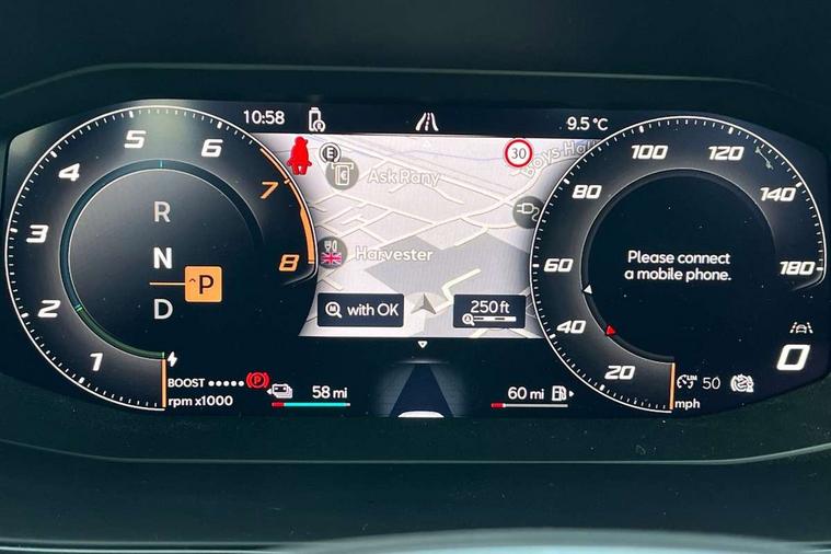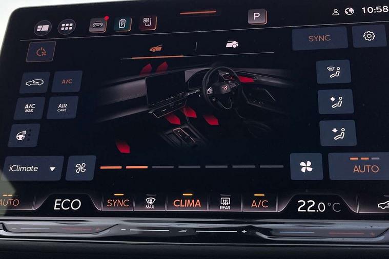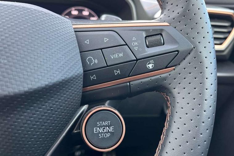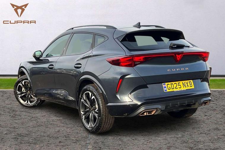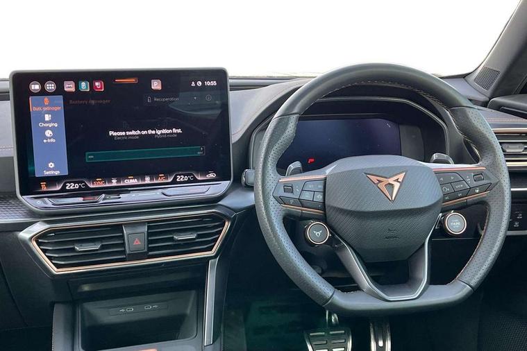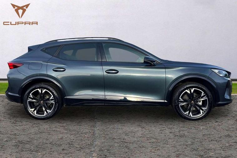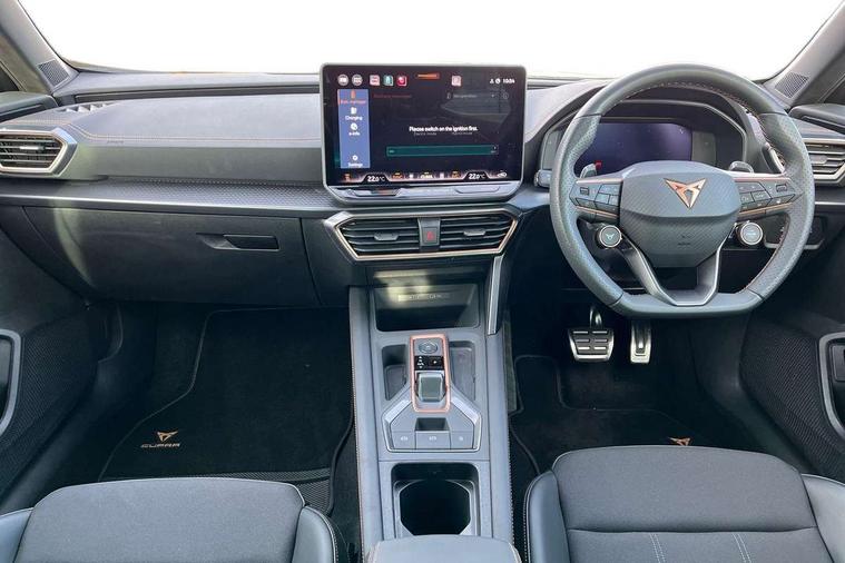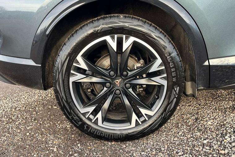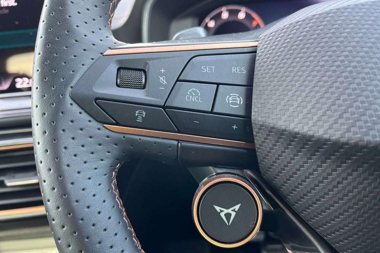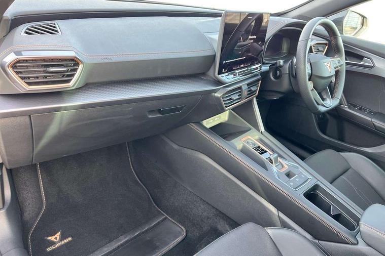 10.25" digital cockpit and configurable dashboard, Adaptive cruise control with follow-to-stop and speed limiter, Advanced driver alert system, Driving profile selection, Dynamic road sign display, Emergency steering support with turn assist, Forward collision warning with automatic braking, Front and rear parking sensors, Front cross traffic assist, Full link phone integration, Lane assist, Progressive steering, RPM, trip computer, outside temp gauge, instrument light brightness, low fuel warning light, lights on reminder, gearshift indicator, Service interval indicator, Start/stop system with regenerative braking, Voice control system, Wired Android Auto, Wireless apple carplay, Wireless phone charger, 10 amp mode 2 charging cable, 32 amp mode 3 charging cable, CUPRA sport suspension, Electronic locking differential and dynamic traction support, 2 front and 2 rear USB type C sockets, 7 speakers, Media system with navigation, 12.9" touchscreen display, voice control, DAB, steering wheel mounted controls, Auto dimming rear view mirror, Body colour door handles, Body coloured bumpers, Dark grey wing mirror, Daytime running light with automatic headlight control and coming home feature, Door panel ambient lighting, Dynamic headlight range control, Electric front/rear windows, Electrically adjustable, heated and folding door mirrors, Gloss black roof rails and window surrounds, High beam assist, LED 3rd brake light, LED front fog lamps with cornering function, LED Headlights, LED Taillights with dynamic indicator, Rain sensing wipers, Rear diffuser with copper simulated exhaust pipes, Rear fog lights, Rear side wing doors, Rear wash/wipe, Tinted rear windows, Welcome lights (within exterior mirror housing), 12V socket, 2 front and 2 rear reading lights, 3 seat bench in 2nd row, 60/40 split rear bench seat with armrest and mechanical seat release, Black headlining, Black interior roof lining, Cupra sports pedals, Dust/pollen filter, Front and rear head restraints, Front centre armrest, Heated supersports multifunction leather steering wheel with satellite buttons and gear shift paddles, Height/reach adjust steering wheel, Illuminated aluminium doorsteps, Illuminated interior front door sills, Illuminated sunvisor with mirror, Interior ambient lighting, Isofix, Manually adjustable height and lumbar support for front seats, PVC/Cloth upholstery with copper stitching + Sport seats, Satellite steering wheel, Single front passenger seat, Storage pockets on rear of front seats, Three zone climate control with control panel in rear, 3 point seatbelts on all rear seats, ABS, Brake control system - ESC and brake booster, Child proof door locks, Driver and front passenger airbags with front passenger airbag de-activation, Electronic parking brake, Front and rear disc brakes, Front side curtain airbags, Hill hold control, Public e-call, Seat belt reminder for front and rear seats, Tyre pressure monitoring system, Anti theft alarm system, Central locking system Keyless Go, Locking wheel bolts, Warranty - 5 years/90, 000 miles, Copper and aluminium interior detailing, 18" Sonora machined silver alloy wheels, Breakdown and tool kit,