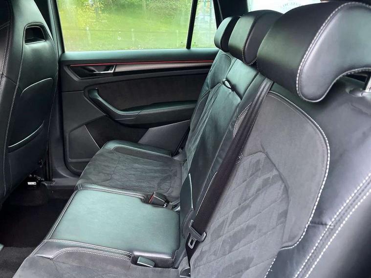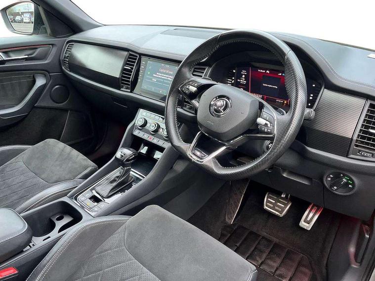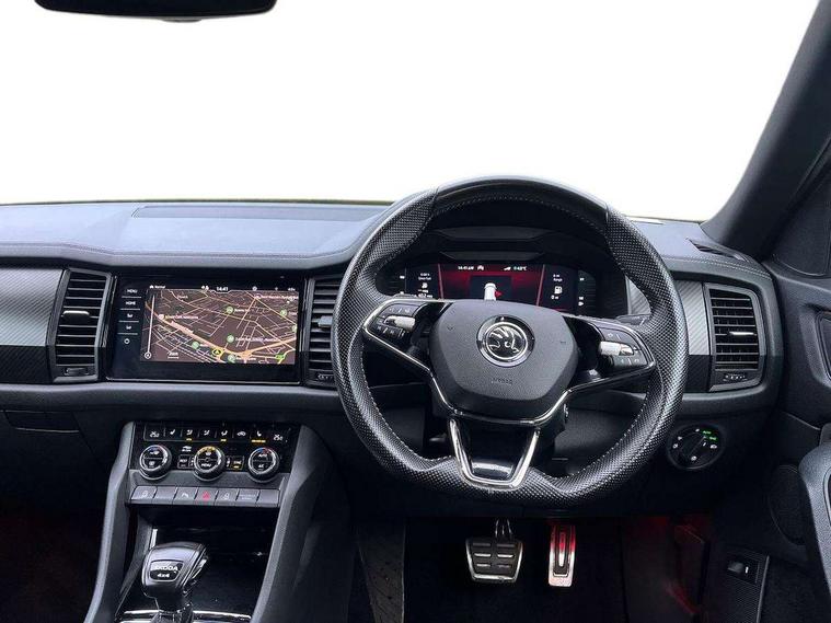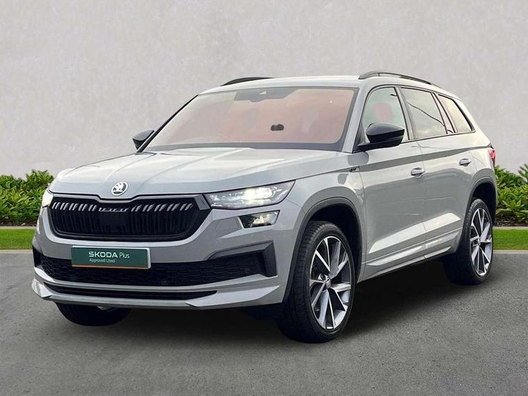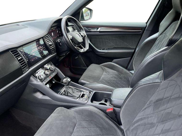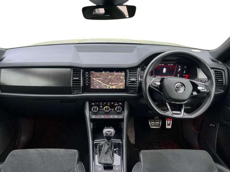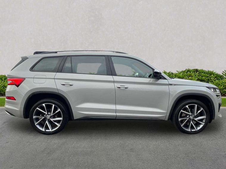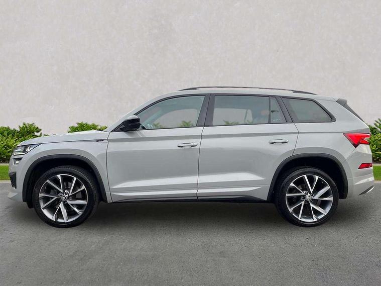 Bluetooth system, Columbus satellite navigation with 9.2" touchscreen, integrated Wi-Fi, web radio, Digital voice enhancement, E-call, ECO Stop/start function, Exterior temperature indicator, Progressive steering, Rear view camera, Smartlink wireless for apple carplay and wired for android auto, Speed limiter, Tailgate unlocking from outside, USB C Port x 2 in front centre console, Wireless charging, 8 Speakers, DAB Digital radio, Aero front windscreen wipers with intermittent function, Aero rear window wiper, Auto dimming rear view mirror, Black roof rails, Black sports styling including front grille and window surrounds, Black wheel arch surrounds, Body colour bumpers, Body colour door handles, Electric adjustable/heated/folding door mirrors, driver side auto dimming with boarding sports and memory function, Electric front and rear windows, Extended rear spoiler with finlets in gloss black, Front fog lights, Full LED matrix headlights with AFS (adaptive front light system), cornering function and AWL (all weather lighting system), Gloss black door mirrors, Headlight washers, Heated rear window, Invisible tailpipe, LED daytime running lights, LED rear fog light, LED third brake light in rear spoiler, Light assistant (coming/leaving home/tunnel light), Off-road style lower front bumper element, Privacy glass, Rain and light sensors, Rear diffuser, Rear LED lights (high functionality) with welcome effect and dynamic indicators, Rear side wing doors, Safety reflectors on front and rear doors, Sportline badge on front fender, Sports front and rear bumpers including lower rear chrome strip, Tailgate lettering in Black, Window control switches with black trim, Without engine designation, 12V socket in boot, 2 rails with 2 hooks, 2 seat bench in 3rd row, 3 seat bench in 2nd row, 4 foldable roof handles with rear coat hooks, 60:40 foldable rear seat with sliding adjustment and backrest angle adjustment, Aluminium pedals, Black roof headlining, Bottle holders in door panel in the 1.5 litre front and 1 litre rear, Cargo storage compartments, Chrome headlight control button, Chrome interior door handles, Coat hooks on B pillar, Covered storage compartment on driver side, Front centre armrest with storage compartment, cup holder and 12V socket, Front courtesy lights, Gear shift lever with chrome frame and black gloss insert, Grey stitching in front and rear armrests and door armrests + door inserts, Height adjustable front headrests, Illuminated and cooled glovebox, Illuminated luggage compartment, Isofix child seat fittings in outer rear seats with top tether, Manually adjustable steering column, Microsuede door panels, Net programme in boot (1x horizontal Net, 2x vertical Nets), Overhead glasses storage compartment, Pollen filter, Rear centre armrest with cupholders, Single front passenger seat, Sliding trunk cover, Small Bags on the inner sides of the front backrests, Sports seats, Sunvisors with illuminated vanity mirrors, Three rear height adjustable headrests, Ticket holder on A Pillar, Umbrella in door panel, Variable boot floor, LED Interior light pack - Kodiaq, Auto door release and activation of warning lights in the event of an accident, Child locks on rear doors, Driver and front passenger airbag with knee airbag and front passenger airbag deactivation, Electronic parking brake with hill start assist, Emergency rear braking signal, ESC (incl. ABS+MSR+ASR+EDS+HBA+DSR+RBS+MKB), Front assist with autonomous emergency braking, Front side airbags with curtain airbags, Fuel cut off safety device, Height adjustable front 3 point seatbelts + pretensioners, Hill hold control, Rear disc brakes, Safety vest holder in door, Seat belt reminder for all seats, Three point rear seat belts, Two tone horn, Tyre pressure monitor, Alarm with interior monitoring and tilt sensor with safe function, Anti-theft wheel bolts, Immobiliser, Keyless entry and start system (KESSY), Remote central locking with 2 keys, Black air vent surround, Carbon finish dashboard and door inserts, Grey stitching in dashboard, 20" Vega Anthracite alloy wheels, Temporary spare wheel (space saver),