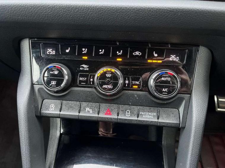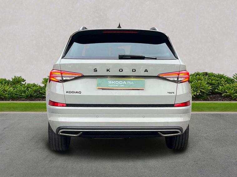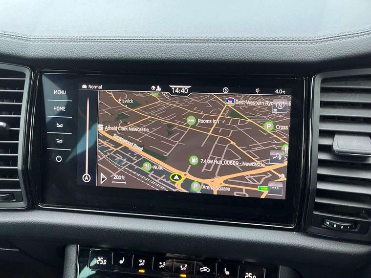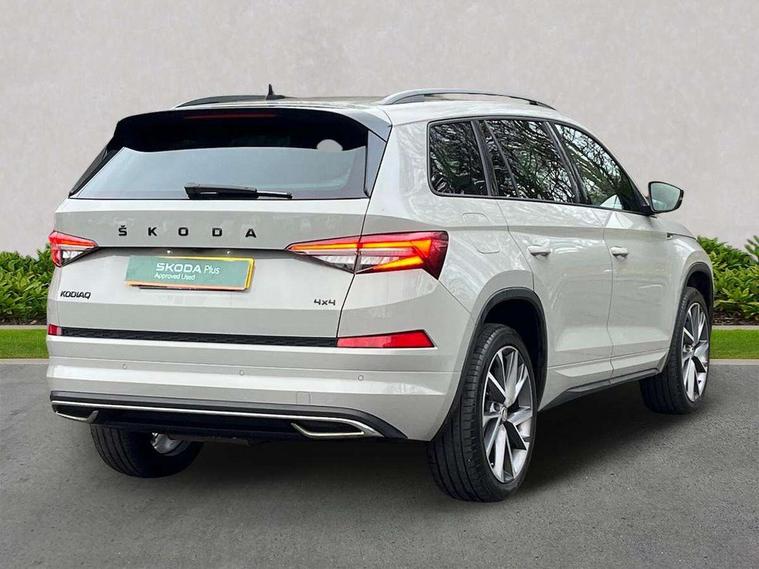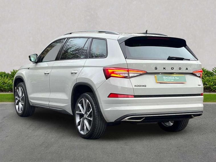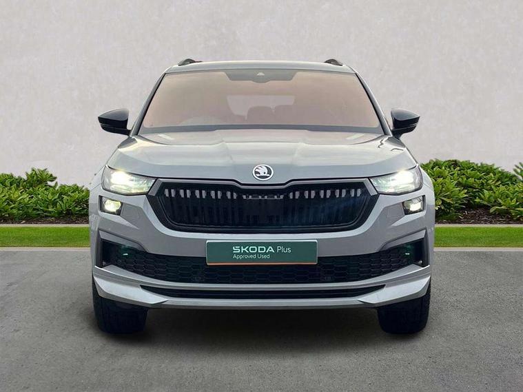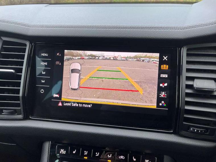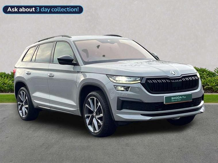 Bluetooth system, Columbus satellite navigation with 9.2" touchscreen, integrated Wi-Fi, web radio, Digital voice enhancement, E-call, ECO Stop/start function, Exterior temperature indicator, Progressive steering, Rear view camera, Smartlink wireless for apple carplay and wired for android auto, Speed limiter, Tailgate unlocking from outside, USB C Port x 2 in front centre console, Wireless charging, 8 Speakers, DAB Digital radio, Aero front windscreen wipers with intermittent function, Aero rear window wiper, Auto dimming rear view mirror, Black roof rails, Black sports styling including front grille and window surrounds, Black wheel arch surrounds, Body colour bumpers, Body colour door handles, Electric adjustable/heated/folding door mirrors, driver side auto dimming with boarding sports and memory function, Electric front and rear windows, Extended rear spoiler with finlets in gloss black, Front fog lights, Full LED matrix headlights with AFS (adaptive front light system), cornering function and AWL (all weather lighting system), Gloss black door mirrors, Headlight washers, Heated rear window, Invisible tailpipe, LED daytime running lights, LED rear fog light, LED third brake light in rear spoiler, Light assistant (coming/leaving home/tunnel light), Off-road style lower front bumper element, Privacy glass, Rain and light sensors, Rear diffuser, Rear LED lights (high functionality) with welcome effect and dynamic indicators, Rear side wing doors, Safety reflectors on front and rear doors, Sportline badge on front fender, Sports front and rear bumpers including lower rear chrome strip, Tailgate lettering in Black, Window control switches with black trim, Without engine designation, 12V socket in boot, 2 rails with 2 hooks, 2 seat bench in 3rd row, 3 seat bench in 2nd row, 4 foldable roof handles with rear coat hooks, 60:40 foldable rear seat with sliding adjustment and backrest angle adjustment, Aluminium pedals, Black roof headlining, Bottle holders in door panel in the 1.5 litre front and 1 litre rear, Cargo storage compartments, Chrome headlight control button, Chrome interior door handles, Coat hooks on B pillar, Covered storage compartment on driver side, Front centre armrest with storage compartment, cup holder and 12V socket, Front courtesy lights, Gear shift lever with chrome frame and black gloss insert, Grey stitching in front and rear armrests and door armrests + door inserts, Height adjustable front headrests, Illuminated and cooled glovebox, Illuminated luggage compartment, Isofix child seat fittings in outer rear seats with top tether, Manually adjustable steering column, Microsuede door panels, Net programme in boot (1x horizontal Net, 2x vertical Nets), Overhead glasses storage compartment, Pollen filter, Rear centre armrest with cupholders, Single front passenger seat, Sliding trunk cover, Small Bags on the inner sides of the front backrests, Sports seats, Sunvisors with illuminated vanity mirrors, Three rear height adjustable headrests, Ticket holder on A Pillar, Umbrella in door panel, Variable boot floor, LED Interior light pack - Kodiaq, Auto door release and activation of warning lights in the event of an accident, Child locks on rear doors, Driver and front passenger airbag with knee airbag and front passenger airbag deactivation, Electronic parking brake with hill start assist, Emergency rear braking signal, ESC (incl. ABS+MSR+ASR+EDS+HBA+DSR+RBS+MKB), Front assist with autonomous emergency braking, Front side airbags with curtain airbags, Fuel cut off safety device, Height adjustable front 3 point seatbelts + pretensioners, Hill hold control, Rear disc brakes, Safety vest holder in door, Seat belt reminder for all seats, Three point rear seat belts, Two tone horn, Tyre pressure monitor, Alarm with interior monitoring and tilt sensor with safe function, Anti-theft wheel bolts, Immobiliser, Keyless entry and start system (KESSY), Remote central locking with 2 keys, Black air vent surround, Carbon finish dashboard and door inserts, Grey stitching in dashboard, 20" Vega Anthracite alloy wheels, Temporary spare wheel (space saver),