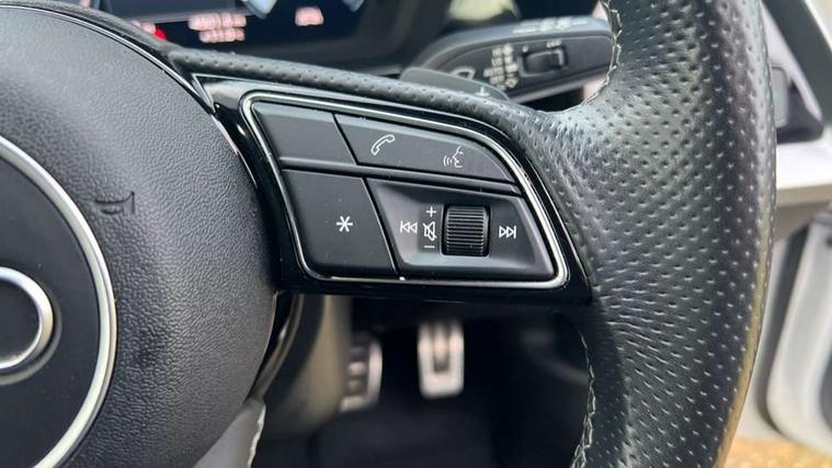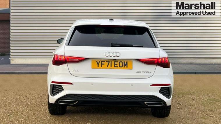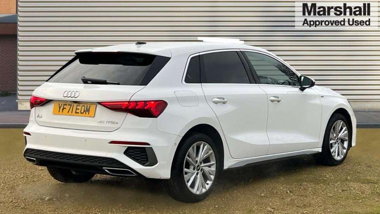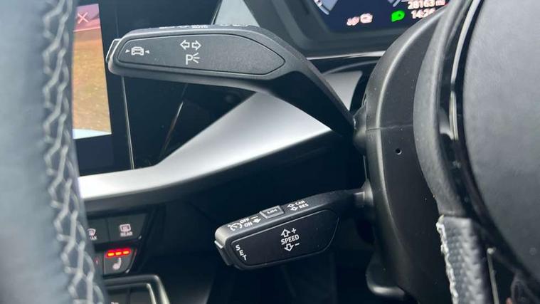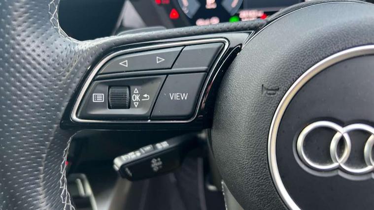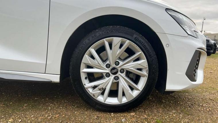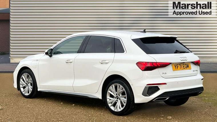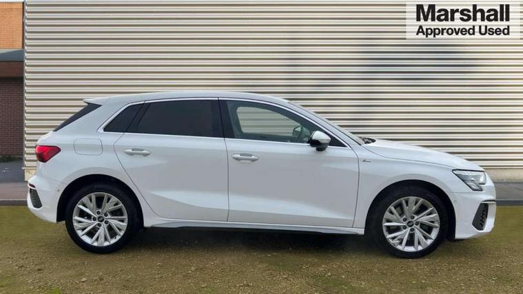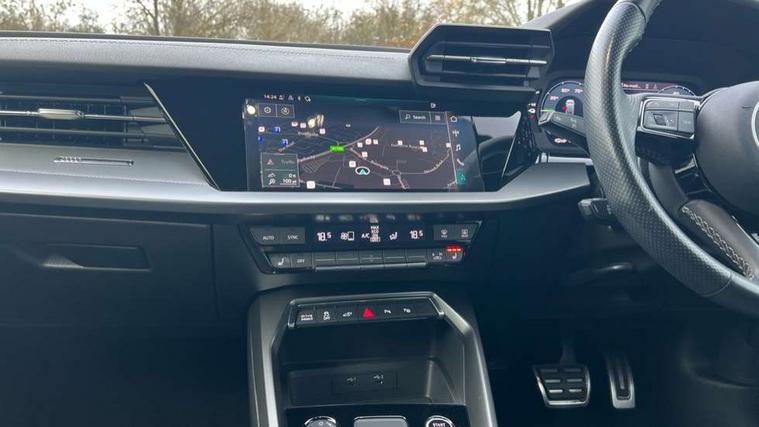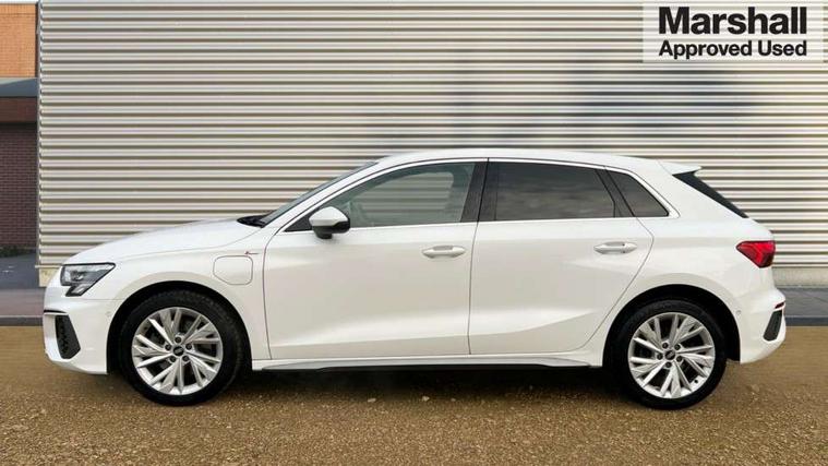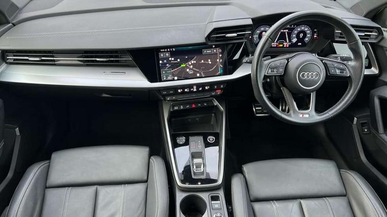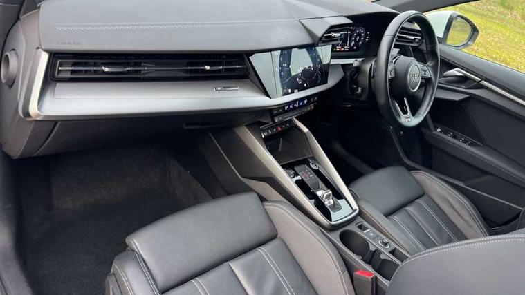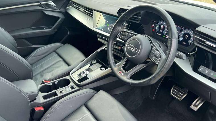 Audi connect emergency call and service, Audi drive select (Auto, Comfort, Dynamic, Efficiency and Individual), Audi smartphone interface, Audi Virtual Cockpit - 10.25" digital and colour instrument cluster, Automatic start/stop system with recuperation, Bluetooth interface, Collision avoidance assistant, Electromechanical power speed sensitive steering, Lane departure warning system, MMI Navigation Plus with high resolution 10.1" colour touch screen display, Service indicator, Trip computer, Voice control system with natural language interaction, 3 pin 10 amp domestic charging cable, Type 2 mode 3 32 amp charging cable, Type 2 socket for AC charging, 2xUSB-C connection with data and charging functions, 6 passive loudspeakers, DAB Digital radio, 3rd brake light, Acoustic glass windscreen, Aluminium window trim, Auto dimming frameless rear view mirror, Electrically adjustable/heated/folding/auto dimming door mirrors with integrated LED indications + kerb view function for passenger side, Front electric windows, Illuminated aluminium inserts front door sills with S logo, LED daytime running lights, LED headlights with LED rear lights and dynamic rear indicators, Light and rain sensors, Privacy glass - dark tinted rear window, rear door and side windows, Rear electric windows, Rear side air outlets in grained matt black, Rear wiper, S line bumpers, S roof spoiler, 12V socket and storage compartment in front centre console, 40/20/40 split folding rear seat bench with cupholder, Black cloth headlining, Dual zone electronic climate control, Front and rear centre armrest in leather, Front and rear headrests, Front/rear floor mats, Height and reach adjustable steering wheel, Interior lighting - glove compartment light and right hand side, Luggage compartment floor covering, Manual boot compartment lid, Manually adjustable front seats, Seat side bolsters, Stainless steel pedals and front footrest, Twin leather upholstery with front sports seats S embossed logo, Aluminium interior elements pack - A3 Sportback, S line styling pack - A3 Sportback, 3x3 point rear seat belts, Driver and front passenger airbag with passenger airbag deactivation, Electronic Stabilisation Control (ESC) including ABS, ASR and EDL, First aid kit with warning triangle and 2 safety vests, Front side airbags with head airbags and interaction airbag, Hill hold assist, Pre-sense front with pedestrian and cyclist detection, Seatbelt monitoring, Tyre pressure loss indicator, Anti theft alarm, Anti-theft wheel bolts, Electronically operated child lock, Immobiliser, Remote control central locking, Accent surfaces in the dashboard and centre console in platinum grey silk effect paint finish, Dark spectrum aluminium inlays, Tool kit, Tyre repair kit,