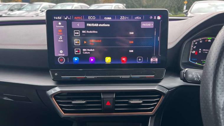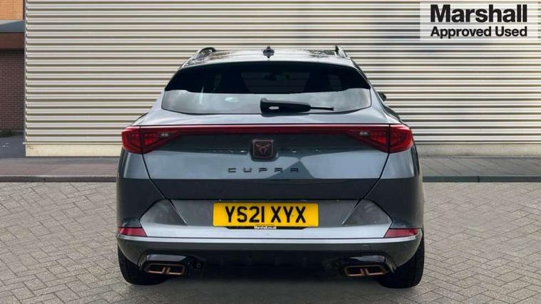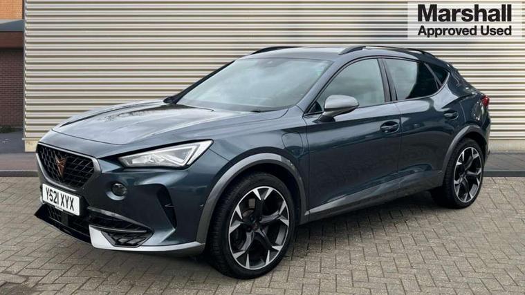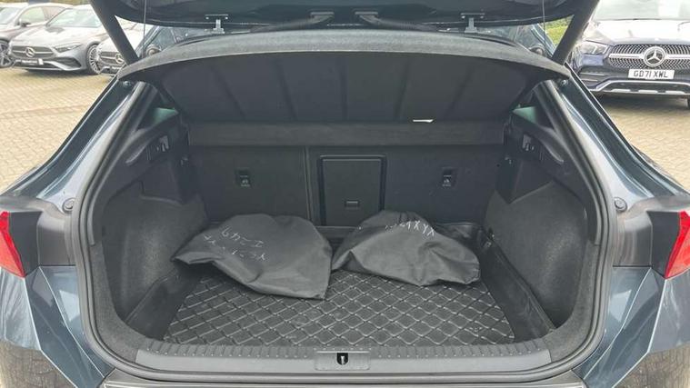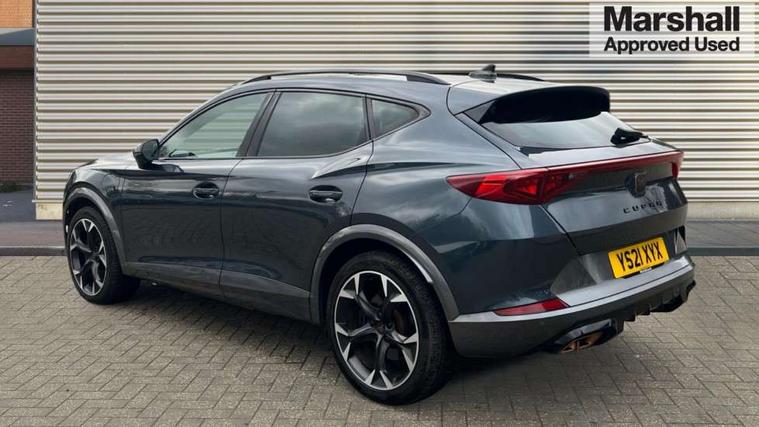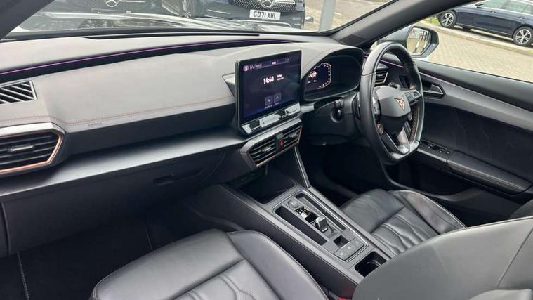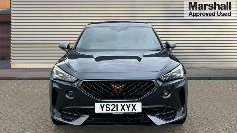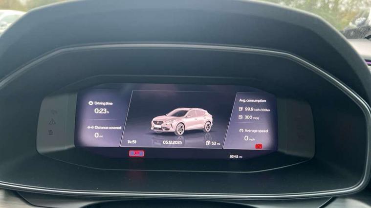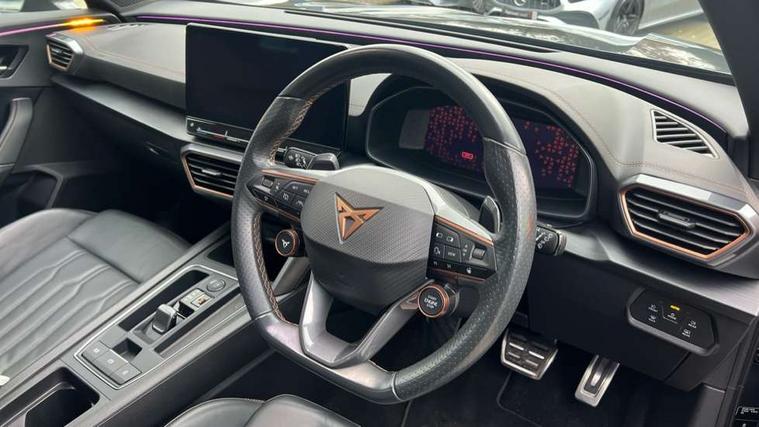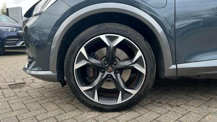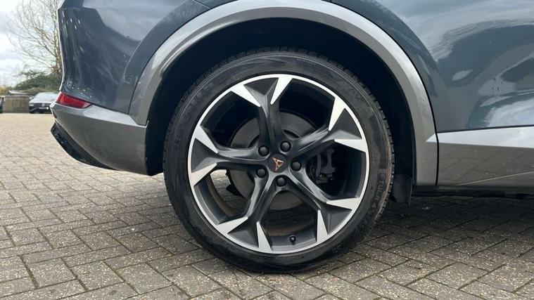 Digital cockpit and configurable dashboard, Driver alert system, Dynamic chassis control with driving profile selection (Comfort, Sport, CUPRA, Individual), Forward collision warning with automatic braking, Park assist (inc front/rear parking sensors), Predictive adaptive cruise control with speed limiter, Rear view camera, RPM, trip computer, outside temp gauge, instrument light brightness, low fuel warning light, lights on reminder, gearshift indicator, Service interval indicator, Speed sensitive power steering, Start/stop system with regenerative braking, Virtual pedal and electric tailgate, Wireless apple carplay, Wireless phone charger, 10 amp mode 2 charging cable, 16 amp mode 3 charging cable, 3.6 kw On-board charger, Electronic locking differential and dynamic traction support, Mode 3 charging cable, Sports suspension with front shock absoption, 2 front and 2 rear USB type C sockets, Auxiliary input socket, DAB radio, Auto dimming rear view mirror, Body colour door handles, Body coloured bumpers, Dark grey wing mirror, Daytime running light with automatic headlight control and coming home feature, Dynamic headlight range control, Electric front/rear windows, Electrically adjustable, heated and folding door mirrors, Front fog lamps with cornering function, Gloss black roof rails and window surrounds, LED Headlights, LED Taillights with dynamic indicator, Rain sensing wipers, Rear diffuser with twin exhaust pipe on each side with simulated exhausts, Rear wash/wipe, Sports bumpers, Tinted rear windows, Welcome lights, 12v power supply in centre console, 12v socket in loadspace, 2 front and 2 rear reading lights, 230V socket, 60/40 split rear bench seat with armrest and mechanical seat release, Black headlining, Cupra sports pedals, Dust/pollen filter, Front and rear head restraints, Front centre armrest, Heated steering wheel, Height/reach adjust steering wheel, Illuminated interior front door sills, Illuminated sunvisor with mirror, Interior ambient lighting, Isofix, Leather multi-function sports steering wheel with start stop, CUPRA mode button and gear shift paddles, Luggage tie-down hooks, Three zone climate control with control panel in rear, Wraparound lighting, Genuine Nappa leather Pack - Cupra, Navigation system pack - Formentor, Safety and driving pack (XL) - Formentor, 3 point seatbelts on all rear seats, ABS, Brake control system - ESC and brake booster, Child proof door locks, Driver and front passenger airbags with front passenger airbag de-activation, Electronic parking brake, Front and rear disc brakes, Front side curtain airbags, Hill hold control, Seat belt reminder for front and rear seats, Tyre pressure monitoring system, Anti theft alarm system, Keyless entry and start system (KESSY), Locking wheel bolts, Copper and aluminium interior detailing, 19" Exclusive machined sport matt black and silver alloy wheels with 94W tyres, Space saver spare wheel, Tyre repair kit,