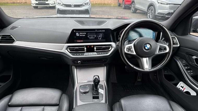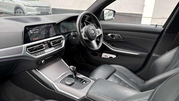 Active guard plus, Attentiveness assist, Auto start-stop, BMW ConnectedDrive online services, BMW iDrive controller on centre console, BMW Live Cockpit Professional sat nav system including 10.25" high resolution display and Intelligent Voice Assistant, BMW service history, BMW Teleservices, Brake pad wear indicator in front and rear, Check Control warning system for monitoring of lights and door/luggage compartment open warning, Condition based service, Electric power steering with Servotronic steering optimised at all speed ranges, Instrument cluster with speedometer with mph readout, tachometer, fuel gauge and oil temperature gauge, Integrated owners handbook, Oil sensor for level and grade, warning by check control system, On board computer - average speed+fuel consumption, service interval, clock/date, odometer/trip meter, outside temperature display and ice warning, Optimum shift indicator, Personal Profile - automatic lock when driving away selectable, Variable sport steering, Balanced 50/50 weight distribution, Battery cut-out switch, Diesel particulate filter, Drive performance control - ECO PRO, comfort and sport modes, Incorrect fuelling protection, Larger capacity fuel tank, M sport suspension, Sport automatic transmission with steering-wheel mounted gearshift paddles and launch control, Stroke dependent dampers, DAB tuner, Electronic service booklet, Acoustic glazing, Active airstream chrome frame kidney grille with 8 high gloss black vertical slats, Automatic headlight beam throw control with load dependent regulating reaction, dynamic compensation of braking dive and acceleration squat, Black roof mouldings, BMW Individual high gloss shadow line roof rails, Body colour - fuel filler flap, front and rear bumpers, door handles and mirror caps with integrated turn indicator + bottom segment in matt black, Dynamic brake lights, Electric windows - front and rear, with open/close fingertip control, anti-trap facility and comfort closing, Exhaust tailpipe - split left and right, Extended LED headlights, Exterior mirrors - electrically folding with anti-dazzle, Fading support, Front and rear bumper system with replaceable deformation elements, Front black door sill finishers with BMW designation, Green tinted heat protection glazing, High gloss shadow line exterior trim, Interior rear view electrochromatic mirror with automatic anti dazzle function, LED front fog lights, Lightweight engineering, M designation on front side panels, left and right, Matt black exterior B pillar, Model designation on right side of tailgate, Rain sensor with automatic headlight activation, Rear wiper, Shark fin antenna, Two part LED tailights in L-shape with components in smoked glass, brake light, LED turn indicator and rear fog light, Visible VIN plate, Welcome lights in interior and door handle area, Windscreen wipers with integrated washing jets, 12V power socket in front storage compartment, 2 front cupholder in centre console with clamping elements and matt black inlay, 3 rear seats with non folding headrests with 3 point seat belts, 3 zone automatic air conditioning, 4 pieces lashing eyelets in luggage compartment, 40:20:40 split folding rear seat with loading system, Ambient lighting with welcome carpet light, Anthracite headlining, Armrest integrated in front and rear door trim + front centre console armrest, Centred top Luggage compartment lights, Four grab handles integrated in roof lining, Front and rear door exit lighting (left / right), Front and rear door pockets, Front and rear reading lights, Front and rear velour floor mats, Front head restraints, Front sport seats, Heated driver and front passenger seats, Height adjustable mechanically and infinitely variable steering column, Illuminated armrest storage compartment, Illuminated glove compartment with separate small compartment, Interior lighting - front centre over interior mirror with soft light, rear centre and front and rear footwell lighting, M Sport multifunction leather steering wheel, Make-up mirror lights, Rear centre armrest with 2 cupholders, Rear centre console with storage compartment and ventilation grille, Sunvisors with vanity mirrors and ticket pocket, Toolkit located in luggage compartment, Connected pack professional - 3 Series Saloon/Touring, M Aerodynamics pack - 3 Series Saloon/Touring, 2 tone horn, BMW emergency call, Brake energy regeneration, Braking pre-tensioning, Child proof locking system in rear door, Child seat ISOFIX attachment rear outer seats, Coasting in idle in ECO PRO mode, Crash sensor activating of airbags, Unlocking doors, hazard warning lights, interior light, safety battery terminal, Driver and front passenger side airbags, integrated in the door side seat backrest bolsters for all seat variants, Driver/Front Passenger airbags, Dry braking, Dynamic brake control, Dynamic stability control + (DSC+) - Anti-lock Braking System (ABS) with brake assist and cornering brake control + Automatic Stability Control (ASC), Dynamic Traction Control - DTC, Electric parking brake including automatic hold function and automatic release of the parking brake when driving off, Electronic differential lock control (EDLC), Front passenger manual airbag deactivation, Head airbags for all 4 outer seats, Hill start assist, Seat belt security check for driver and front passenger, Side impact protection, Three 3 point seat belts on all seats including front belt stopper, pyrotechnic belt tensioners and belt force limiters, Tyre pressure monitoring with three level warning strategy, Ventilated front and rear disc brakes, Warning triangle and first aid kit, Alarm system (Thatcham 1) with remote control and electronic engine immobiliser, Central locking switch for all doors, fuel filler cap and luggage compartment, Remote control with integrated key one button open/close vehicle and windows, sole opening of the luggage compartment lid and panic mode, Start/stop button with Comfort Go keyless engine start and auto Start/st