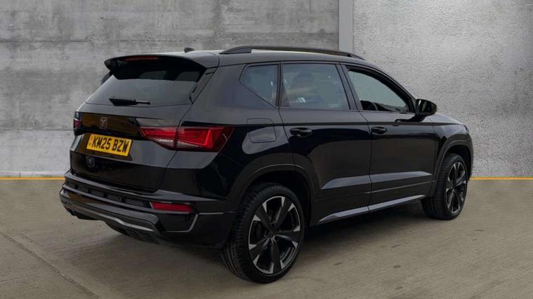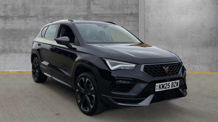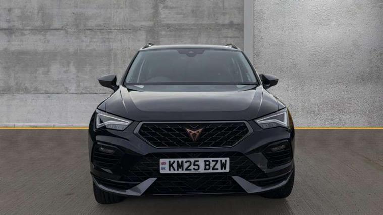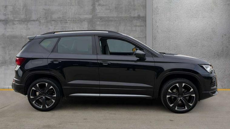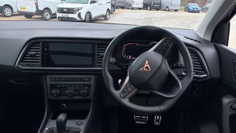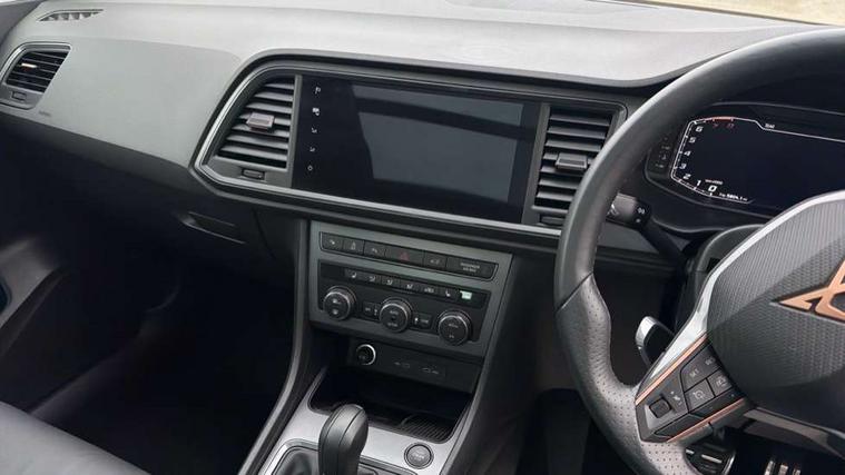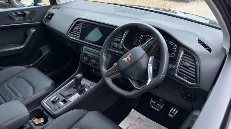 Cruise control system with speed limiter, Digital cockpit, Driving profile selection and conventional shock absorber, E-call, Electric tailgate with virtual pedal, Outside temperature gauge, Progressive power assisted steering, Rear view camera, Self parking functionality (includes front and rear parking sensors), Trip computer, wired and wireless full link smartphone integration, Wireless phone charger, Front and rear shock absorption, chassis with increased ride height, Steering wheel mounted audio/phone controls, Body colour bumpers with dark aluminium diffusor, Body coloured wheel arch surrounds, Dark tinted rear windows, Daytime running lights, Door mirrors with welcome CUPRA light silhouette, Dynamic headlight range control with self adjusting whilst driving, Electric adjustable/heated/folding door mirrors, Front and rear electric windows, Front grille frame in chrome, Full LED headlamps with lens and LED front fog lamps with cornering function, Gloss black door mirrors, Gloss black roof rails, Gloss black side mouldings, Gloss black side window trim, Illuminated aluminium front door sill, LED rear tail lights with dynamic indicators, Rear fog lights, Rear side wing doors, Rear spoiler, Rear wash/wipe, Specific CUPRA design front bumper, Standard rear exhaust tailpipes, Third brake light, 12V socket in front, 3 seat bench in 2nd row, 60/40 split folding rear seat, Aluminium pedals, Cupra steering wheel emblem, Dual zone climate control, Electric driver seat with memory function, Front and rear head restraints, Front centre armrest, Front seat back storage pockets, Grey roof lining, Heated front seats, Heated steering wheel, Height adjustable driver and passenger seat with lumbar adjustment, ISOFIX points in outer rear seats with top tether anchorage points, Leather sport bucket seats, Leather steering wheel and gear knob, Multicoloured ambient lighting with LED interior illumination, Pedal cluster, Rear armrest and easy back seat release mechanism from boot, Single front passenger seat, Sports steering wheel, Steering wheel mounted gearshift paddles, Storage compartment in roof console for sunglass, Storage compartment under driver's seat, Convenience pack - Ateca, Interior lighting pack - Ateca, Navigation system plus pack with DAB - Ateca, Safety and driving pack - Ateca, 3x3 point rear seatbelts, ABS, Traction control system (TCS), Electronic stability control (ESC) and Electronic differential lock system (XDS), Airbags - Driver and front passenger airbag with deactivation, front side, two curtain and driver's knee airbags, Black brake callipers with CUPRA logo, Electric parking brake with auto hold function, Front and rear seatbelt reminder, Front assist with autonomous emergency braking, Hill hold control, Manual rear child locks, Single tone horn, Tiredness recognition system, Tyre pressure monitoring system, Alarm, Keyless entry, Locking wheel bolts, 19" Sport machined alloy wheels 36/3 in black/silver,