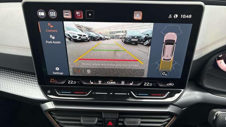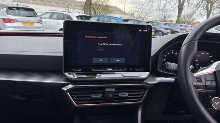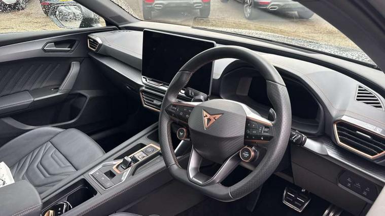 Adaptive cruise control with follow-to-stop and speed limiter, CUPRA mode drive profile selection with throttle response and gearshift mode, Digital cockpit, Driver alert system, Dynamic road sign display, E-call, Four x USB Type C ports (2 in front and 2 in rear), Front and rear parking sensors, Front assist with forward collision warning braking reaction to vehicles, pedestrians and cyclists, Front cross traffic assist, Full link smartphone integration with Mirror Link, wireless Apple CarPlay and wired Google Android Auto, Intelligent park assist, Lane change assist with emergency assist, Lockable tailgate, Rear view camera, RPM, trip computer, outside temp gauge, instrument light brightness, low fuel warning light, lights on reminder, gearshift indicator, Service interval indicator, Side and exit assist, Start/stop system with regenerative braking, Virtual pedal with electric tailgate, Wireless phone charger, Auxiliary input socket, Auto dimming rear view mirror, Body colour door handles, Body coloured bumpers, Cupra matrix LED ultra headlight with variable light distribution, high definition LED w/signature w/ceremony, Cupra sports bumpers, Dark tinted rear windows, Electric front/rear windows, Electrically adjustable, heated and folding door mirrors, Gloss black roof rails, High beam assist, High-resolution matrix beam plus digital projection, LED front fog lamps with cornering function, LED rear fog lamp, Rain sensing wipers, Rear diffuser with twin oval exhaust pipe on each side, Rear side wing doors, Rear wash/wipe, Separate daytime running light with automatic headlight control and coming home feature, Third brake light, Welcome light with logo projector in door mirrors, 12v power supply in centre console, 3 seat bench in 2nd row, 5 headrests, 60/40 split rear bench seat with armrest, Ambient lighting (glovebox, footwell, ambient lighting multicoloured), Black headlining, Cupra sports pedals, CUPRA Supersports, heated steering wheel with satellite buttons, Electrically adjustable driver seat and lumbar support with memory function + manually adjustable passenger seat, Front and rear reading lights X 4, Front centre armrest, Heated front seats, Height/reach adjust steering wheel, Illuminated interior front door sills, Interior wraparound lighting, ISOFIX points in outer rear seats with top tether anchorage points, Leather upholstery, Single front passenger seat, Sliding boot cover, Storage pockets on rear of front seats, Sunvisors with illuminated mirror, Three zone climate control, Dynamic and comfort pack - Leon Cupra, Media system plus with 12.9" display + navigation pack - Leon Cupra, 3 point seatbelts on all rear seats, ABS, Brake control system - ESC and brake booster, Child proof door locks, Cupra black brake calipers, Disc brakes in front, Driver and front passenger airbags with front passenger airbag de-activation, front side and curtain airbags, Electronic parking brake, Hill hold control, Pre-crash front and rear seat belt tensioner, window closure and hazard lights, Rear disc brakes, Seat belt reminder for front and rear seats, Tiredness recognition system, Tyre pressure monitoring system, Anti theft alarm system with interior monitoring in cab, backup horn and towing protection, KESSY Advanced - Keyless start, keyless entry, Locking wheel bolts, Chrome and copper interior detailing, 19" Mistral machined R black and silver alloy wheel with 91Y tyres, Breakdown kit, Tool kit,