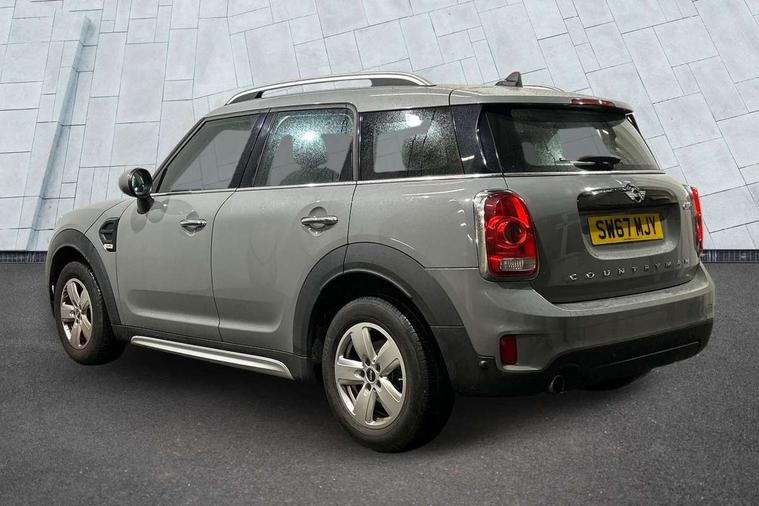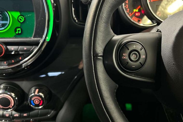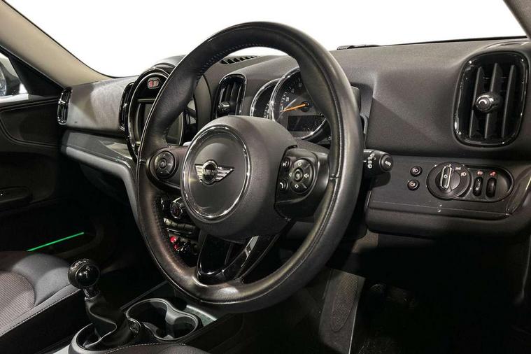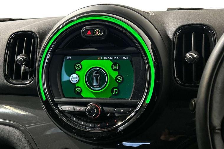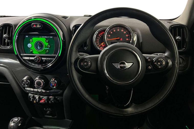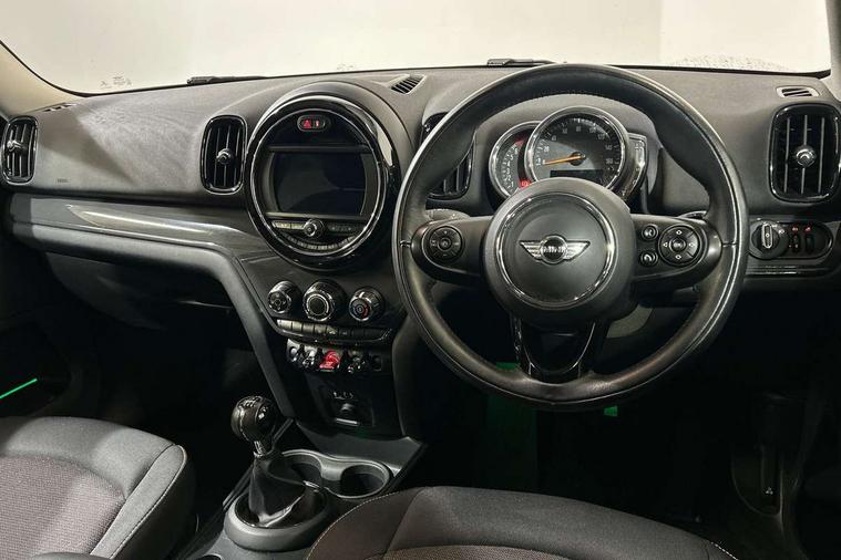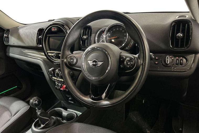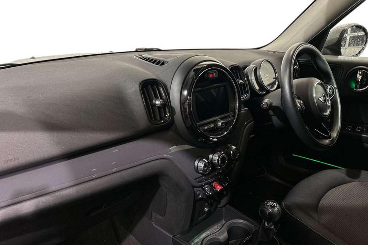 Brake pad wear indicator warning light, Central display with LED ring and 6.5" colour touch screen, DTC - Dynamic traction control, Exterior temperature gauge, Intelligent emergency call, MINI TeleServices, Navigation system, On board computer, Personal Profile, Service interval indicator, Servotronic speed sensitive power steering, Electronic differential lock, Auxiliary input socket, DAB digital radio module, MINI Connected, MP3 compatible radio/single CD player, Radio visual boost, Anti dazzle rear view mirror, Blue tinted glass, Chrome door handles, Chrome exhaust tailpipe, Chrome headlight surround, Chrome plated radiator grille, Chrome window surround, Electric front windows + one touch + anti-pinch, Electrically adjustable door mirrors, Follow me home headlights, Heated door mirrors/heated windscreen washers, Heated rear window with automatic switch off, Metal look door sill finishers, Rain sensor including auto headlights activation, Rear wiper, Roof spoiler, White indicator lights, 12V power point front, 2 cupholders in front centre console, 4 lashing points to secure luggage, 40:20:40 split folding rear seats, Centre console storage box, Chrome interior door handles, Driver/passenger sunvisors, Front and rear headrests, Front and rear Isofix child seat preparation, Front and rear velour floor mats, Front centre armrest with storage compartment, Front interior light, Front passenger grab handle, Front seat backrest storage nets, Heater with recirculation function, Height/reach adjust steering wheel, Luggage compartment lighting, Multifunction steering wheel, Rear grab handles, Sensatec gearshift and handbrake, Storage compartments in doors, Toolkit in luggage compartment, Interior lights pack - Countryman, MINI Excitement Pack - Countryman, 3 point automatic seatbelts, 3 point seatbelts on all rear seats, ABS, Cornering brake control (CBC), Crash Sensor - activates hazard/interior lighting + unlocks doors, Driver and passenger airbags, Driver and passenger side airbags, DSC - Dynamic Stability Control, Electronic brake force distribution, Electronic parking brake, Front curtain airbags, Front passenger airbag deactivation, Fuel cut off safety device, Hill start assist, Pyrotechnically pre-tensioned front seatbelts, Tyre pressure warning, Automatic door locking, Keyless Start, Locking wheel bolts, RF remote control central locking, Second remote key, Thatcham category 1 alarm + immobiliser,