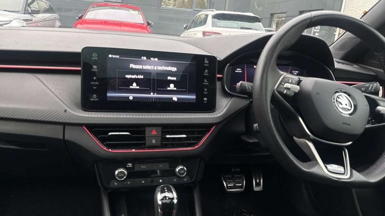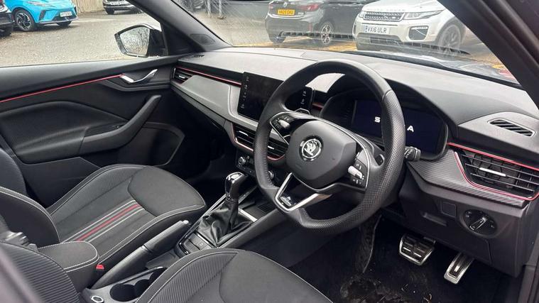 Advanced driver attention and drowsiness monitor, Bluetooth system, E-call, Front assist system, PAS, Rear parking sensors, Rear view camera, Service indicator, Speed limiter, Traffic sign recognition, Virtual cockpit with 10.25" display, Voice control system, Wireless smartlink, 4 USB C ports, 8 Speakers, 9.2" Skoda navigation display, DAB Digital radio, Auto dimming rear view mirror, Automatic headlight control with coming home and leaving home feature, Black door mirrors, Black radiator grille, Black rear diffuser, Black roof spoiler, Body colour bumpers, Body colour door handles, Boot lettering in black, Extended tailgate glass, Fixed panoramic sunroof with black roof rails, Front and rear electric windows, Heated rear window, LED daytime running lights, LED high beam, LED low beam, LED third brake light, Light sensors, Monte carlo plaque, Privacy glass, Rear side wing doors, Rear wiper, Ticket holder inside windscreen, 12V socket in luggage compartment, 3 seat bench in 2nd row, Aluminium pedals, Ambient lighting in white/red, Art leather carbon decor inserts, Art leather carbon door inserts, Black roof lining, Cargo elements, Chrome inner door handles, Driver and passenger sun visors with vanity mirror, Dual zone climate control, Front and rear roof lights, Front centre armrest, Front head restraints, Glove compartment with illumination, Height adjustable driver seat, Height adjustable front passenger seat, Ice scraper, Inner circulation control with pollen filter, ISOFIX on front passenger seat, Isofix preparation for back seats, Leather gearknob and handbrake lever, Manual lumbar support for front seats, Monte Carlo cloth upholstery, Net package and top tether hooks in boot space, Net under rear shelf, Pocket on the back of both front seats include mobile phone pockets, Rake/reach adjustable steering wheel, Reading lights, Rear centre armrests, Red hotstamping, Single front passenger seat, Sports seats, Textile floor mats, Third rear headrest, Top tether for front passenger seat, Umbrella in driver's door, Light and view plus package - Kamiq, 3x3 point rear seatbelts, Airbags - driver and front passenger, Disc brakes, ESP, Extended and predictive pedestrian/cyclist protection, Front passenger airbag deactivation switch, Front side airbags with curtain airbags, Hill hold control, Manual leather parking brake, Manual rear child locks, One tone horn, Seatbelt reminder for driver an co-driver, Traction control, Tyre pressure monitor, Anti-theft alarm system with interior monitoring, backup horn, towing protection and remote central locking with SAFE system, Anti-theft wheel bolts, Electronic engine immobilizer, 18" Ursa black diamond cut alloy wheels,