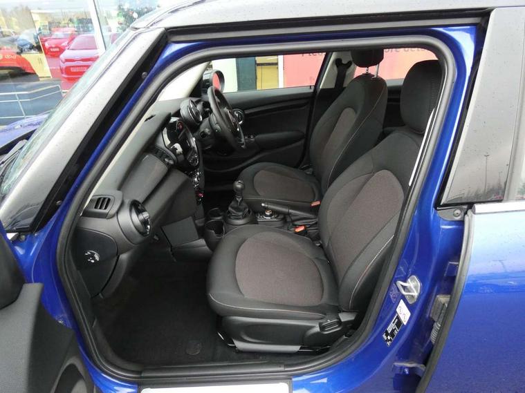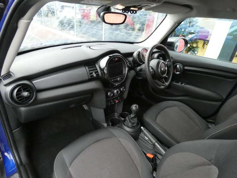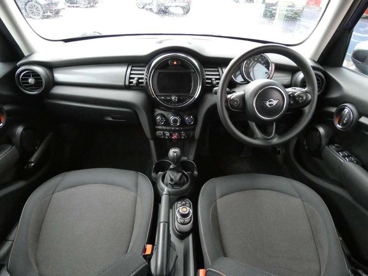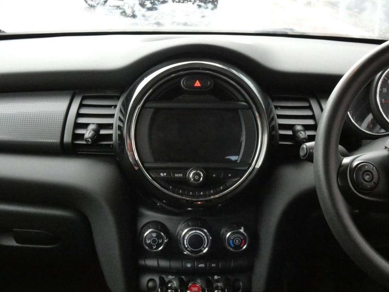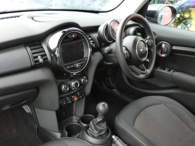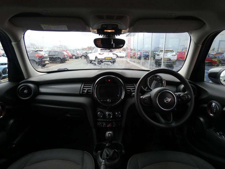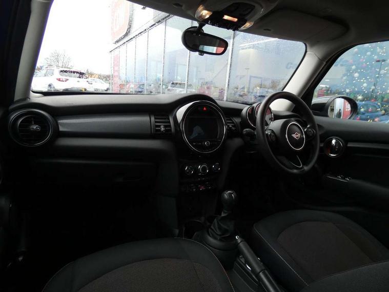 Automatic start/stop function with brake energy recuperation, Compatible mobile phone bluetooth with audio streaming, Electro-mechanical speed dependant steering assistance, Instrument cluster, Mini E-call, MINI TeleServices, On board computer, Service interval indicator, Double Vanos system, Fully variable valve control, High precision injection, 6.5" touchscreen with LED ring, FM tuner and DAB digital radio, Automatic headlight activation switch, Body colour fuel filler cap, Chrome border high gloss black slats radiator grille, Dynamic brake lights, Electric front+rear windows, Heated rear window, Heated windscreen washer jets, LED headlight with closed ring and daytime driving lights, Left exhaust tailpipe with chrome finisher, Metal door sill strips with MINI imprint, Model logo Cooper on right of tailgate, Rain sensor window wipers, Rear fog lights, Rear LED lights with union jack design, Rear window wiper, Side scuttle panel with integrated indicator, Sun/heat protection glass, White indicator lenses, 12V Accessory socket in centre console, 4 lashing eyes in luggage compartment, 60/40 split folding rear seat, Chrome interior highlights, Colour line - Carbon black, Cupholders, Front and rear head restraints, Front and rear isofix with front passenger airbag deactivation, Glove compartment, Height and length steering column adjustment, Interior lighting with 12 basic colours selectable via toggle switch in roof, Leather gearshift lever and handbrake gaiters, LED reading lights, vanity mirror lights, front foot well light and spotlight on front seats, Manual air conditioning, Mechanical seat adjustment, driver seat height adjust, forward/back and front seats backrest, Mini logo projection on floor from drivers exterior mirror, Multifunction steering wheel, Satellite grey headlining, Storage compartments in doors, Sunvisors with vanity mirrors, 3 point seatbelts on all five seats, 6 Airbags - front, side, head and seat belt tensioners, Anti-lock braking system (ABS), DSC - Dynamic Stability Control, Front and rear disc brakes, Hill start assist, Single tone fanfare horn, Tyre pressure monitoring system, Alarm system with tilt sensor, monitoring doors, bonnet interior and tailgate, Electronic vehicle immobiliser, Start/stop toggle with keyless go, Tool kit,