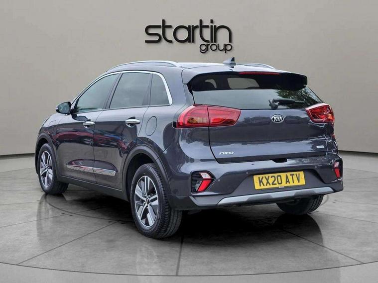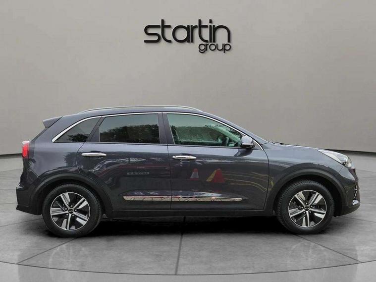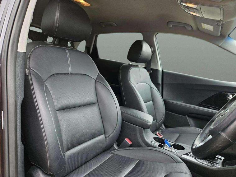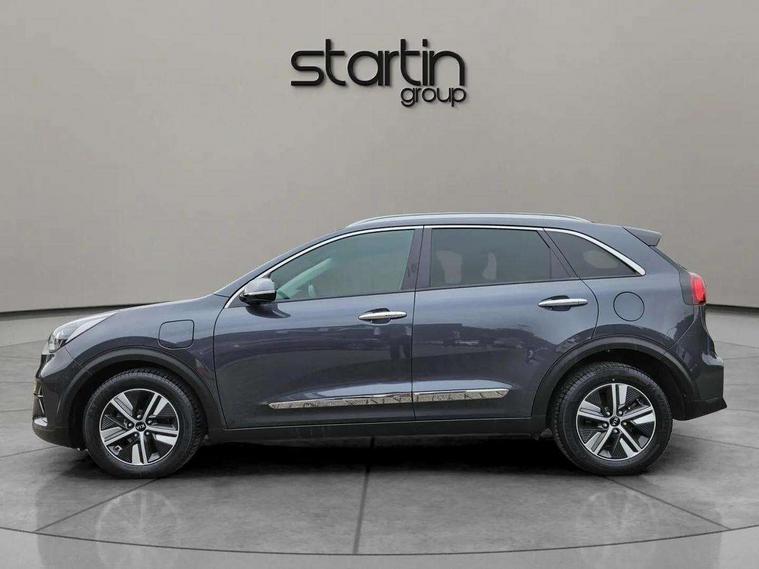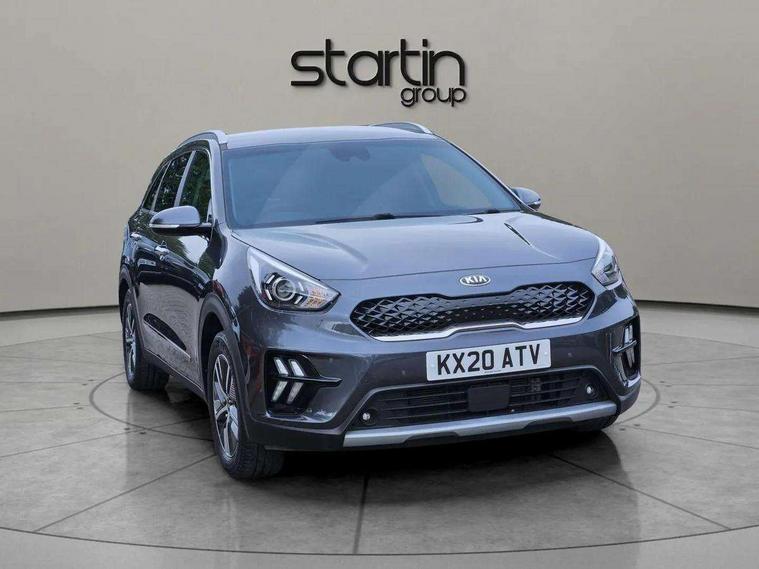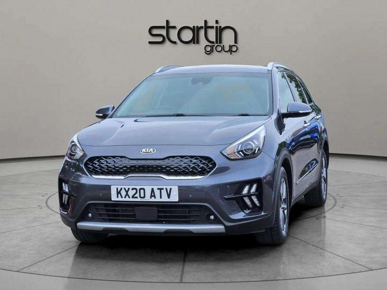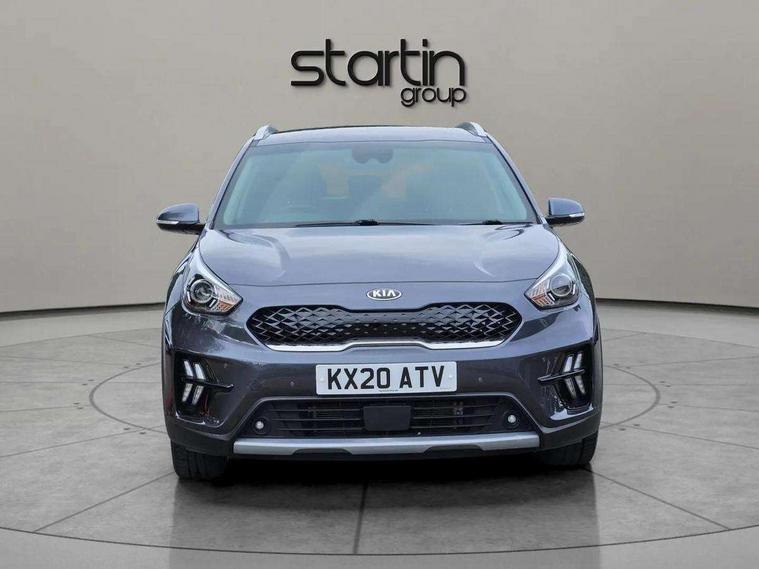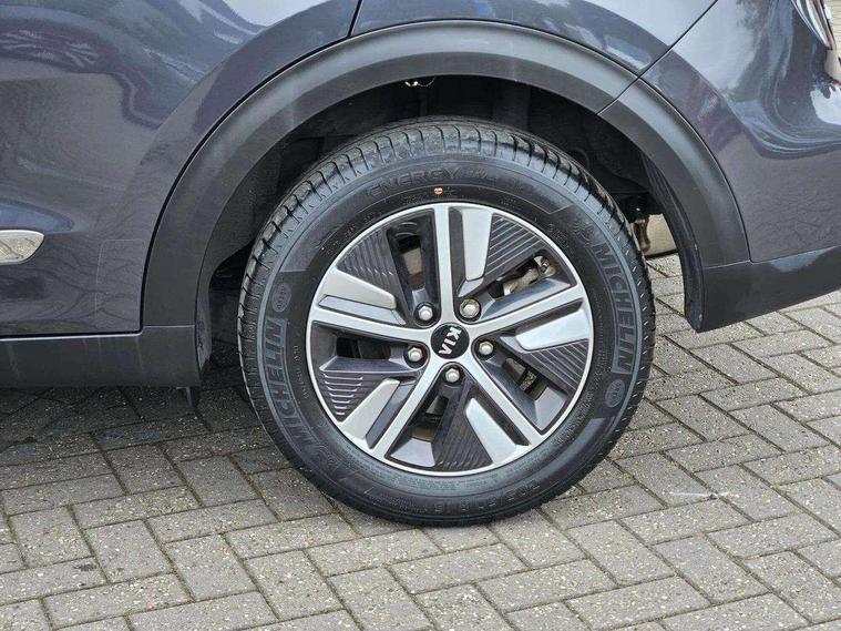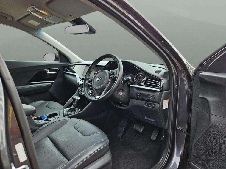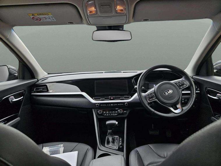 10.25" Touch screen satellite navigation with european mapping and traffic messaging channel, Adaptive smart cruise control function (SCC) with stop and go, Apple car play/Android Auto with voice control, Digital clock, Drive mode selector, Driver attention warning, Emergency stop signalling system, Forward collision avoidance assist, Front parking sensors, Kia connected services featuring TomTom live, Lane Following Assist (LFA), Lane keep assist, Motor driven power steering, Rear parking sensors, Reversing camera, Speed limiter, Telematics system with UVO connect services, Trip computer with distance/fuel consumption/average speed, Wireless Smartphone charger, 'Shark fin' mobile antenna, 4.2" supervision cluster with TFT colour display, 6 speakers, Bluetooth with music streaming, DAB Radio with MP3, Steering wheel mounted controls, USB connection located in centre console, USB port, All round electric windows with drivers and front passenger auto up/down function, Auto dimming rear view mirror, Automatic defog system, Automatic headlight control system, Black side sills, Body colour bumpers, Body coloured/high gloss door mirrors, Chrome beltline mouldings, Chrome door handles, Driver's side wide angle mirror, Electrically folding/adjustable/heated door mirrors with LED indicators, LED daytime running lights, LED fog lights, LED rear combination lights, Manual headlight levelling, Matt black radiator grille, Privacy glass - Rear windows and tailgate, Projector headlamps, Rain sensing front wipers, Rear spoiler, Rear wiper, Roof rails, Solar glass, Welcome and follow-me home light functionality, Wheel arch mouldings, 3 x passenger assist grips, 60/40 split/folding 2nd row of seats, 8 way electric adjustable drivers seat, All-round height adjustable headrests, Aluminium door scuff plates, Centre console storage box, Centre rool lamp, Door armrest in leather, Driver's electric lumbar adjustment, Driver/passenger sunvisors with illuminated vanity mirrors, Dual zone automatic air conditioning, Front and rear door storage, Front seatback pockets, Front/rear centre armrests, Headlining in Light grey, Heated front seats, Heated steering wheel, High gloss black lower console trim, High gloss black steering wheel trim, Illuminated ignition key hole, Interior door lock/unlock function, ISOFIX Child seat top tethers and anchor fixings, Leather trimmed gearshift, Leather trimmed steering wheel, Leather upholstery, Luggage area lamp, Luggage compartment cover, Luggage net with hooks, Overhead console lamp with sunglasses case, Passenger seat height adjuster, Rear armrests with cupholder, Satin finish inner door handles, Steering wheel mounted paddle shift, Tilt/telescopic adjustable steering wheel, Under floor storage box, Ventiliation ducts to rear compartment, Towing pack - Niro, 3 point seatbelts on all seats, ABS, Automatic unlocking of doors in case of impact, Drivers knee airbag, Electric parking brake with auto hold function, Electronic stability control, Front passenger airbag cut-off switch, Height adjustable front seatbelts, Hill start assist control (HAC), Traction control, Twin curtain airbags with roll over sensor, Twin front and side airbags, Tyre pressure monitoring system, Alarm system and engine immobiliser, Deadlocks, Locking wheel nuts, Remote central door locking with fold away key, Speed sensitive auto door locking, Visible vehicle identification number, High gloss black centre fascia, High gloss black door inserts, 16" alloy wheels, Tyre mobility kit,