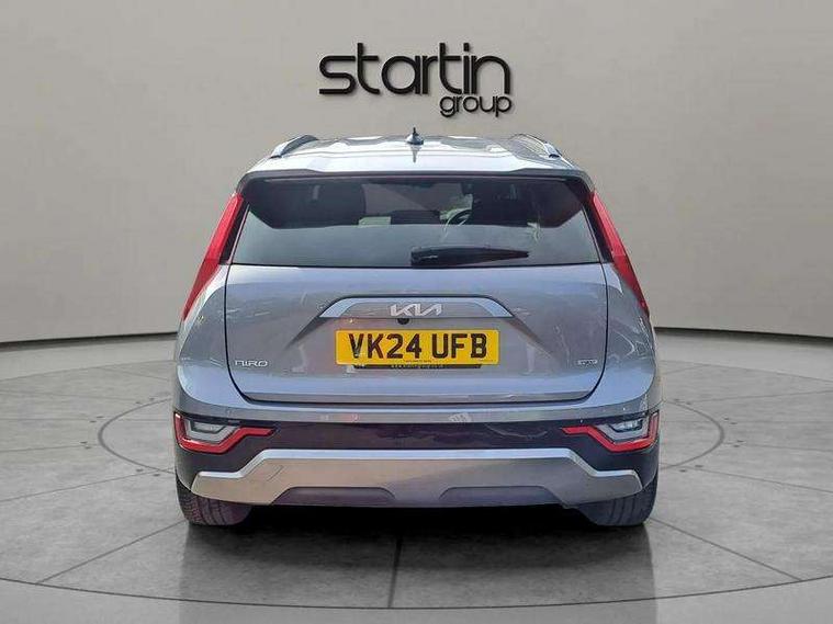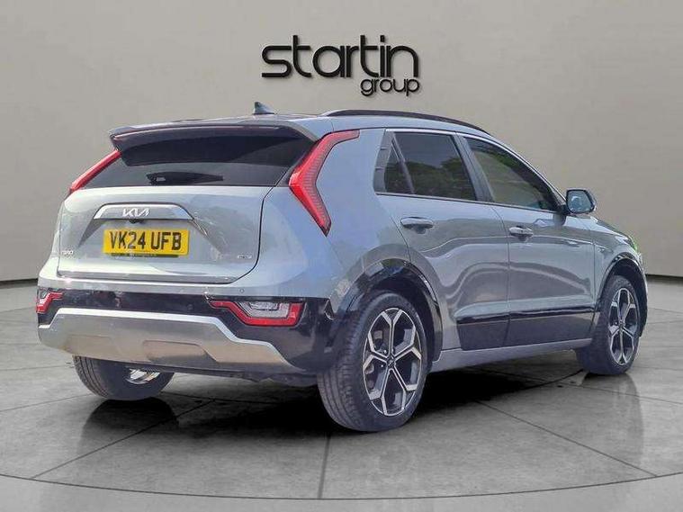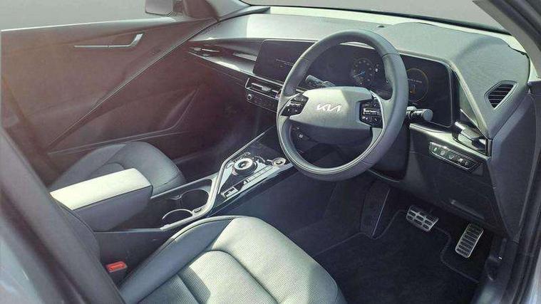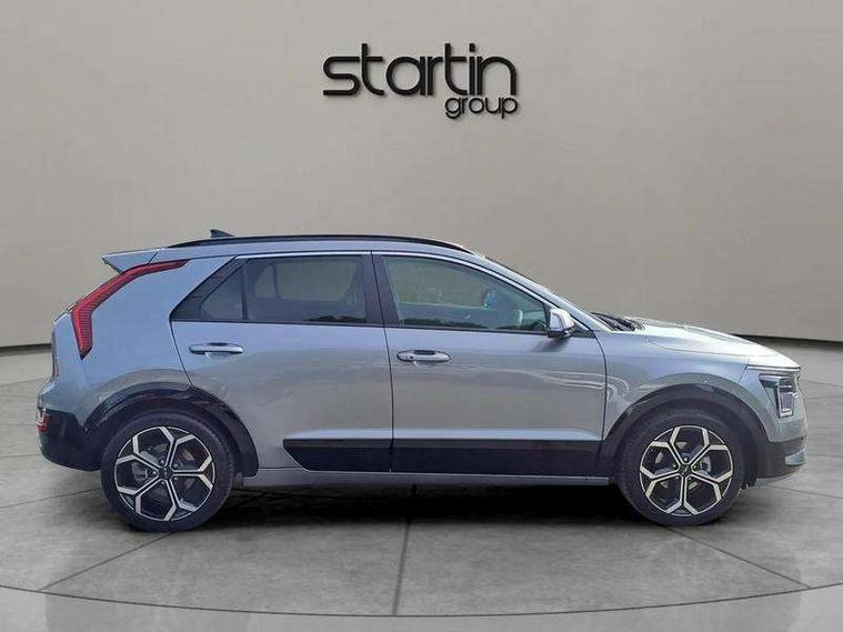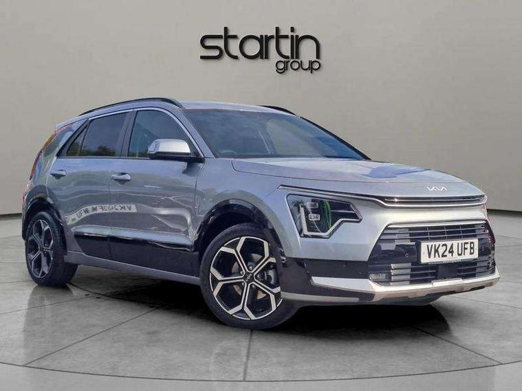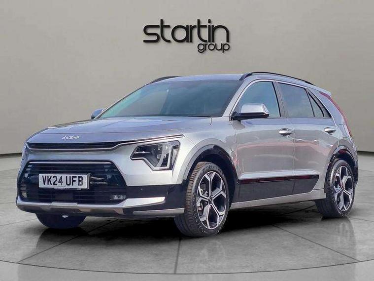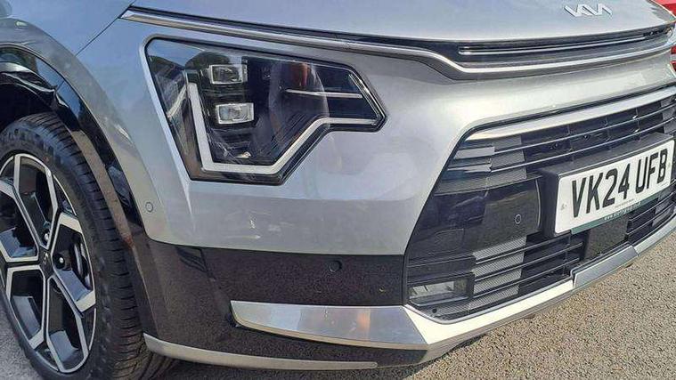 10.25" Supervision colour cluster display, 10.25" touchscreen satellite navigation, Adaptive smart cruise control function (SCC) with stop and go, Apple car play/Android Auto with voice control, Blind spot collision avoidance assist, Drive mode select (Eco, sport), E-call, Emergency stop signalling system, Forward Collision-Avoidance Assist (FCA) 1.5 - City/Pedestrian/Cyclist/Junction turning, Front parking sensors, Head up Display, Highway Driving Assist (HDA), Kia Connect (UVO), Lane Following Assist (LFA), Lane keep assist, Motor driven power steering, Parking collision avoidance assist (PCA), Power opening/closing tailgate, Rear cross traffic alert, Rear parking sensors, Remote smart parking assist, Reversing camera with dynamic guide lines, Safe exit warning (SEW), Speed limit assist, Trip computer with distance/fuel consumption/average speed, Wireless Smartphone charger, 220v AC Inverter, 'Shark fin' mobile antenna, 2 Front USB Charge port (one for C-type/one for USB), 2 type C USB ports on front seats, 6 speakers, Bluetooth with music streaming, DAB Digital radio, Steering wheel mounted controls, Acoustic windshield, All round electric windows with drivers and front passenger auto up/down and safety function, Auto dimming rear view mirror, Automatic defog system, Automatic headlight control system, Black grille with chrome surround, Body colour bumpers, Body colour exterior door handles, Deluxe door scuff plates, Dual LED headlights (low and high projection), Electric heated door mirrors, Electrically folding door mirrors, Front and rear chrome skid plates, Front fog lights, Heated rear window with timer, High gloss black cladding, High gloss black door mirrors, LED daytime running lights, LED rear combination lights, LED third brake light, One touch single tilting/sliding power sunroof, Privacy glass - Rear windows and tailgate, Rain sensing front wipers, Rear fog lights, Rear side wing doors, Rear spoiler, Rear wiper, Roof rails, Solar glass windscreen, Welcome and follow-me home light functionality, Windscreen Washer Level Warning, 12V socket in front, 12V socket in luggage compartment, 3 seat bench in 2nd row, 60:40 split remote folding rear seats, All-round height adjustable headrests, Aluminium pedals, Artificial leather centre console storage box, Artificial leather steering wheel, Centre console cupholder, Chrome coating interior door handles, Driver and front passenger power adjusted seat, Driver power adjusted memory seat, Driver/passenger sunvisors with illuminated vanity mirrors, Drivers seat power lumbar support, Dual zone automatic air conditioning, Front and rear door storage, Heated front seats, Heated outer rear seats, Heated steering wheel, Illuminated glovebox, Interior door lock/unlock function, ISOFIX Child seat top tethers and anchor fixings, LED overhead console, 2nd row and luggage lamp, Luggage area load cover, Luggage board, Paddle shifts, Passenger premium relaxation seat, Power adjustable lumbar support on front passenger seat, Rear armrest, Seatback pocket - driver, Seatback pocket - front passenger, Shift by wire SBW, Single front passenger seat, Tilt/telescopic adjustable steering wheel, Vegan leather upholstery, Ventilated front seats, Ventiliation ducts to rear compartment, Towing pack - Niro, 3 point seatbelts on all seats, ABS, Automatic unlocking of doors in case of impact, Centre side front airbags, Curtain and side airbags, Drivers knee airbag, Dual shell horn, Electric parking brake with auto hold function, Electronic stability control, Front passenger airbag deactivation, Height adjustable front seatbelts, Hill start assist control (HAC), Manual rear child locks, Rear seat alert system, Traction control, Tyre pressure monitoring system, Alarm system and engine immobiliser, Deadlocks, Engine Start/Stop Button with Smart Entry System, Locking wheel nuts, Visible vehicle identification number, Warranty - 7 Years/ 100, 000 miles, Centre fascia chopped carbon, 18" Alloy wheels, Tyre mobility kit,