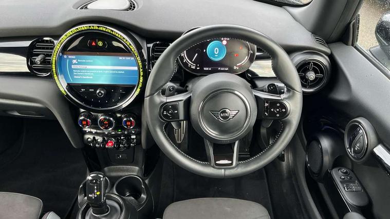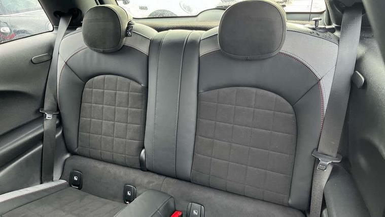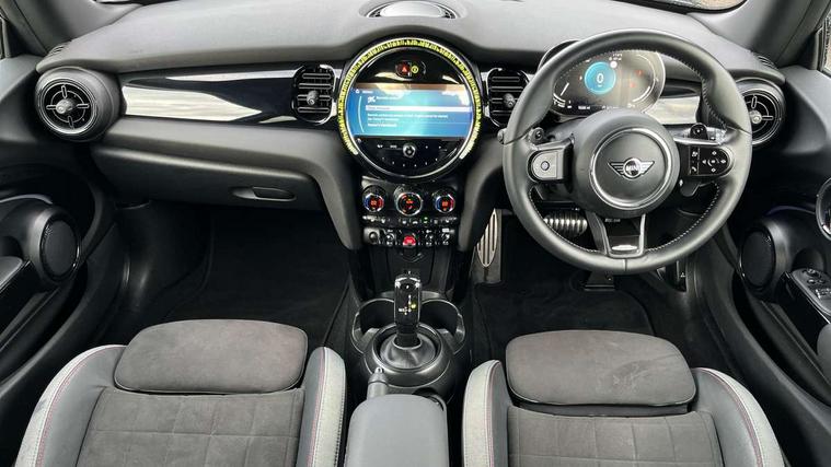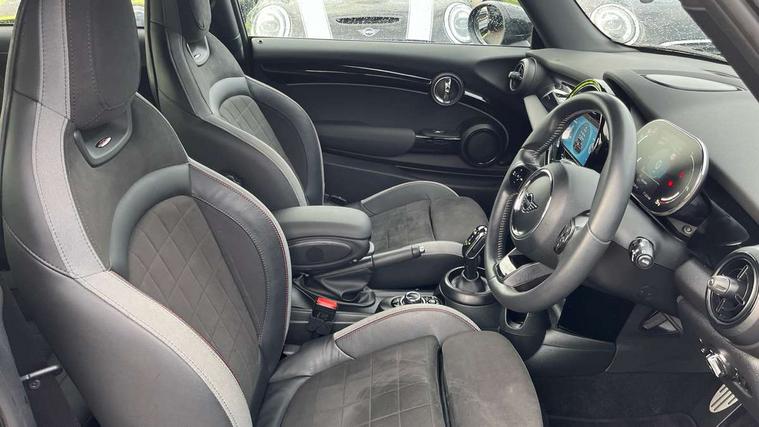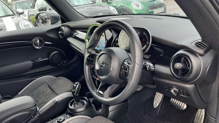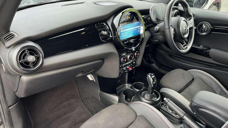 Apple CarPlay, Automatic start/stop function with brake energy recuperation, Compatible mobile phone bluetooth with audio streaming, Cruise control with brake assist, Electro-mechanical speed dependant steering assistance, Flexible car sharing preparation, Instrument cluster, MINI Driving Modes - centre toggle switch to control driving setting (sport, mid and green), Mini E-call, MINI TeleServices, On board computer, Rear park distance control, Service interval indicator, Double Vanos system, Fully variable valve control, High precision injection, Intelligent adaptive suspension, Performance Control, Steptronic sport transmission with double clutch and steering wheel paddles, 8.8" touchscreen with LED ring, FM tuner and DAB digital radio, 3rd brake light, Automatic headlight activation switch, Bonnet scoop, Dynamic brake lights, Electric front windows, Heated rear window, Heated windscreen washer jets, JCW Aerodynamic kit - Front and rear bumpers with sporty JCW styling and part-painted side sills with MINI John Cooper Works door sill finishers, John Cooper Works rear spoiler, LED headlight with closed ring and daytime driving lights, Metal door sill strips with Cooper S, Model logo Cooper S on right of tailgate, Radiator grille chrome border with honeycomb structure including S Badge, Rain sensor window wipers, Rear fog lights, Rear LED lights with union jack design, Rear window wiper, Side scuttle panel with integrated indicator, Sun/heat protection glass, Two central exhaust tailpipes with chrome finisher, White indicator lenses, 12V Accessory socket in centre console, 2 seat bench in 2nd row, 4 lashing eyes in luggage compartment, 60/40 split folding rear seat, Anthracite headliner including grab handles and clothes hooks, Carbon black colour line - Knee roll and door armrest, Chrome interior highlights, Cupholders, Front and rear isofix with front passenger airbag deactivation, Front floor mats in velour, Glove compartment, Height and length steering column adjustment, Interior lighting with 12 different colours across the dashboard, underneath door bezel with illuminated laser-engraved design on central display, JCW Sport seats with integrated headrests, adjustable thigh support and John Cooper Works logo, Leatherette gearshift lever and handbrake gaiters, LED reading lights, vanity mirror lights, front foot well light and spotlight on front seats, Manual air conditioning, Mechanical seat adjustment - forward/back & backrest for front seats and driver seat height adjust, Multifunction steering wheel, Passenger seat height adjuster, Single front passenger seat, Storage compartments in doors, Storage pocket on back of front seats, Sunvisors with vanity mirrors, Walknappa leather steering wheel with grey seam and John Cooper Works badge on Piano Black lower steering wheel spoke, Piano black exterior pack - Mini Hatchback Cooper S, 3 point seatbelts on all four seats, 6 Airbags - front, side, head and seat belt tensioners, Anti-lock braking system (ABS), DSC - Dynamic Stability Control, Front and rear disc brakes, Two tone horn, Tyre pressure monitoring system, Alarm system with tilt sensor, monitoring doors, bonnet interior and tailgate, Electronic vehicle immobiliser, Start/stop toggle with keyless go, Piano black interior trim, Tool kit,