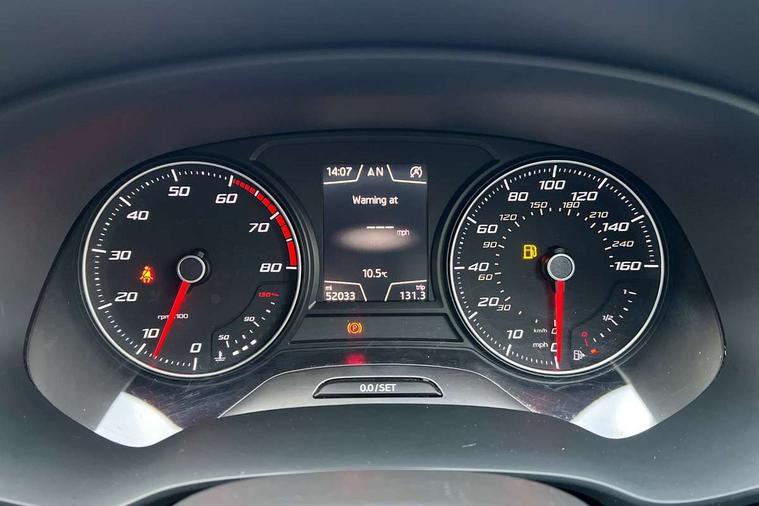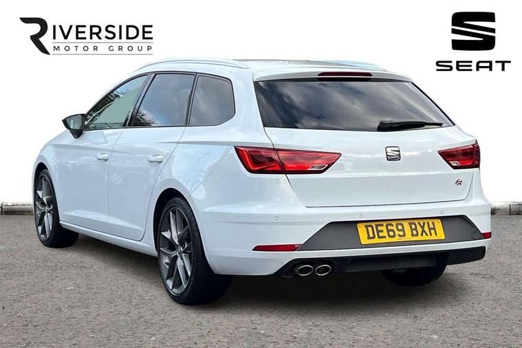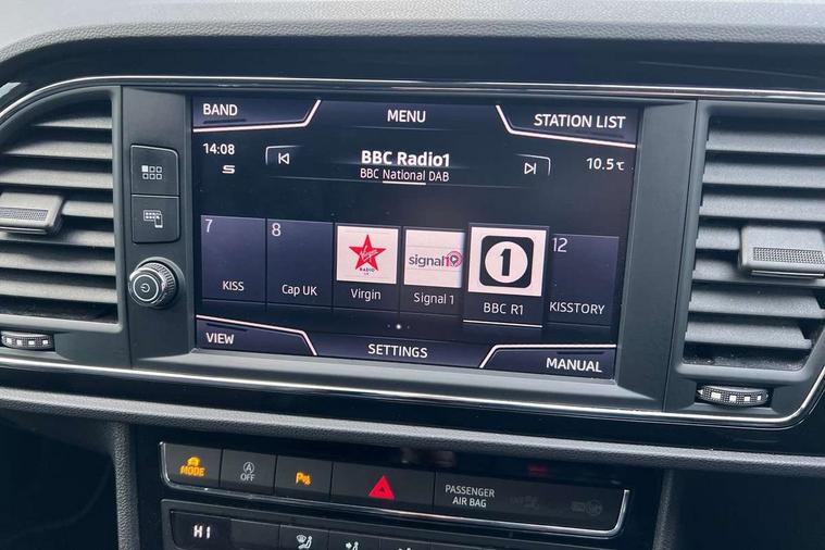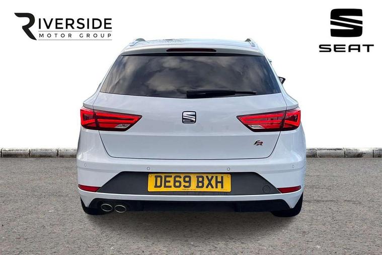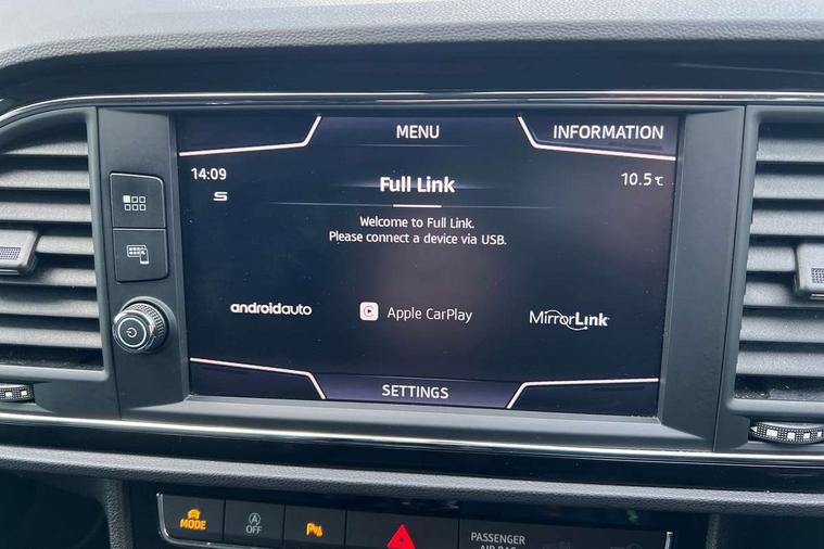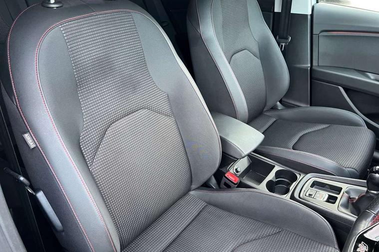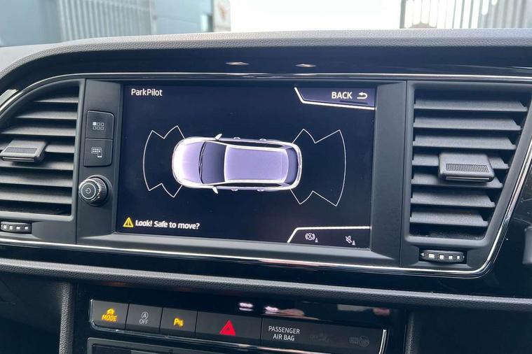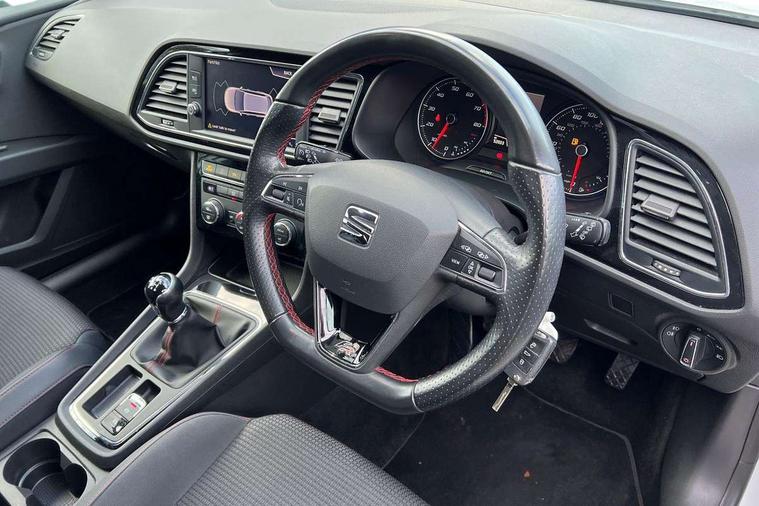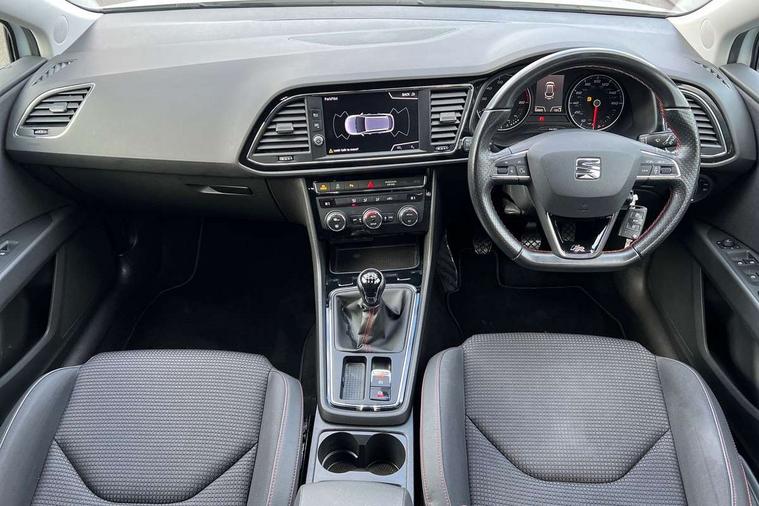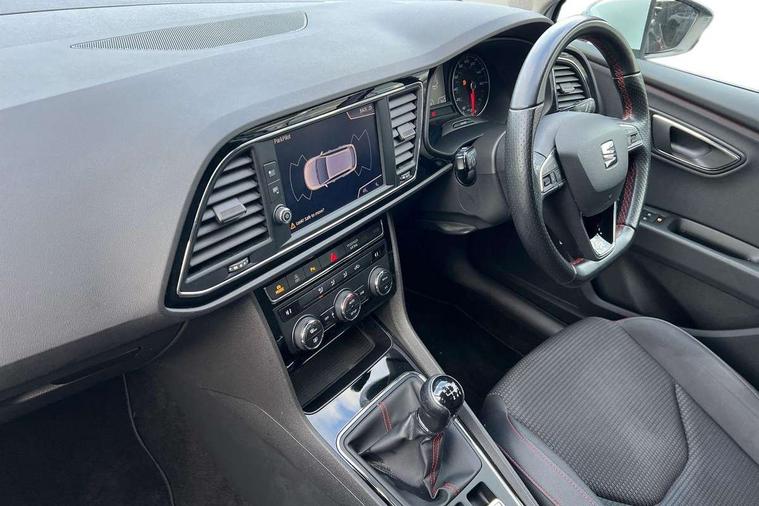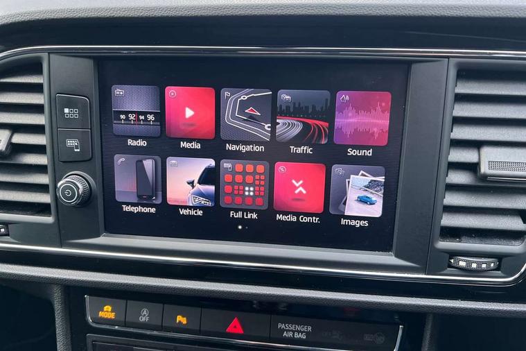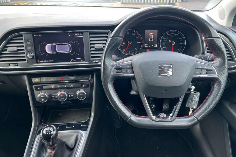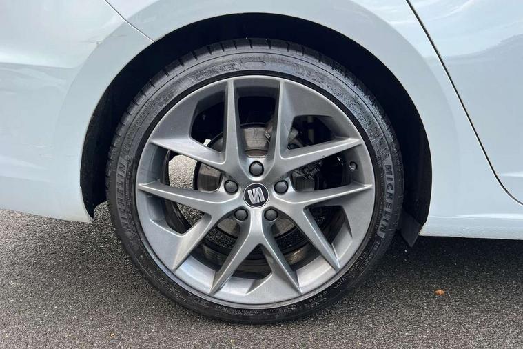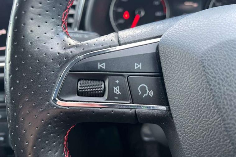 'Lights On' Reminder warning buzzer, 3D map display, 8" touch screen, Bluetooth Handsfree Phone Connection, Electro-mechanical power steering, Front and rear parking sensors, Front assist with pedestrian protection, Full Link Smartphone Integration with Mirror Link, Apple Car Play, Google Android Auto, Low fuel warning light, Navigation system (incl. media system plus), Outside temperature gauge, RPM counter, SEAT Drive profile, SEAT logo boot release, Service interval indicator, Trip computer, Voice recognition, Lowered sports suspension, XDS electronic differential lock, 2x SD card slot, 4 USB, 8 Speakers, Auxiliary input socket, Bluetooth audio streaming, CD player, DAB Digital radio, High resolution colour driver display, Media system plus (incl. media system colour), SEAT USB media cable, Steering wheel mounted audio/phone controls, Black radiator grille, Body colour door handles, Body coloured bumpers, Body coloured exterior mirrors with integrated LED indicators, Chrome roof rails, Chrome-plated radiator grille surround, Dark tinted rear windows, Electric front/rear windows, Electrically adjustable door mirrors, Electrically foldable exterior mirrors with parking position and passenger-side mirror with lowering function, Exclusive FR front and rear bumpers, Heated door mirrors, High gloss black finish B and C pillars, Illuminated aluminium front door sill with FR logo, LED front fog lights, LED headlights with LED day time running lights + LED rear lights + LED number plate lights, Rear wash/wipe, Visible twin exhaust tailpipes, 12v power point in centre console, 60/40 split folding rear seat with armrest, Active front headrests and 3 rear headrests, Additional heating and ventilation outlet in rear of centre console, Boot storage net, Cargo rings in boot, Double boot floor, Driver and passenger seat height adjust, Driver seat lumbar adjustment, Dual zone climate control, Dust/pollen filter, Flat bottomed perforated leather steering wheel with red stitching and FR logo, Front adjustable head restraints, Front armrest with storage box, Front cupholders x 2, Front seatback storage pockets, Front sport seats in Techny cloth, Front/rear floor mats, Gear shift indicator, Height/reach adjust steering wheel, High centre console with integrated box & cup holder, rear air outlet, with armrest in front seats, Illuminated door sills, Instrument lighting with brightness control, Luggage compartment cover, Luggage tie-down hooks, Multi-colour ambient interior lighting, Passenger seat lumbar adjust, Rear top tether child seat ISOFIX attachment, Storage box under drivers seat, 3 point seatbelts on all rear seats, 7 airbags - 2 front, 2 front side, 2 curtain, 1 knee, ABS + TCS, Child proof door locks, Electric handbrake, Electronic parking brake with auto hold, ESC with tyre pressure warning indicator, ESP+EBA, Front seatbelt pretensioners, Front seatbelt reminder, Hill hold control, Manual passenger airbag deactivation function, Multi-Collision braking, 2 folding remote keys with window open/close function and boot opening/door mirror folding function, Central locking fuel filler cap, Engine immobiliser, Locking wheel bolts, Remote central locking + deadlocks, Volumetric alarm with back up horn, Chrome interior detailing, 17" Dynamic alloy wheels 30/2,