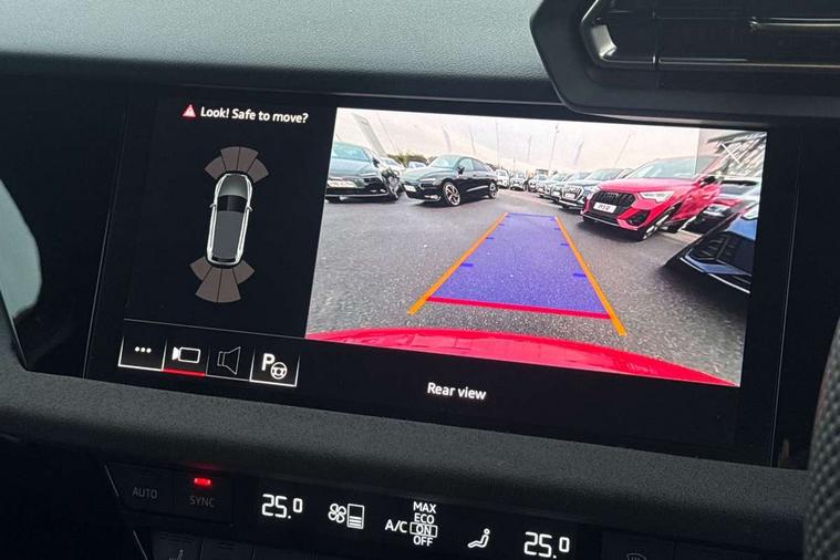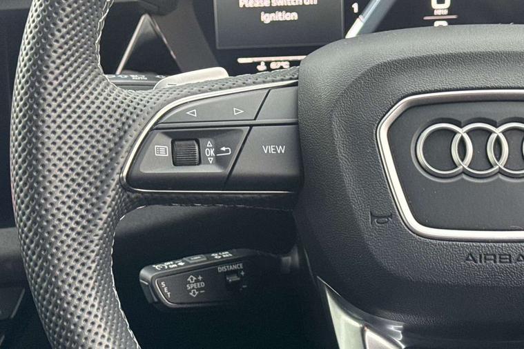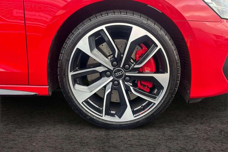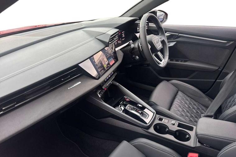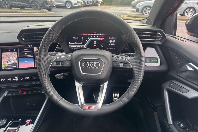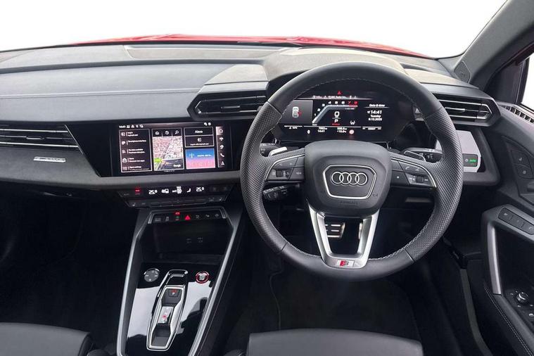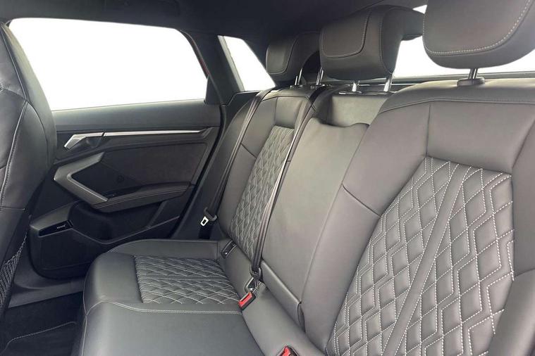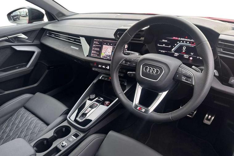Adjustable speed limiter, Audi drive select, Audi smartphone interface with app store includes wireless Apple carplay, Android auto and Amazon alexa integration, Audi virtual cockpit plus - 12.3" full HD resolution dynamic digital instrument cluster, Automatic start/stop system with recuperation, Bluetooth interface, Camera based traffic sign recognition, Collision avoidance assistant, Distraction and Fatigue warning, e-Call (emergency call), Emergency assist, Lane departure warning system, MMI Navigation Plus with high resolution 10.1" colour touch screen display, Park Assist with parking system Plus, Progressive steering, Service indicator, Tailgate, Trip computer, Voice control system with natural language interaction, quattro permanent all-wheel drive with torque splitter, S sport suspension with spring damper adjustment and lowering by 15mm, Audi Phonebox light with wireless charging, DAB Digital radio, USB ports with charging function in the rear, All weather light, Anthracite grey Audi rings (front and rear), Audi Beam uses LEDs to project the rhombus S logo onto the ground as you exit your S3, Auto dimming frameless rear view mirror, Automatic dynamic range control, Black accents front and rear bumpers including air inlets, Black accents in front grille and frame, Black accents in window trims, Dipped beam, main beam, position light and turning light, Electrically adjustable/heated/folding/auto dimming door mirrors with integrated LED indications + kerb view function for passenger side, Exterior model badging, Front electric windows, Headlight washers, Heat insulating glass windscreen, Illuminated door sills with aluminium inserts at the front with S logo, Intersection light, LED 3rd brake light, LED brake lights, LED daytime running x3, LED headlights with LED rear lights and dynamic rear indicators, LED rear number plate lights, LED reverse light, LED tail lights, Light and rain sensors, Manoeuvring light, Motorway light, Privacy glass - dark tinted rear window, rear door and side windows, Rear diffuser and grill in grained matt black with inlay in dark liquid chrome, Rear electric windows, Rear side wing doors, Rear wiper, S grille, S3 front bumper with S specific air intake grilles, S3 roof spoiler, Static cornering light, 12V socket and storage compartment in front centre console, 3 seat bench in 2nd row, 3 spoke flat bottomed leather multifunction sport steering wheel with gear shift paddles, 3-zone deluxe automatic air conditioning, 4 way electrically adjustable lumbar support for driver and front passenger, 40/20/40 split folding rear seat bench, Black cloth headlining, Black front and rear floor mats, Fine Nappa leather upholstery with front sports seats S embossed logo, Front and rear centre armrest in artificial leather with contrasting stitching on armrests and instrument panel, Front and rear headrests, Heated front seats, Height and reach adjustable steering wheel, Manual boot compartment lid, Manually adjustable front seats, Rear centre armrest with cupholder, S badging on the steering wheel, Seat side bolsters, Single front passenger seat, Stainless steel pedals and front footrest in black, Aluminium interior elements pack - A3, Storage package - A3, Technology package - A3, 3x3 point rear seat belts, Driver and front passenger airbag with passenger airbag deactivation, Electronic Stabilisation Control (ESC) including ABS, ASR and EDL, First aid kit with warning triangle and 2 safety vests, Front side airbags with head airbags and interaction airbag, Hill hold assist, Pre-sense front with pedestrian and cyclist detection, Seatbelt monitoring, Tyre pressure loss indicator, Anti theft alarm, Anti-theft wheel bolts, Electronically operated child locks, Immobiliser, Remote central locking with safelock, Black dashboard, Tyre repair kit,