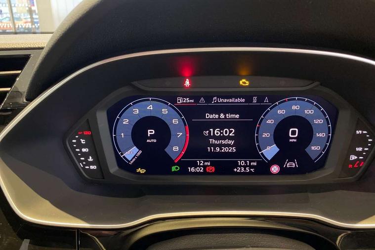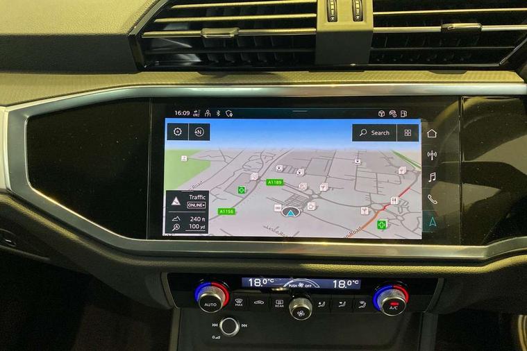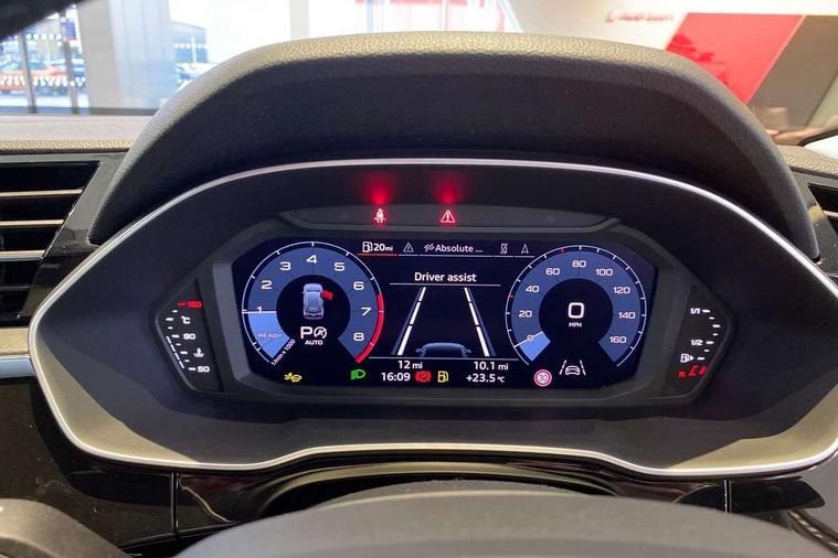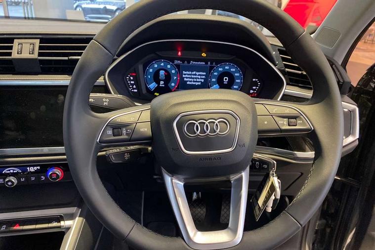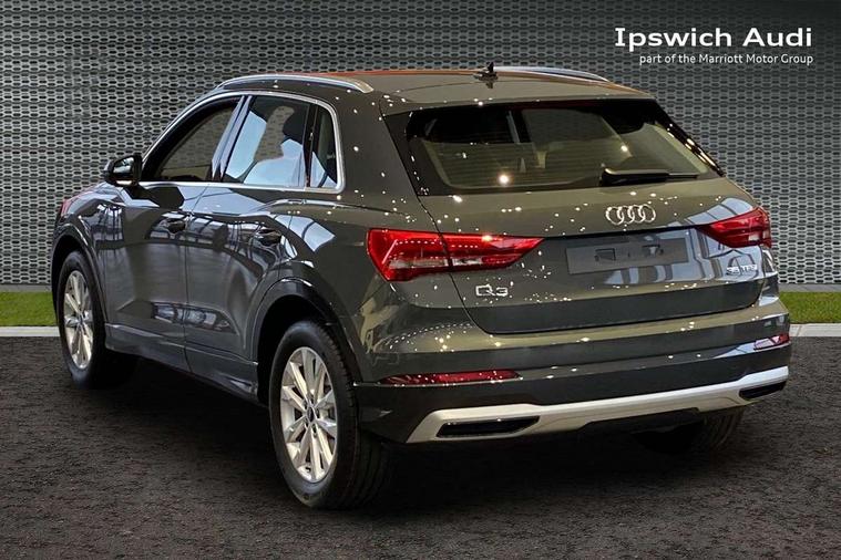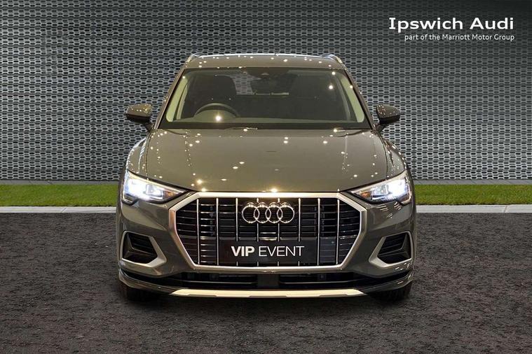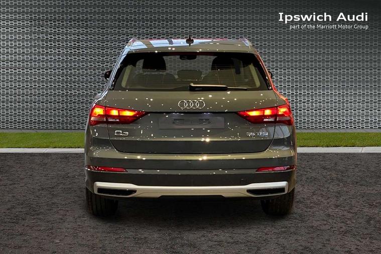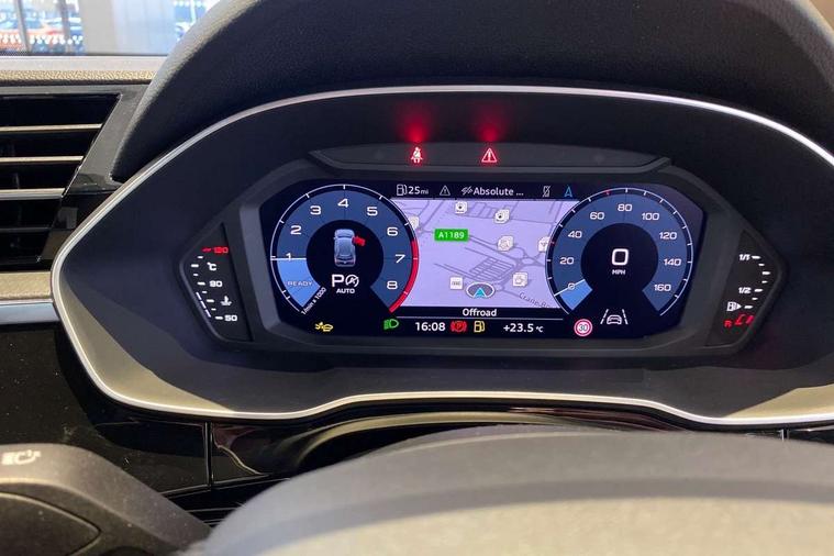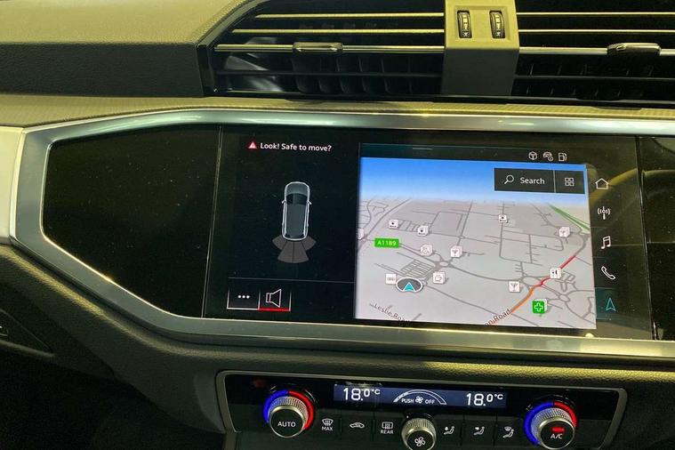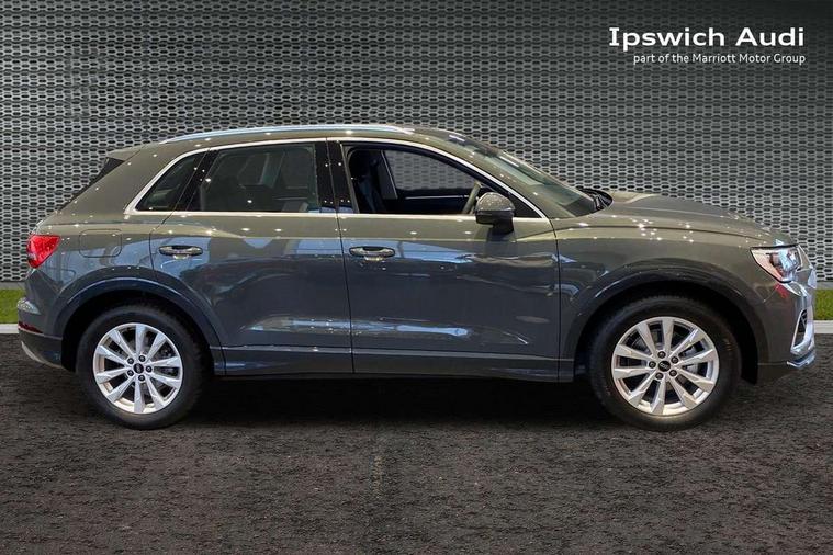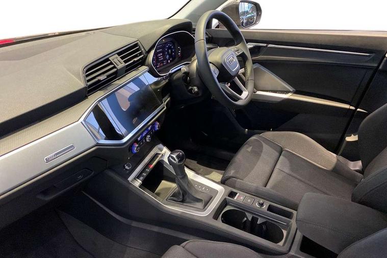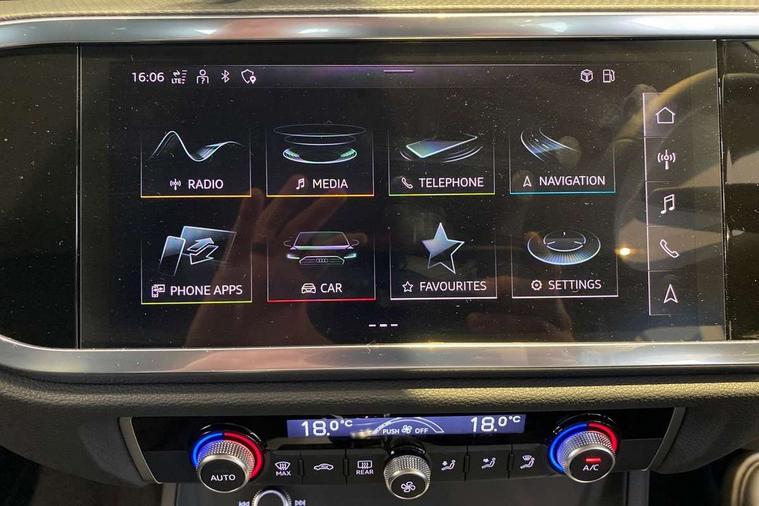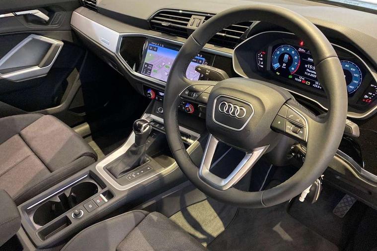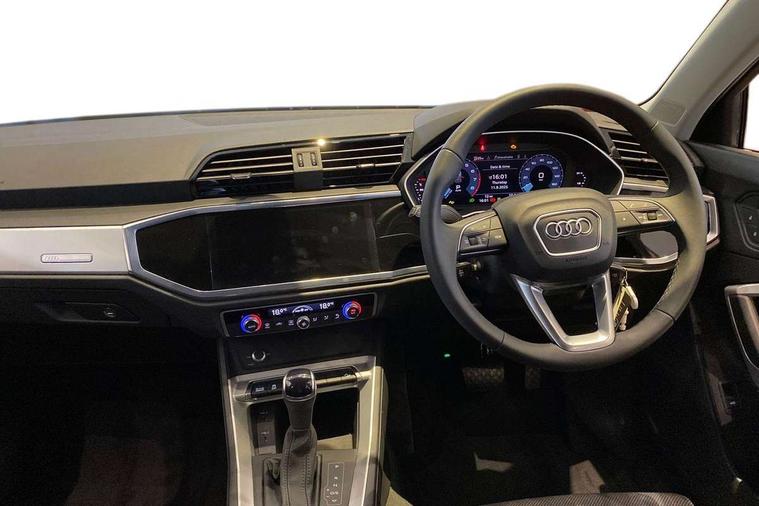 Audi connect, Audi drive select, Audi lane departure warning, Audi side assist, Audi smartphone interface, Audi Virtual Cockpit - 10.25" display, Bluetooth interface, MMI navigation plus with MMI touch, Power opening/closing tailgate, Progressive steering, Service interval indicator, Stop/start system, Voice control system, DAB digital radio module, Acoustic windscreen, Aluminium roof rails, Aluminium window trim, Auto dimming rear view mirror, Body colour door mirrors, Electrically adjustable and heated door mirrors with integrated LED side indicators, Front and rear electric windows, Front fog lights, Front side air inlets in matt selenite silver, Front spoiler in matt selenite silver, Grille vertical bars in aluminium silver/Matt, High gloss black finish B and C pillars, Rain and light sensors, Rear diffuser strip in selenite silver, Titanium black radiator grille, 12V socket in rear centre console, 40:20:40 split folding rear bench seat, Aluminium door sill trims, Dual zone climate control, Front and rear headrests, Front and rear velour floor mats, Front centre armrest with storage compartment and angle adjustment, ISOFIX child seat mounting and Top Tether with front passenger airbag deactivation, Lunar silver cloth headlining, Manual front seats with height adjustment, Stainless steel luggage compartment sill finisher, Non smoking pack - Q3, 3x3 point rear seatbelts, 6 airbags - Driver, front passenger, curtain and side windows, Audi pre-sense front with pedestrain and cyclist recognition, Electronic stabilisation control including ABS, ASR and EDL, Hill hold assist, Pre sense basic, Seatbelt monitoring, Tyre pressure warning, Warning triangle and first aid kit, Anti theft alarm, Anti theft wheel bolts, Remote central locking, MMI touch colour display in gloss black with aluminium surround,