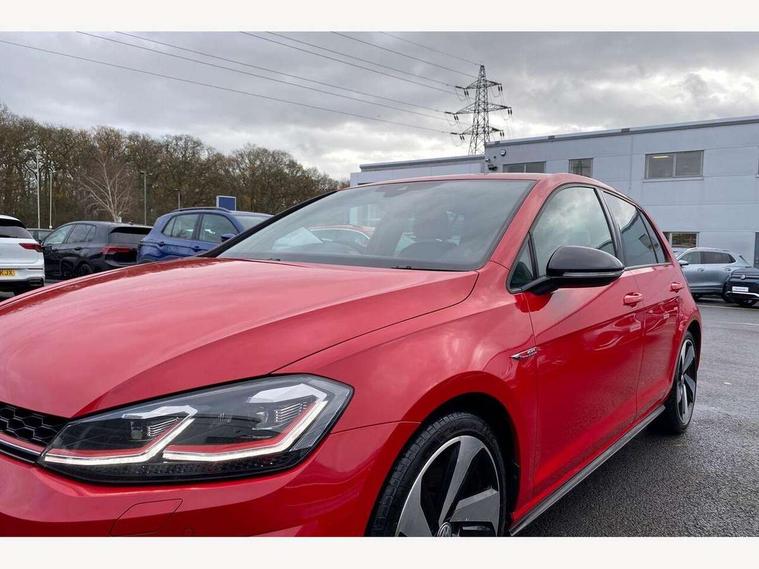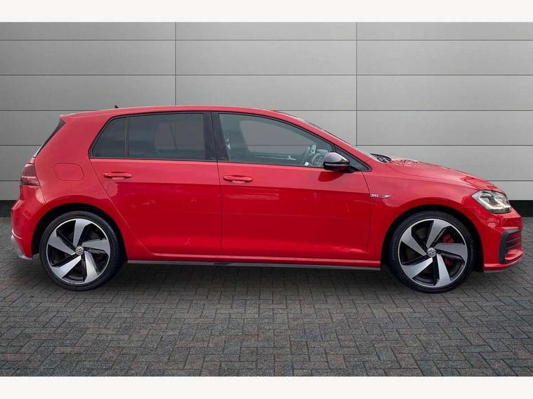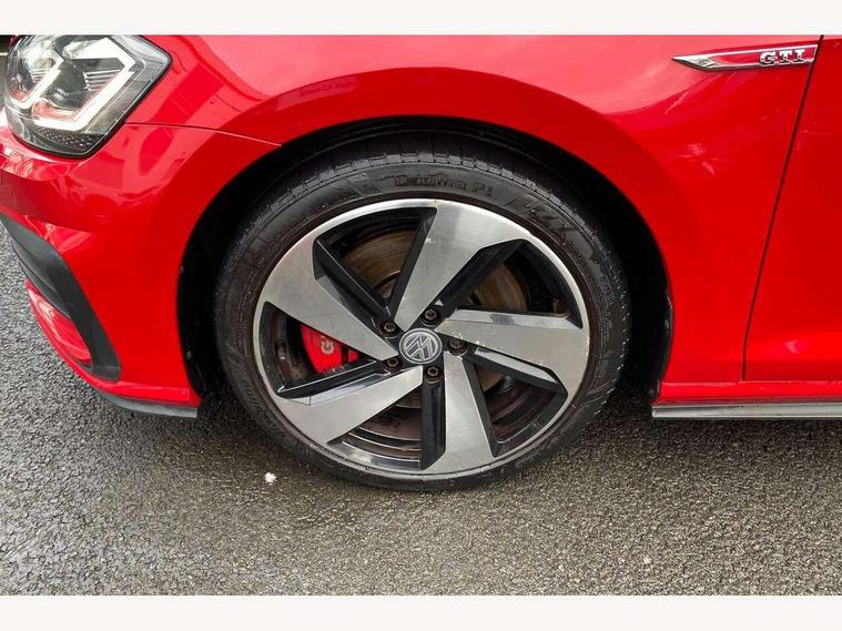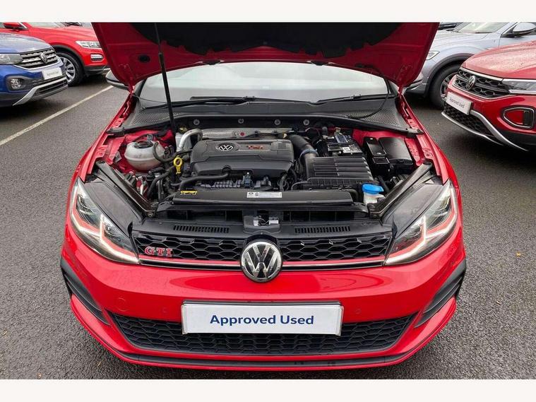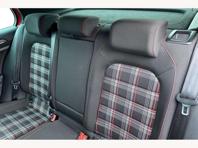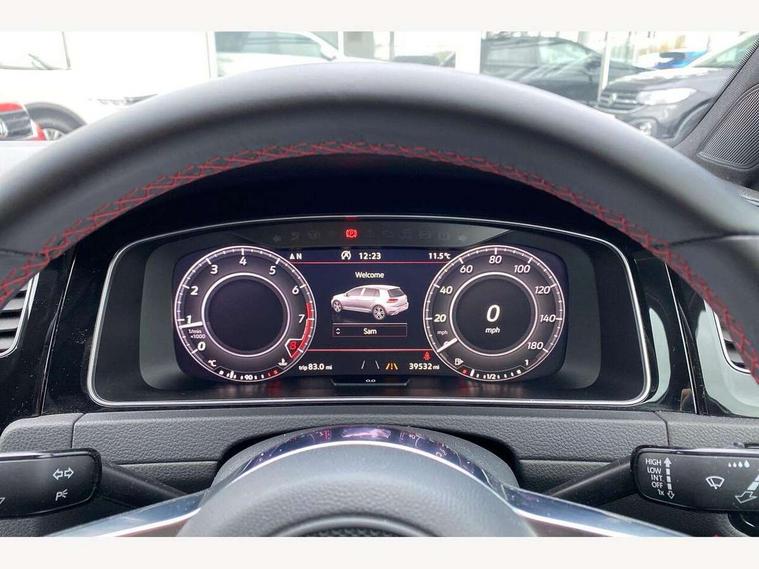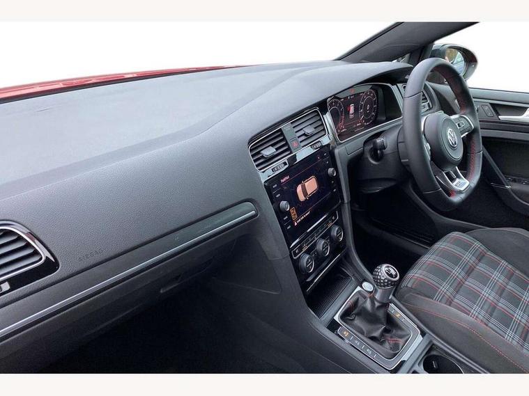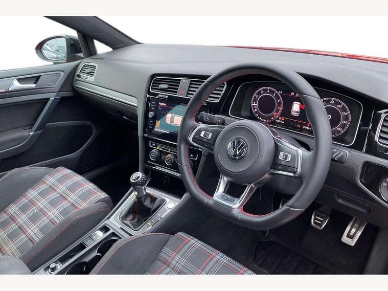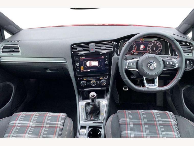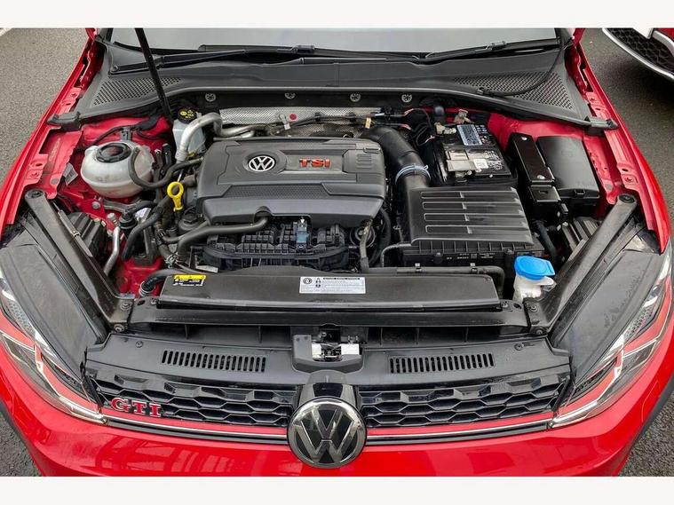 'Lights On' Reminder warning buzzer, ACC - Adaptive cruise control with front assist, forward collision warning, distance monitoring, city emergency brake and speed limiter, Bluetooth telephone and audio connection for compatible devices, Brake pad wear indicator warning light, Driver alert system, Driver profile selection, Driving Mode Selection with four preset modes - Eco, normal, sport or individual modes, Instrument cluster in white, Lane assist with dynamic light assist and traffic sign recognition, Multifunction computer with visual gear change recommendation for fuel consumption, Power assisted speed sensitive electro-mechanical steering, Push tank flap, Rear view camera, Speedo, rev counter, electronic odometer, trip, service interval display, exterior temperature and fuel gauge, Stop/start system, Warning buzzer and light for front seatbelts unfastened, Battery regeneration during braking, Limited slip differential, Lowered sports suspension, XDS electronic differential lock, Composition media system, DAB Digital radio receiver, MP3/WMA compatability, Multi device interface (MDI) with USB connection, Premium USB cable in choice of either Apple or Android smartphone compatibility, SD card slot, SMS Functionality, USB and SD card connectivity, Volkswagen media control, 3D-LED tinted rear light clusters with indicator sweep function, Black rear diffuser, Body colour door handles, Body colour door mirrors with integrated indicators, Body colour rear roof spoiler, Body colour sports bumpers, Dusk sensor + automatic driving lights, Electric front windows, Electric rear windows, Electrically adjustable and heated door mirrors, Fully galvanised body, GTI logo in red on front and back, GTI logo lettering on front wings on right and left, Heated rear windscreen, High level 3rd brake light incorporating LED Technology, Honeycomb radiator grille - black, LED daytime running lights, LED front fog lights with static cornering light function, LED headlights with dynamic light assist, Rear fog lamp, Rear window aerial, Rear window wash/wipe with intermittent wipe, Reflectors in all doors, Shiny black aerofoil downside, Sill extensions, Twin exhaust tailpipe, Windscreen wipers/ intermittent wipe + 4 position delay, 12V socket in luggage compartment, 3 rear headrests, 4 load lashing points in luggage compartment, 60/40 split folding rear seat backrest, Bag hook in luggage compartment x 2, Black headlining, Climate control - 2 zone electronic air conditioning with automatic air recirculation and allergy filter, Cooled glovebox, Dust/pollen filter, Front + rear carpet mats, Front centre armrest with storage compartment and two rear air vents, Front seat back storage pockets, Grab handles front x 2, rear x 2 with integrated coat hooks, Height and reach adjustable steering wheel, Illuminated door sills, Illuminated vanity mirrors, Instrument lighting white adjustable panel illumination, Interior light delay, Isofix preparation for 2 rear child seats, Leather gear knob and handbrake grip, Load through provision with rear centre armrest and cupholders x2, Luggage compartment lighting, Multifunction leather steering wheel with GTI logo and selector lever boot grip with red stitching, Overhead storage box, Stainless steel pedals, Storage box in luggage compartment, Storage compartment in roof console with cover, Storage compartments in front doors, Storage compartments in rear doors, Stowable luggage compartment cover, Sun visors, Variable boot floor, height adjustable and removable, Ambient lighting pack - Golf, Convenience Pack - Golf, Light and Sight pack - Golf, Mirror pack - Golf, 3 rear three point seatbelts, Airbags - Driver's and front passenger's, curtain airbag, Driver's knee, front side impact and passenger's airbag deactivation switch, Anti-lock Braking System (ABS) with Hydraulic Brake Assist (HBA), Automatic post collision braking system, Child locks on rear doors, Driver/Passenger optimised head restraints, Electronic parking brake with auto hold, Electronic stability control (ESC) including Electronic differential lock (EDL) and ASR (Traction control) with deactivation via infotainment system, Front ventilated disc brakes and rear disc brakes, Pre crash preventive occupant protection, Red brake calipers, Three point height adjustable front seatbelts with tensioners, Tyre pressure loss indicator, Alarm with interior protection and deactivation via infotainment system, Electronic engine immobiliser, Keyless entry with start/stop button on centre console, Remote central locking with 2 remote folding keys, Chrome plated air vent surround, Chrome plated electric mirror adjustment light switch surround, Honeycomb black decorative inserts, Piano black centre console, Steel space saver spare wheel,