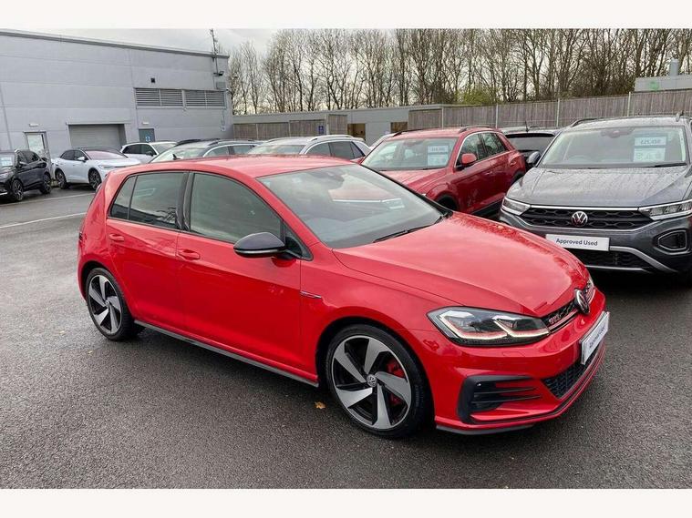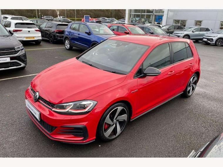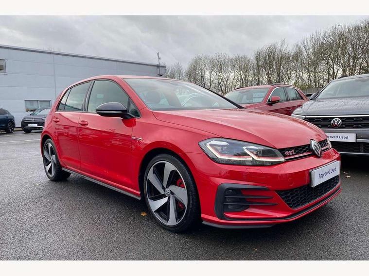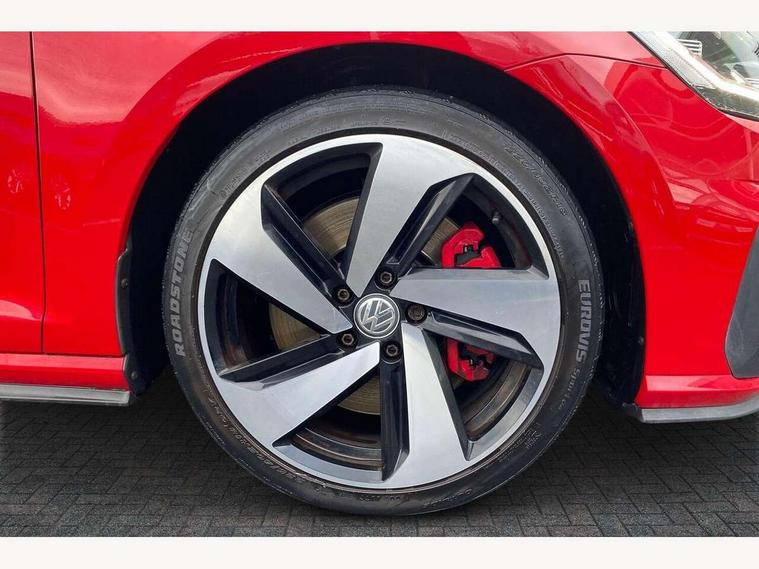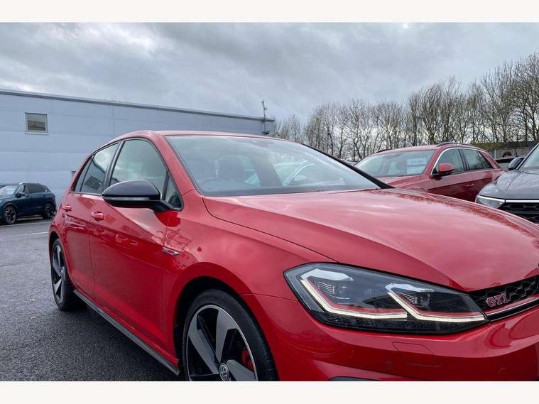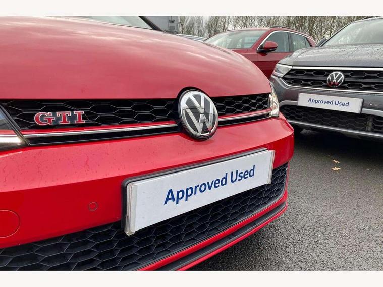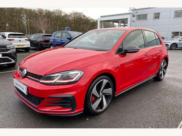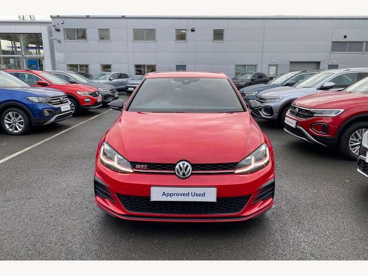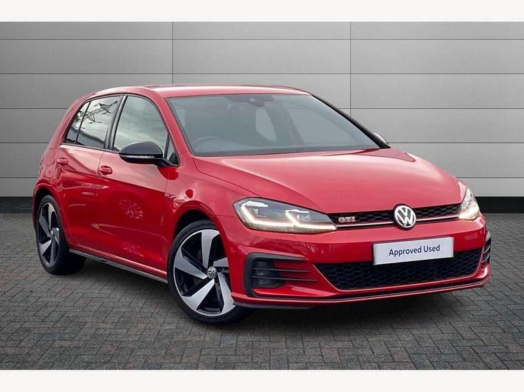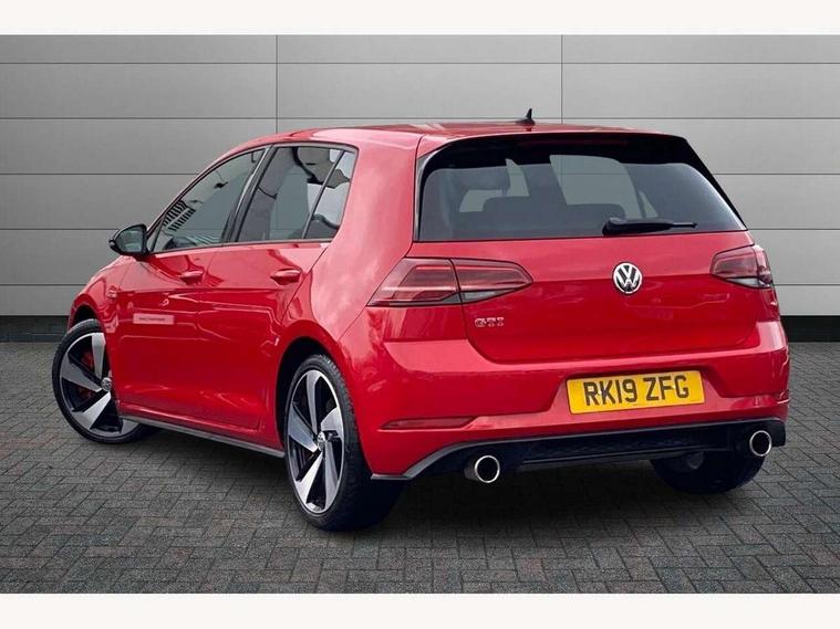 'Lights On' Reminder warning buzzer, ACC - Adaptive cruise control with front assist, forward collision warning, distance monitoring, city emergency brake and speed limiter, Bluetooth telephone and audio connection for compatible devices, Brake pad wear indicator warning light, Driver alert system, Driver profile selection, Driving Mode Selection with four preset modes - Eco, normal, sport or individual modes, Instrument cluster in white, Lane assist with dynamic light assist and traffic sign recognition, Multifunction computer with visual gear change recommendation for fuel consumption, Power assisted speed sensitive electro-mechanical steering, Push tank flap, Rear view camera, Speedo, rev counter, electronic odometer, trip, service interval display, exterior temperature and fuel gauge, Stop/start system, Warning buzzer and light for front seatbelts unfastened, Battery regeneration during braking, Limited slip differential, Lowered sports suspension, XDS electronic differential lock, Composition media system, DAB Digital radio receiver, MP3/WMA compatability, Multi device interface (MDI) with USB connection, Premium USB cable in choice of either Apple or Android smartphone compatibility, SD card slot, SMS Functionality, USB and SD card connectivity, Volkswagen media control, 3D-LED tinted rear light clusters with indicator sweep function, Black rear diffuser, Body colour door handles, Body colour door mirrors with integrated indicators, Body colour rear roof spoiler, Body colour sports bumpers, Dusk sensor + automatic driving lights, Electric front windows, Electric rear windows, Electrically adjustable and heated door mirrors, Fully galvanised body, GTI logo in red on front and back, GTI logo lettering on front wings on right and left, Heated rear windscreen, High level 3rd brake light incorporating LED Technology, Honeycomb radiator grille - black, LED daytime running lights, LED front fog lights with static cornering light function, LED headlights with dynamic light assist, Rear fog lamp, Rear window aerial, Rear window wash/wipe with intermittent wipe, Reflectors in all doors, Shiny black aerofoil downside, Sill extensions, Twin exhaust tailpipe, Windscreen wipers/ intermittent wipe + 4 position delay, 12V socket in luggage compartment, 3 rear headrests, 4 load lashing points in luggage compartment, 60/40 split folding rear seat backrest, Bag hook in luggage compartment x 2, Black headlining, Climate control - 2 zone electronic air conditioning with automatic air recirculation and allergy filter, Cooled glovebox, Dust/pollen filter, Front + rear carpet mats, Front centre armrest with storage compartment and two rear air vents, Front seat back storage pockets, Grab handles front x 2, rear x 2 with integrated coat hooks, Height and reach adjustable steering wheel, Illuminated door sills, Illuminated vanity mirrors, Instrument lighting white adjustable panel illumination, Interior light delay, Isofix preparation for 2 rear child seats, Leather gear knob and handbrake grip, Load through provision with rear centre armrest and cupholders x2, Luggage compartment lighting, Multifunction leather steering wheel with GTI logo and selector lever boot grip with red stitching, Overhead storage box, Stainless steel pedals, Storage box in luggage compartment, Storage compartment in roof console with cover, Storage compartments in front doors, Storage compartments in rear doors, Stowable luggage compartment cover, Sun visors, Variable boot floor, height adjustable and removable, Ambient lighting pack - Golf, Convenience Pack - Golf, Light and Sight pack - Golf, Mirror pack - Golf, 3 rear three point seatbelts, Airbags - Driver's and front passenger's, curtain airbag, Driver's knee, front side impact and passenger's airbag deactivation switch, Anti-lock Braking System (ABS) with Hydraulic Brake Assist (HBA), Automatic post collision braking system, Child locks on rear doors, Driver/Passenger optimised head restraints, Electronic parking brake with auto hold, Electronic stability control (ESC) including Electronic differential lock (EDL) and ASR (Traction control) with deactivation via infotainment system, Front ventilated disc brakes and rear disc brakes, Pre crash preventive occupant protection, Red brake calipers, Three point height adjustable front seatbelts with tensioners, Tyre pressure loss indicator, Alarm with interior protection and deactivation via infotainment system, Electronic engine immobiliser, Keyless entry with start/stop button on centre console, Remote central locking with 2 remote folding keys, Chrome plated air vent surround, Chrome plated electric mirror adjustment light switch surround, Honeycomb black decorative inserts, Piano black centre console, Steel space saver spare wheel,