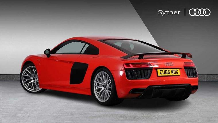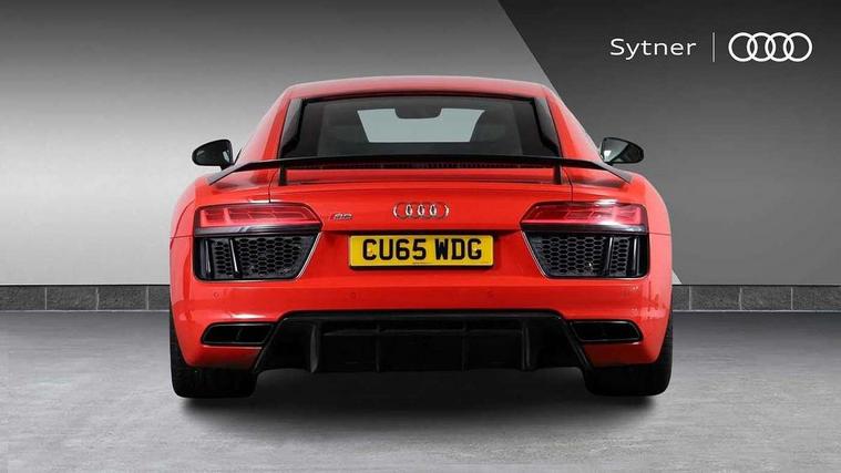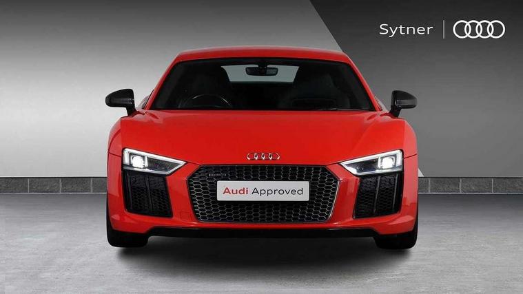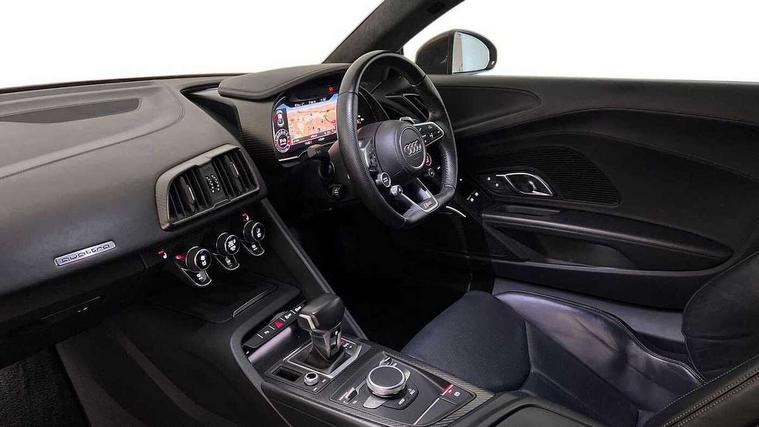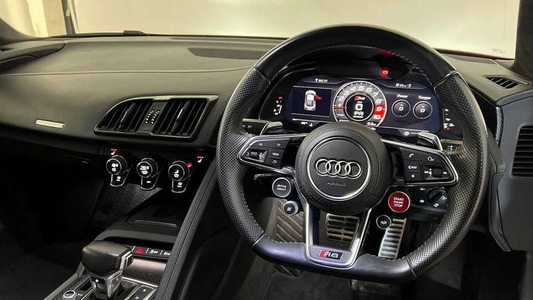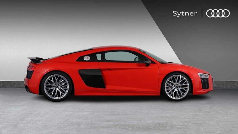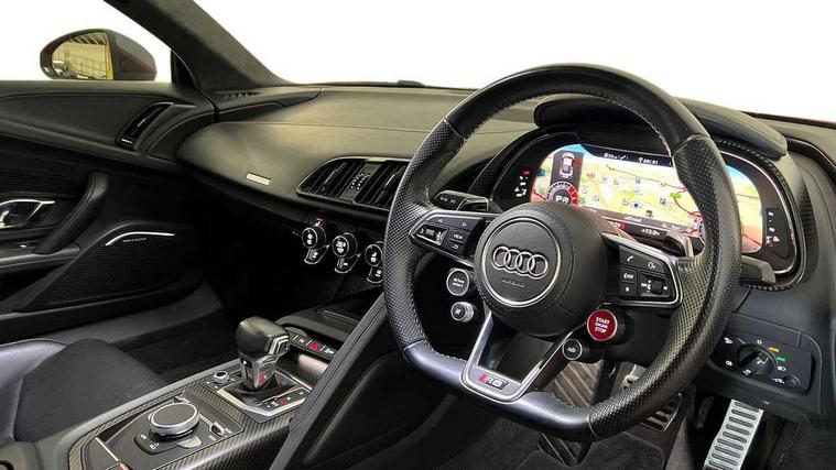 Audi connect, Audi drive select, Audi virtual cockpit - 12.3" high-resolution LCD display with fully customisable instrument cluster, Bluetooth connectivity with voice control, Driver's information system, EPAS, MMI navigation plus with DVD, SD card reader, 10GB music storage, V10 Plus sports suspension, 2 USB ports, Audi music interface, Audi sound system, Auxiliary input socket, DAB Digital radio, Aluminium fuel cap, Auto dimming rear view mirror with light and rain sensors, Body colour bumpers, Electric front windows, Exhaust tailpipes in high gloss black, Gloss anthracite black air outlets, Gloss Carbon front lip spoiler, Gloss Carbon rear diffuser, Gloss Carbon rear spoiler, Heat insulating glass, Heated rear window, High beam assistant, Honeycomb radiator grill in gloss anthracite grey, LED daytime running lights, LED rear lights, Adjustable steering column, Aluminium gear selector, Ambient lighting, Deluxe automatic climate control air conditioning, Door armrest in leather, Electric front seats + driver and passenger memory, Electric lumbar support, Heated front seats, Illuminated glovebox, Integrated front head restraints, Interior light with delay, Leather door inserts, Luggage compartment lighting, Multi function plus leather steering wheel with exhaust flap control + aluminium look shift paddles, Reading lights, Stainless steel pedals and foot rest, ABS/EBD, ASR, Ceramic brakes, Driver/front passenger airbag, EDL traction control, ESP, Front passenger airbag deactivation, Front side airbags, Gloss anthracite brake calipers, Hill hold control, Tyre pressure monitoring system, Warning triangle and first aid kit, Anti theft system, Electronic immobiliser, Locking wheel bolts, Preparation for tracking system, Remote central locking, Valet parking key, Extended inlays in Gloss Carbon surrounding Audi virtual cockpit and air vents, Leather centre console, Matt carbon inlay, Tyre repair kit,