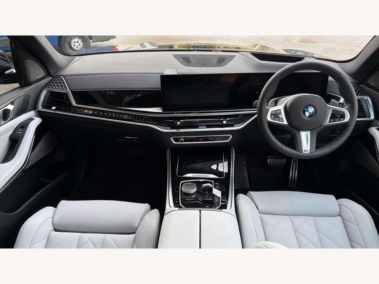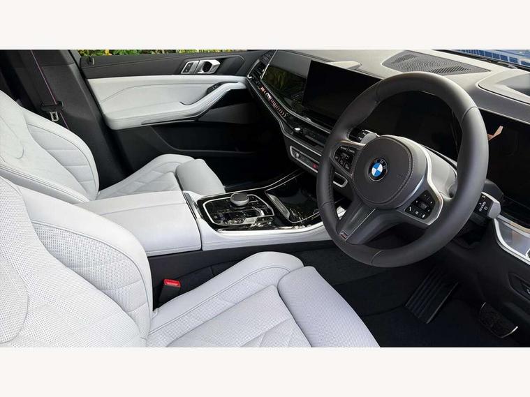 Attentiveness assist, Automatic tailgate operation, BMW ConnectedDrive online services, BMW live cockpit + with curved 12.3 instrument cluster/14.9 central display, nav/Tuner with diversity reception, RDS/4GLTE/remote software upgrade, BMW Recovery system, BMW Teleservices, Condition based service, Cruise control with brake assist, eCall emergency call system, Enhanced bluetooth with wireless charging, Integrated owner's handbook, PAS, Speed limiter, Wi-Fi hotspot, Drive performance control with ECO PRO comfort + sport mode, Eight speed steptronic sport automatic transmission and gearshift paddles on the steering wheel, Adaptive LED Headlights, Front and rear electric windows, High beam assistant, High gloss black shadow line roof rails, LED daytime running lights, Rain sensor, Rear side wing doors, Third brake light in rear spoiler, Variable intermittent rear wash/wipe, 12V - Power sockets with 2x centre console and 1x luggage compartment, 3 seat bench in 2nd row, Entry sills illuminated BMW inscription front and rear, Foldable rear centre armrest with 2 cupholders and storage compartment, Front and rear side armrest integrated into door trim, Grab handles in 1st and 2nd row of seats with Integrated in headliner, at rear with coat hooks, plastic, Headrests for all seats, Luggage compartment separating net, Lumbar support with height and depth adjustment in backrest, Single front passenger seat, Sunvisors with illuminated vanity mirrors and ticket pocket, Three spoke sport M leather steering wheel, Velour floormats, Ambient light interior pack - X5, Driving assistant pack with radar based driver assistance system - X5, Expanded exterior mirror pack - X5/X5 M, M aerodynamics pack - X5, Parking assistant pack - X5, 3 rear seatbelts, Active protection, Airbags - driver/front passenger, rear and side, first and second row seats head airbags, front passenger seat airbag deactivation + knee airbag, Anti-lock braking system (ABS), Automatic Stability Control (ASC), Brake energy regeneration, Cornering brake control (CBC), Crash sensor activating central locking release, hazard warning lights, fuel cut off, interior lighting + activation of safety battery terminal clamp, DSC - Dynamic Stability Control, Dynamic Traction Control - DTC, Electromechanical parking brake with automatic drive away release and auto hold function, Electronic brake force distribution, Hill start assistant, M Sport blue painted brake calipers with 'M' designation, Mechanical child proof lock on rear doors, Tyre pressure monitoring system, Tyre pressure sensors, Ventilated front and rear disc brakes, Warning triangle and first aid kit, Alarm system, Closing system with central locking, Comfort access system, Locking wheel bolts,