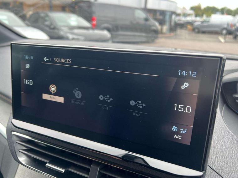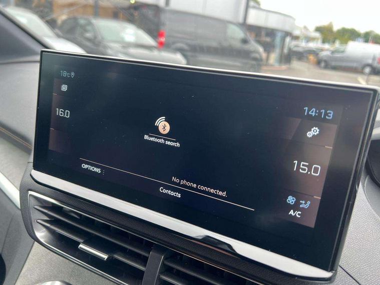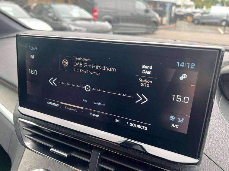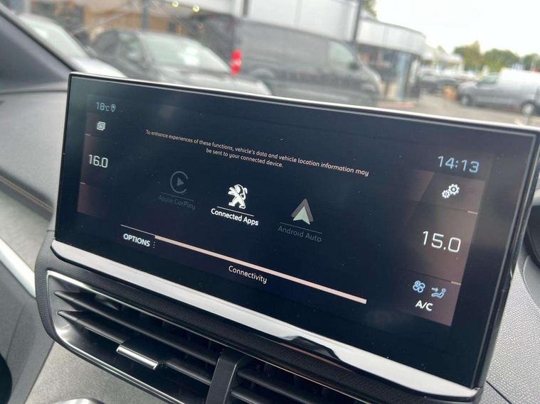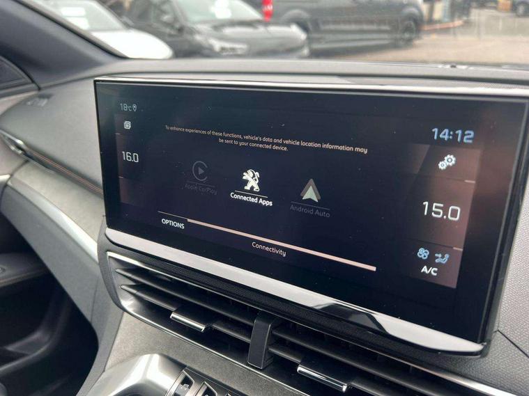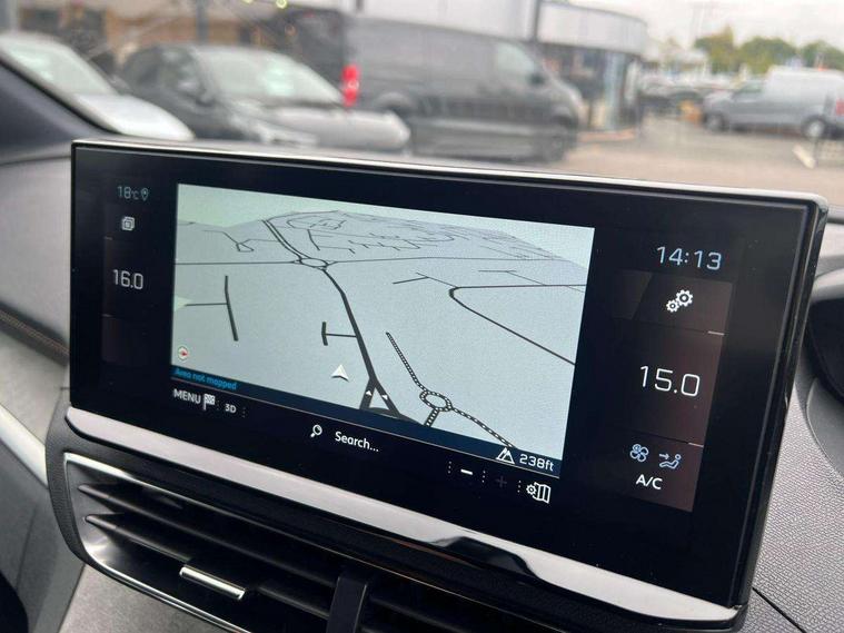 180 degree colour reversing camera, 3D connected navigation with 10" HD touchscreen, Bluetooth telephone facility, Drive modes select (Eco, normal and sport), Driving Time Warning (DAA1), Emergency services call system, Extended traffic sign recognition, Exterior temperature indicator with ice warning, Mirror screen with mirror link, apple carplay and android auto, Multi function trip computer, PEUGEOT i-Cockpit with 10" high definition capacitive touchscreen, Peugeot i-cockpit with compact multi-function sports steering wheel, PEUGEOT i-Cockpit with configurable 12.3" Head-up digital instrument panel, PEUGEOT SOS and assistance, Rear passenger USB charging sockets (x2) (type A), Speed limit recognition and recommendation, Voice recognition, Dynamic stability control and electronic anti-skid system, Stop/start function, DAB Digital radio, USB socket, Auto self levelling headlights, Automatic hazard light activation upon heavy brake application, Automatic triggered rear windscreen wiper in reverse gear, Black with chrome detailed front wing trim, Body colour door handles, Body colour rear roof spoiler with stainless steel edging trim, Body protectors (bottom of front and rear bumpers + wheel arches + protection at bottom of doors) in black, Dark tinted rear side windows + tailgate window, Diamond Black door mirror shells, Door mirror mounted LED courtesy floor lighting, Electric folding door mirrors with exterior courtesy LED lighting, Electric operated/heated door mirrors, Fog Mode, Front windscreen wiper with magic wash cleaning system, Full LED headlights with LED fog lights with static cornering function, Gloss black B and C pillar and aerodynamic deflector trim, Gloss black front bumper air scoops, Gloss black rear cluster connecting strip, Gloss black windscreen trim, GT emblem in satin copper (front wings and tailgate), Headlights left on audible warning, Heated rear windscreen with integrated antenna, LED daytime running lights, LED front indicator, LED rear number plate lighting, LED side indicator lights integrated into door mirrors, LED third brake light, One touch electric front/rear windows with pinch protection, Rear LED Peugeot signature 'Claw Effect' lights, Rear side wing doors, Stainless steel roof arches, Twin exhaust tailpipe, 1/3 to 2/3 split folding rear seats, 12V Sockets in dashboard, rear cabin and load area, 2 cupholders in front centre console, 2 cupholders in rear armrest, 2 x Rear reading spotlights, 2x Rear coat hooks, 3x Isofix child seat fittings in the front passenger and outer rear seats, 4 Grab handles retractable and damped, Aikinite stitching in armrest, gear lever and dashboard facia, Aluminium pedals, Blue ambient lighting for connecting zone, Blue ambient lighting to front door panels, central storage and cupholders, Blue ambient lighting to headup instrument panel, Centre front armrest with butterfly wing opening and illuminated storage compartment, Driver seat manual adjustment (longitudinal and back rest angle), Dual zone automatic climate control, Electric power steering with reach and rake adjustable steering column, Flocked front door pocket interior with blue ambient lighting, Flocked glovebox interior, Foldable front passenger seat with picnic table, Footwell illumination, Front interior light with 2 reading spotlights and rear interior light with timer, Front passenger seat manual adjustment (longitudinal and back rest angle), Front seat back map pockets, Gear shift indicator, Illuminated glovebox, Individual left and right controls in boot for seat folding, LED interior lighting in storage spaces and load area, LED roof interior lighting, Mistral floor mats with Aikinite contrast stitching, Mistral full grain perforated leather steering wheel with aikinite stitch detail and satin chrome 'GT' emblem, Rear bench seat with central armrest and ski hatch, Rear centre console ventilation system, Roof lining - Mistral black, Satin chrome dashboard trim, Satin chrome digital instrument panel and touchscreen trim, Satin chrome front door panel recess trim, Satin chrome interior door handles, Satin chrome scorpion's tail and toggle switch trim, Seatbelt not fastened audible and visual alert for front seats, Seatbelt unfastened on the move audible and visual alert for front and rear seats, Sunvisors with illuminated vanity mirrors, Two position boot floor, Drive assist plus pack - 3008, Driver sport pack - 3008 Auto, Safety plus pack with high beam assist - 3008, Visibility pack - 3008, 3x Rear three-point retractable seatbelts with force limiters in the outer rear seats, ABS (Anti-lock Braking System) with EBD (Electronic Brakeforce Distribution) and EBA (Emergency Braking Assistance), Adaptive driver and front passenger airbags with passenger airbag deactivation function, Driver and front passenger side airbags, Electric child locking functionality on rear windows and doors, Electric parking brake, Front and rear curtain airbags, Front optimised safety headrests and 3 x rear retractable headrests with height adjustable, Front three point retractable seatbelts with pre tensioners and force limiters, Front ventilated disc brakes and rear disc brakes, Hill start assist, Two tone horn, Automatic door locking when moving off, Electronic immobiliser, key operated exterior door lock from the left hand door, Perimetric and volumetric alarm with lift and tilt sensor, Peugeot Open and Go System, Remote control central locking with two plip keys, Puncture repair kit including compressor, sealant cartridge and towing eye,