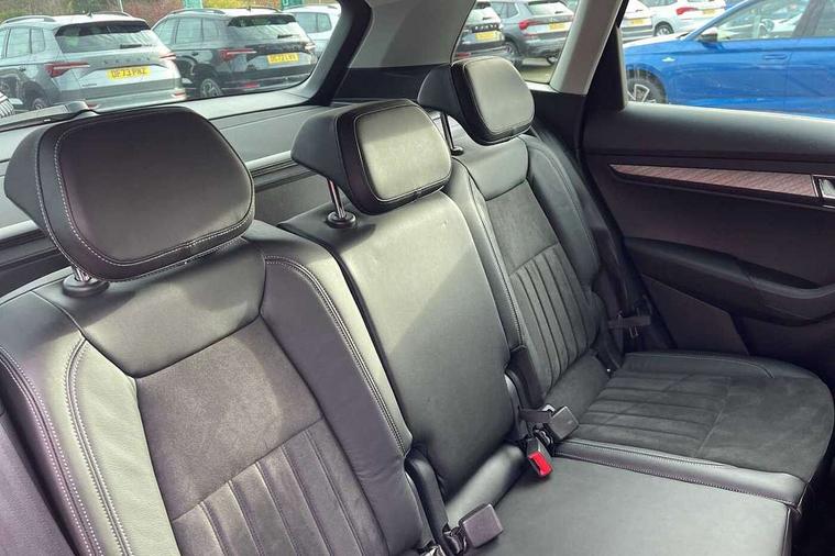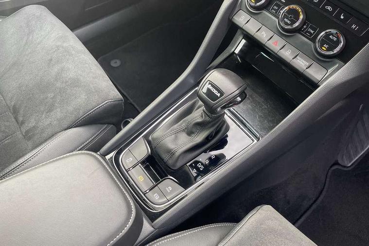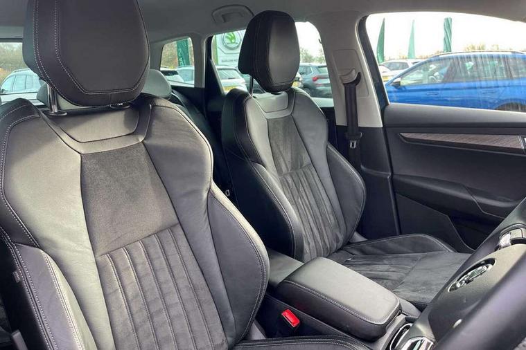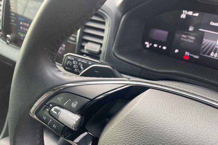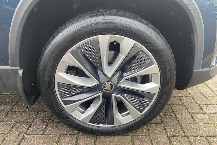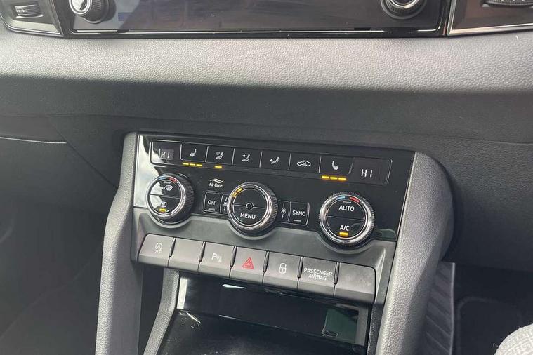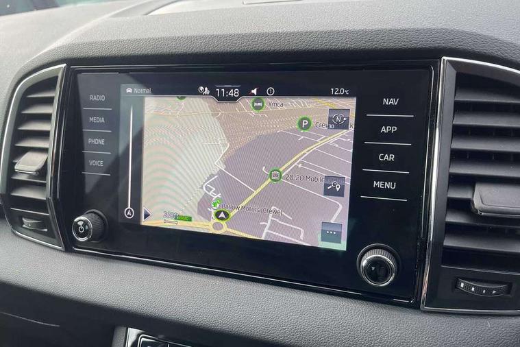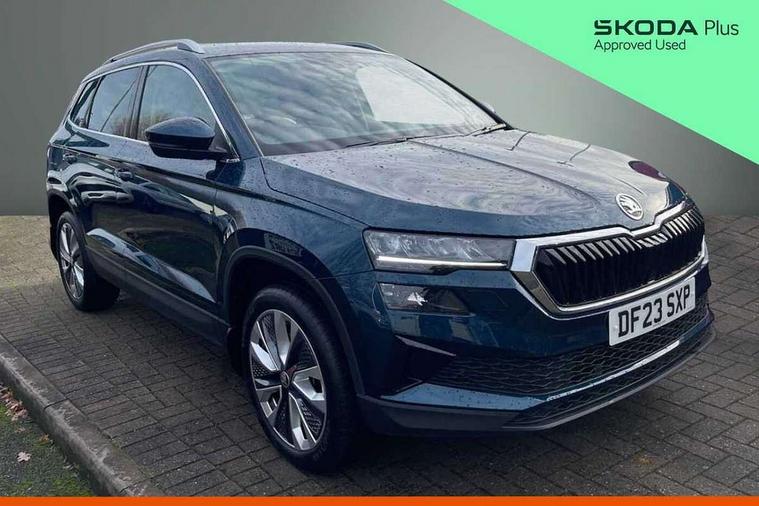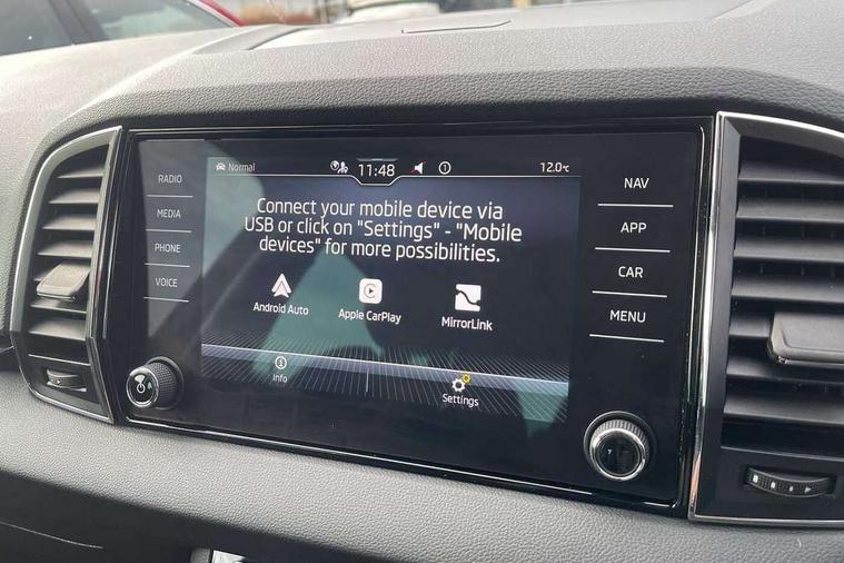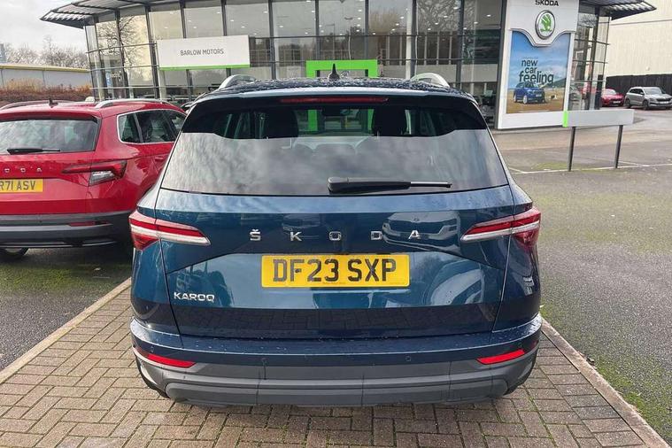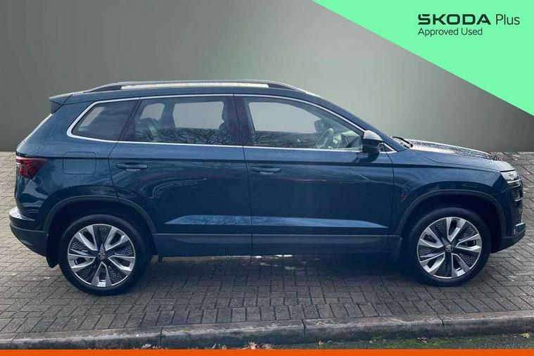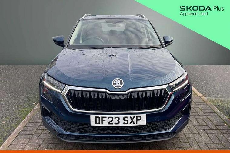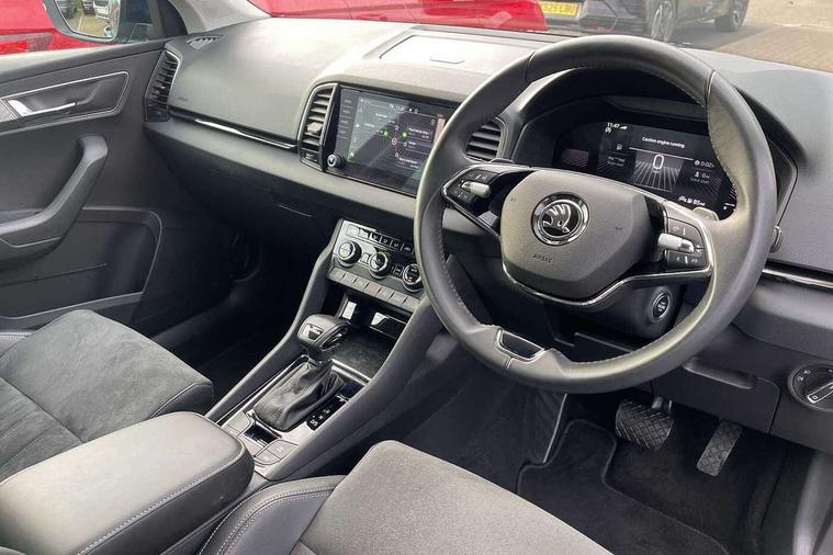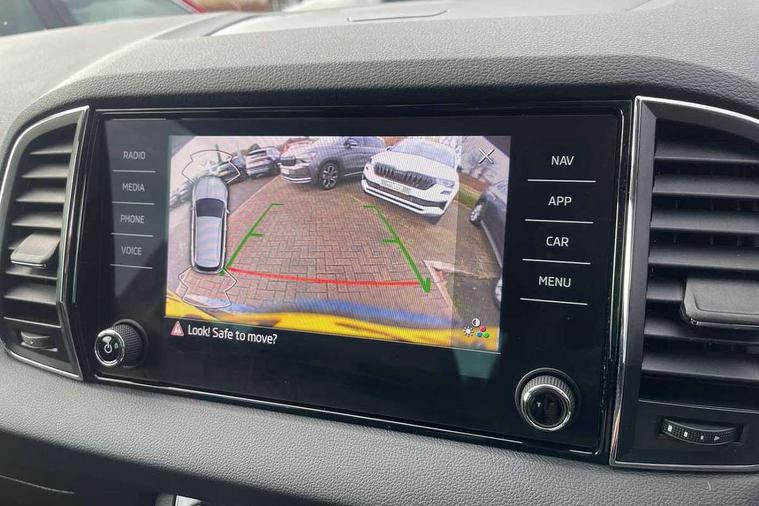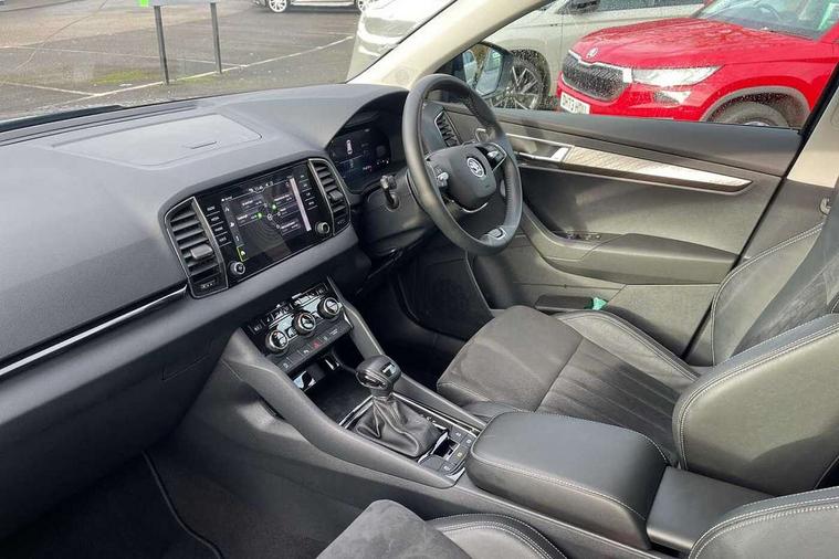 8" Digital display, Care connect, Driver fatigue sensor, Emergency services call system, Outside temperature gauge, Service interval indicator, SmartLink wireless for Apple and wired for Android, Start/stop system with regenerative braking, USB C Port x 2 in front centre console, 8 Speakers, DAB radio with Bluetooth, USB connection, Acoustic glass, Aero front windscreen wipers with intermittent function, Auto dimming rear view mirror with light and rain sensors, Black electric window control buttons, Body colour door mirrors and handles, Dynamic headlight range control with cornering light function, Electric front and rear windows with child proof lock, Heated rear windscreen, LED daytime running lights, LED rear lights with high functionality welcome effect and dynamic indicators, Light assistant (coming/leaving home/tunnel light), Plastic scuff plates, Privacy glass, Rear side wing doors, Rear spoiler, Rear window wiper with washer system and intermittent control, Safety reflectors on front doors, 1.5 litre bottle holders in driver and front passenger door panels, 12V socket in boot, 12v socket in front centre armrest with storage compartment and rear air vents, 2 spoke leather heated multifunction steering wheel with DSG paddles, 2 x Tablet holder, 3 rear height adjustable headrests, 3 seat bench in 2nd row, 4 foldable roof handles with rear coat hooks, Black floor carpet, Chrome inner door handles, Decorative door sills with KAROQ badging, Double sided boot floor, Foldable hooks in the boot, Front head restraints, Height adjustable front three point seats belts with tensioners, Height/reach adjust steering wheel, Ice scraper, Illuminated glovebox, Illuminated luggage compartment, Isofix child seat preparation for front passenger seat, Isofix child seat preparation outer rear, Manual lumbar support for front seats, Pen holder, Pollen filter, Rear boot cover, Rear reading lights, Rubbish bin door, Safety vest holder, Single front passenger seat, Storage box in upper central dashboard closed, Sunvisors with illuminated vanity mirrors, Textile floor mats, Ticket holder, VarioFlex seats with standard rear seat release, Boot pack - Karoq, Chrome roof rails + chrome pack - Karoq, Parking pack - Karoq, Automatic door unlocking in case of crash, Automatic fuel cut off in case of crash, Child locks on rear doors, Driver airbag, Electronic parking brake with auto hold function, Emergency rear braking signal, ESC including ABS, MSR, ASR, EDS, HBA, DSR, RBS, MKB and traction control, Front side airbags, Hill hold control, Knee airbags, Passenger airbag with switch-off function, Pedestrian monitor, Seatbelt reminder signalisation and pretensioner for all seats, Three point seatbelts rear, Two tone horn, Tyre pressure display, Tyre pressure monitor, Alarm with interior monitoring, back up horn and tilt sensor with safe function, Electronic engine immobiliser, Keyless entry and start/stop, Remote central locking with 2 remote folding keys, Chrome framed air vents, 18" Procyon silver alloy wheels with anthracite aero inserts, Anti-theft wheel bolts protection, Storage on wheel cover, Tool kit,
