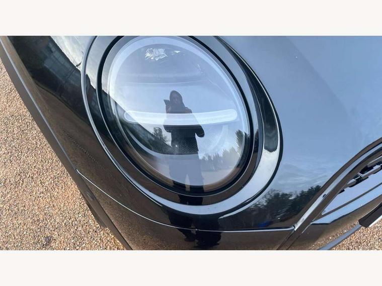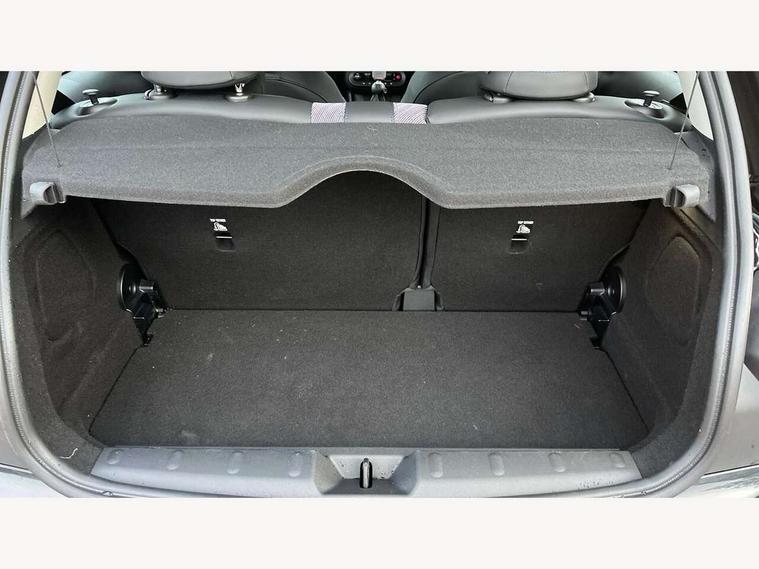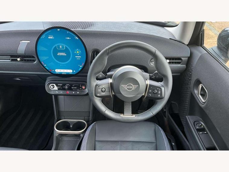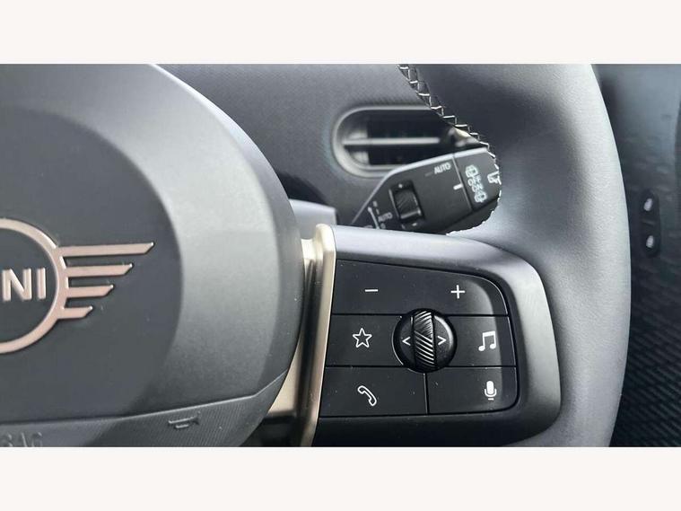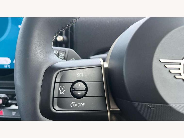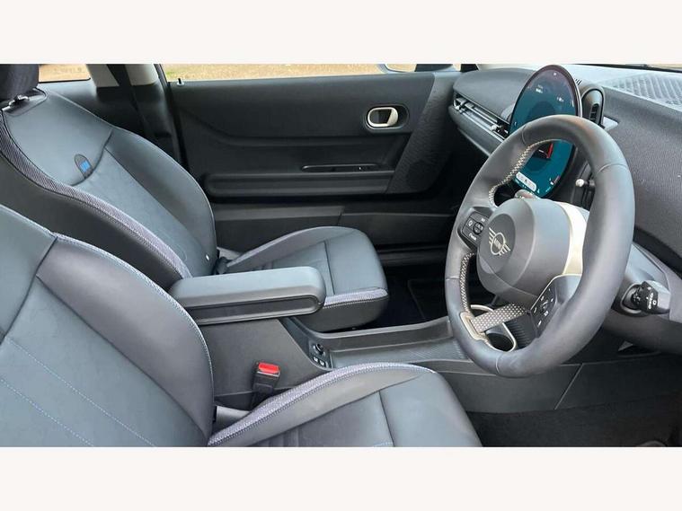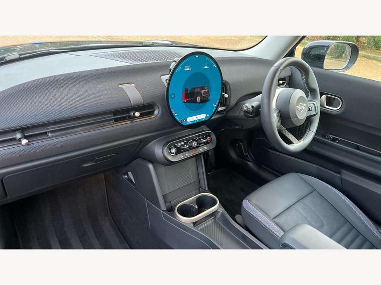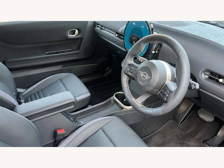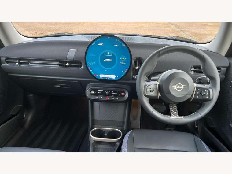 Central toggle bar, Circular OLED Screen, Compatible mobile phone bluetooth with audio streaming, Cruise control, Digital instrument cluster, Electro-mechanical speed dependant steering assistance, Emergency call service, MINI Experience Modes, Mini navigation system, On board computer, Service interval indicator, Tailgate, 7 speed steptronic transmission with double clutch, DAB Digital radio, Personal eSim, Auto headlights, Black grille surround, Electric adjustable heated door mirrors, Electric front windows, Heated rear window, Heated windscreen washer jets, LED 3rd brake light, LED daytime running lights, LED Headlights, LED indicator lights, LED rear lights, Rain sensor window wipers, Rear fog lights, Rear window wiper, 2 seat bench in second row, 2 zone automatic air conditioning, 60/40 rear seat bench, Ambient lighting, Cupholders, Front and rear head restraints, Front compact armrest, Front floor mats, Heated steering wheel, Height adjustable passenger seat, Light headliner, Luggage compartment lighting, Single front passenger seat, Sport Vescin Steering Wheel black with vibrant silver accents, Sunvisors with vanity mirrors, Vescin/Cloth upholstery includes dash knit in black with blue accents, Driving assistant pack - Cooper Hatchback, Park assistant pack - Cooper Hatchback, 3 point seatbelts on all four seats, 6 Airbags - front, side, head and seat belt tensioners, Anti-lock braking system (ABS), DSC - Dynamic Stability Control, Electronic parking brake, Front and rear disc brakes, Front ISOFIX (iSize), Front passenger airbag deactivation, Traction control, Tyre pressure monitoring system, Alarm, Immobiliser, Remote central locking, Tyre repair kit,