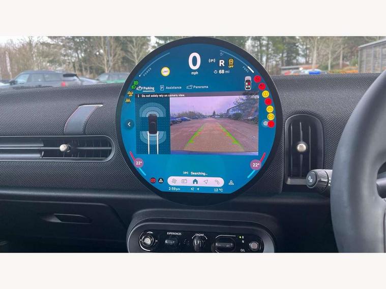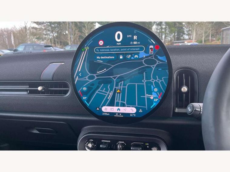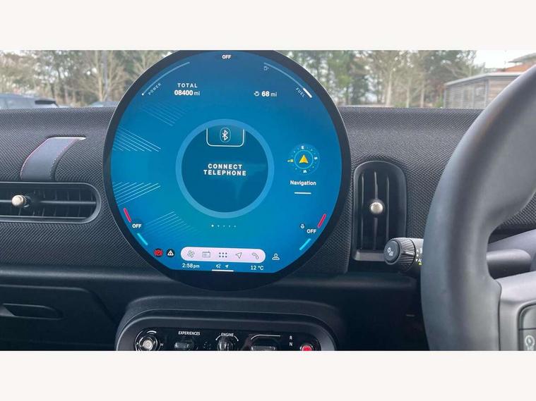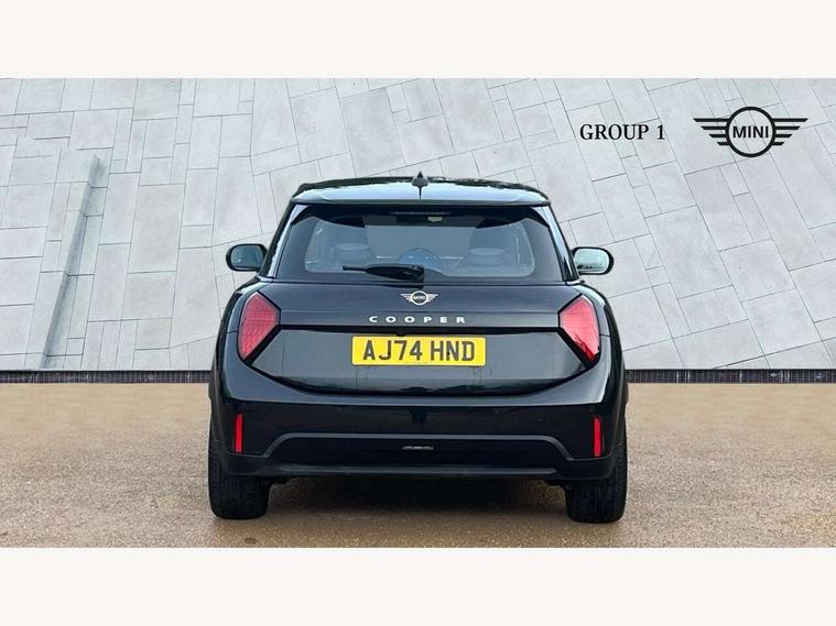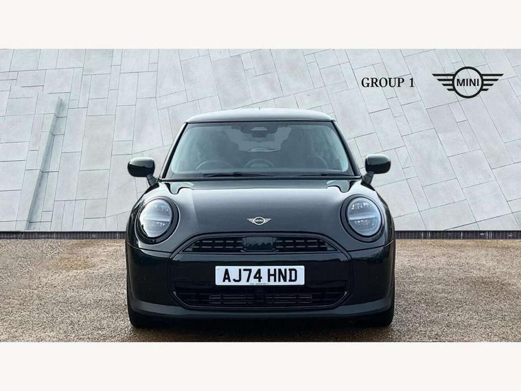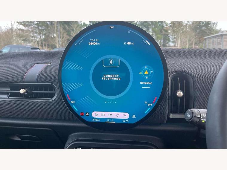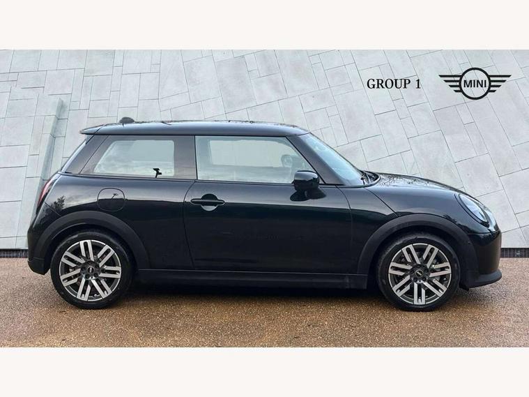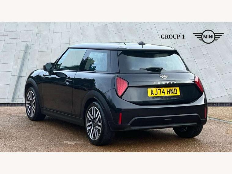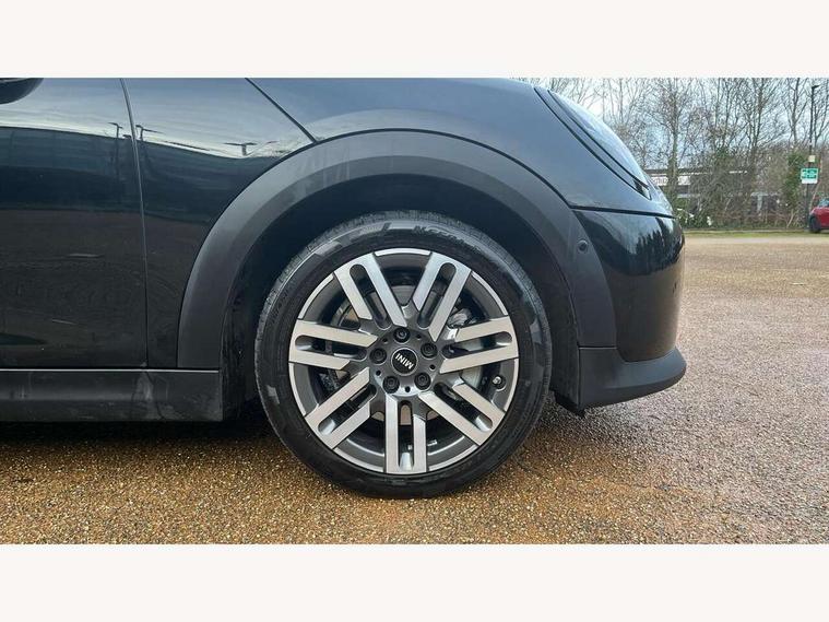 Central toggle bar, Circular OLED Screen, Compatible mobile phone bluetooth with audio streaming, Cruise control, Digital instrument cluster, Electro-mechanical speed dependant steering assistance, Emergency call service, MINI Experience Modes, Mini navigation system, On board computer, Service interval indicator, Tailgate, 7 speed steptronic transmission with double clutch, DAB Digital radio, Personal eSim, Auto headlights, Black grille surround, Electric adjustable heated door mirrors, Electric front windows, Heated rear window, Heated windscreen washer jets, LED 3rd brake light, LED daytime running lights, LED Headlights, LED indicator lights, LED rear lights, Rain sensor window wipers, Rear fog lights, Rear window wiper, 2 seat bench in second row, 2 zone automatic air conditioning, 60/40 rear seat bench, Ambient lighting, Cupholders, Front and rear head restraints, Front compact armrest, Front floor mats, Heated steering wheel, Height adjustable passenger seat, Light headliner, Luggage compartment lighting, Single front passenger seat, Sport Vescin Steering Wheel black with vibrant silver accents, Sunvisors with vanity mirrors, Vescin/Cloth upholstery includes dash knit in black with blue accents, Driving assistant pack - Cooper Hatchback, Park assistant pack - Cooper Hatchback, 3 point seatbelts on all four seats, 6 Airbags - front, side, head and seat belt tensioners, Anti-lock braking system (ABS), DSC - Dynamic Stability Control, Electronic parking brake, Front and rear disc brakes, Front ISOFIX (iSize), Front passenger airbag deactivation, Traction control, Tyre pressure monitoring system, Alarm, Immobiliser, Remote central locking, Tyre repair kit,