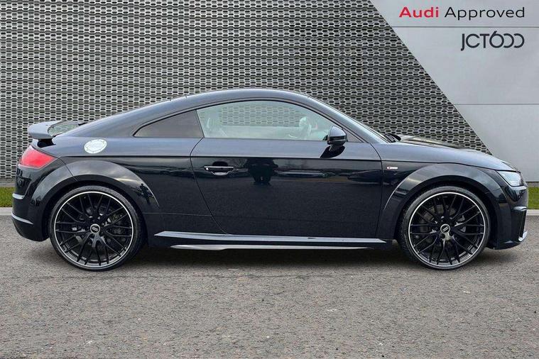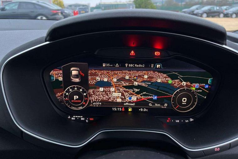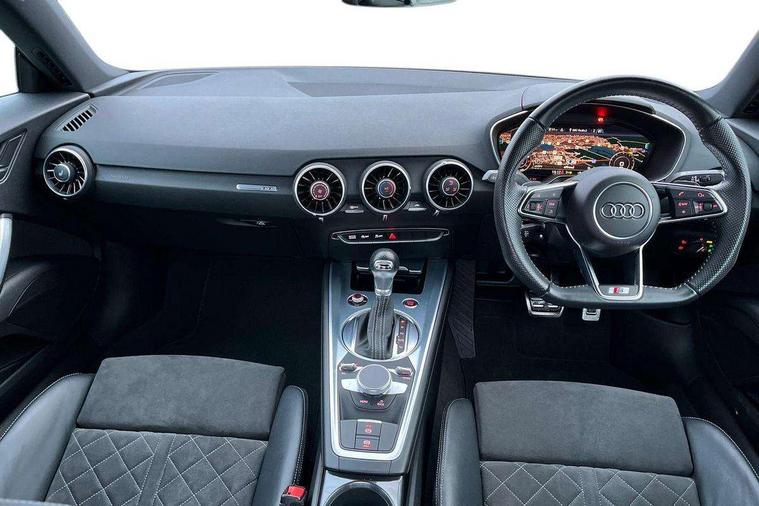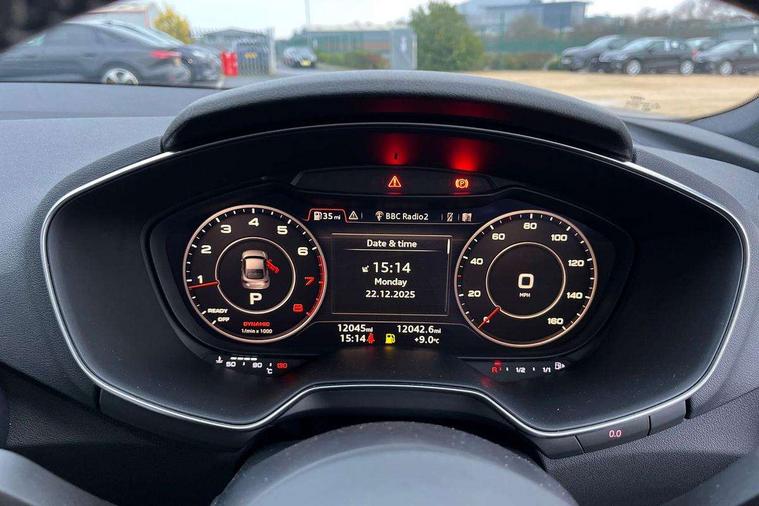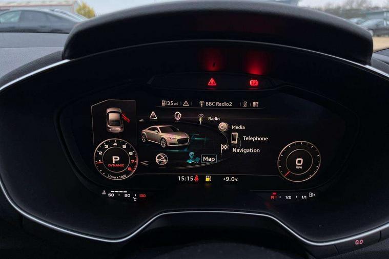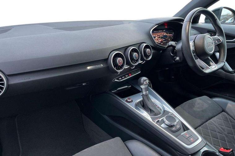 Audi drive select with 4 Pre configured modes, Audi smartphone interface, Audi virtual cockpit - 12.3" high-resolution LCD display with fully customisable instrument cluster, Cruise control + speed limiter, MMI touch panel, Mobile phone preparation with bluetooth interface, Progressive power assisted steering, Service interval indicator, Start/Stop system with energy recuperation, TP memo, Sports suspension, AM/FM radio, Bluetooth audio streaming, DAB Digital radio, MMI Radio with CD player and SD/XC card slot, Auto dimming rear view mirror, Auto headlight range control, Black chrome tailpipe, Dark privacy glass from B-pillar backwards, Electric folding door mirrors, Electric front windows, Electrically adjustable and heated door mirrors with integrated LED side indicators, Front fog lights, Green tinted heat insulating glass, LED daytime running lights, LED headlights with LED rear lights + dynamic rear indicators, Light and rain sensors, Sunband for windscreen, 12V socket, 3 spoke flat bottomed high multi-function leather sport steering wheel with gearshift paddles, 4 way electric lumbar support for driver and front passenger, Black headlining, Contrasting silver stitching in steering wheel, Door sill trims, Extended aluminium look with stainless steel pedals, Front centre armrest, Front super sports seats, Heated front seats, Height adjustable driver's seat, Height adjustable front head restraints, Height/reach adjust steering wheel, ISOFIX child seat mounting for front passenger seat with airbag deactivation, Manual adjustment of seat height, fore/aft position, seat angle, seat depth and backrest angle, Perforated leather gearknob in black, Rear head restraints, Rear top tether child seat ISOFIX attachment, Split folding rear seat, Tool kit, Black styling pack - TT, Non smoking pack - TT/TT RS, 3 point front seat belts, ABS, ASR traction control, Curtain airbags, Driver and front passenger airbag with front passenger airbag deactivation, EDL traction control, Electromechanical parking brake, ESP, First aid kit, Front side airbags, Head airbags, Hill hold assist, Seatbelt warning, Tyre pressure loss indicator, Warning triangle, Anti theft alarm, Anti theft wheel bolts, Immobiliser, Keyless Go, Remote central locking, Matt brushed aluminium inlays, Tyre repair kit,