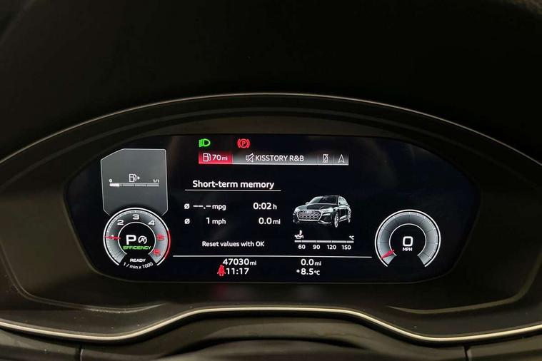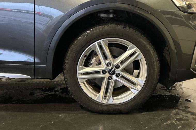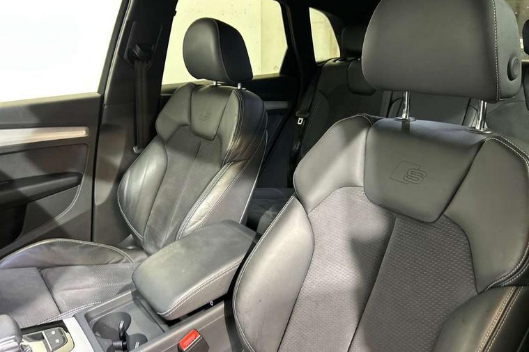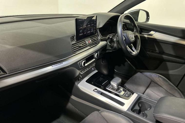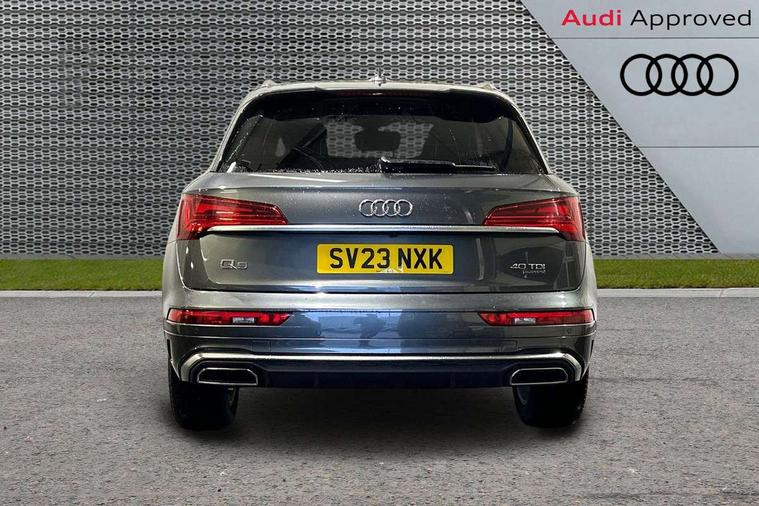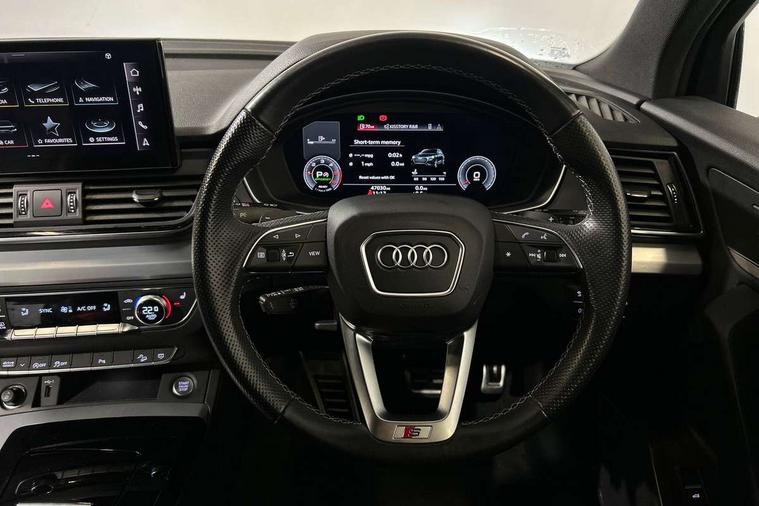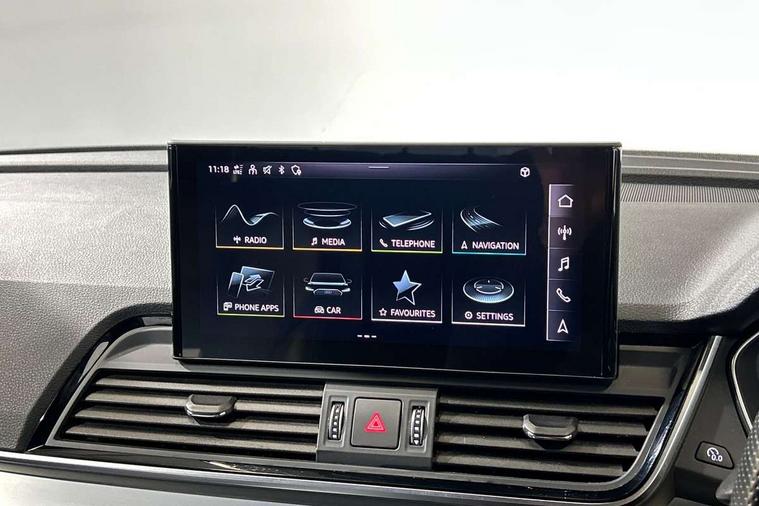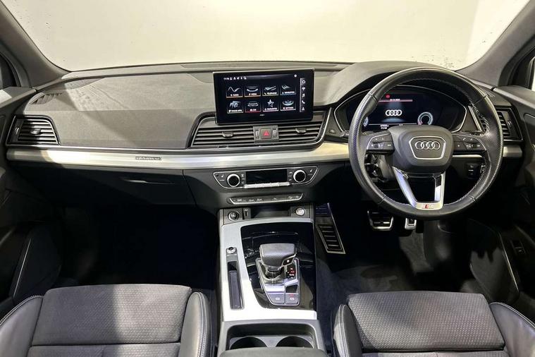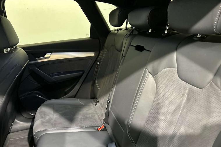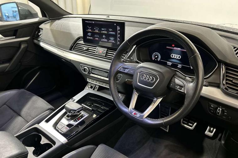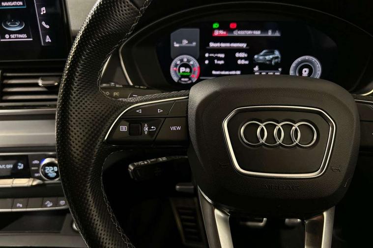 Acoustic front and rear parking sensor, Audi connect safety and service (e-call), Audi connect with Amazon Alexa Integration, Audi drive select, Audi virtual cockpit plus with 12.3" screen and three different layout designs, Audi wireless smartphone interface, Automatic start-stop system with coasting functionality and efficiency programme, Bluetooth interface, Electro - mechanical power assisted steering, MMI navigation plus with 10.1" touch screen, Power tailgate, Reversing camera, Service interval indicator, Voice control system with Audi hotword activation "Hey Audi", Diesel particulate filter, Quattro on demand, S line sports suspension, 2 x USB charging port with aux input socket, 8 loudspeakers, DAB Digital radio, Acoustic windscreen, Aluminium roof rails, Audi matrix LED headlights with dynamic front and rear indicators, Auto dimming door mirrors, Auto dimming frameless rear view mirror, Automatic headlight adjustment, Automatic headlights and windscreen wipers, Body colour bumpers, Body colour door mirrors, Body colour rear diffuser with matt aluminium silver surrounds, Body colour underbody protection, Chrome plated exhaust trims, Daytime running lights, Door sills in Selenite silver, Electric adjustable/heated/folding door mirrors, Front air inlet surrounds in aluminium, Front and rear electric windows, Front radiator grille in honeycomb design, Headlight washers, High level LED brake light, Lower bumpers painted in contrast Manhattan grey, Rear chrome trim strip below lights, Rear privacy glass and rear side windows, Rear side wing doors, Rear wiper, Roof bars, S Line badges on the front wings, S Line front and rear bumpers, S Line rear spoiler, S Line side skirts, 3 rear headrests, 3 spoke leather multifunction steering wheel with S badging perforated leather grips, 40:20:40 split folding 3 rear bench seat in 2nd row with rear centre armrest, Black cloth headlining, Comfort front centre armrest, Contrast stitching on seats, steering wheel and gear lever gaiter, Deluxe 3 zone electronic climate control, Front/rear floor mats, Gear lever in black leather, Heated front seats, Height adjustable front head restraints, Height/reach adjustable steering column, Illuminated door sill trims with S logo, Luggage compartment cover, Manual seat adjustment with 4-way electric lumbar support, Removable luggage compartment floor, Single front passenger seat, Stainless steel pedals, Sunvisors with vanity mirrors, High gloss pack - Q5, LED interior light pack - Q5, 3 point seatbelts on all seats, 6 airbags - Driver, front passenger, curtain and side airbags, Electrically operated child locks on rear doors, Electromechanical parking brake, Electronic stabilisation control including ABS, ASR and EDL, First aid kit with warning triangle and vests, Front passenger airbag deactivation, Hill descent control, Hill hold assist, ISOFIX child seat mounting for front passenger seat and ISOFIX child seat mounting with Top Tether for outer rear seats, Multi collision brake assist, Pop-up bonnet for pedestrian protection, Pre sense city, Seat belt force limiter, Seatbelt monitoring, Tyre pressure warning, Anti theft alarm, Anti-theft wheel bolts, Keyless Go access/ignition system, Remote central locking, Air vents inserts and centre console in gloss black, Matt brushed aluminium inlays,