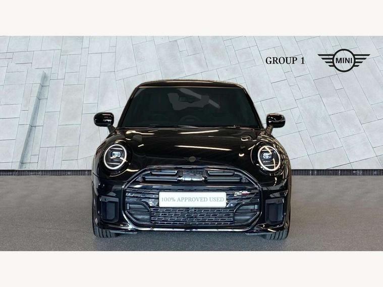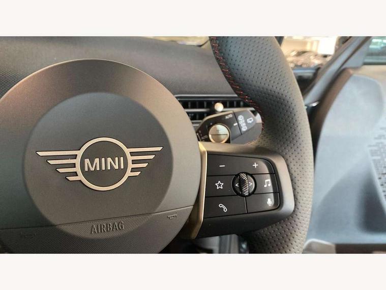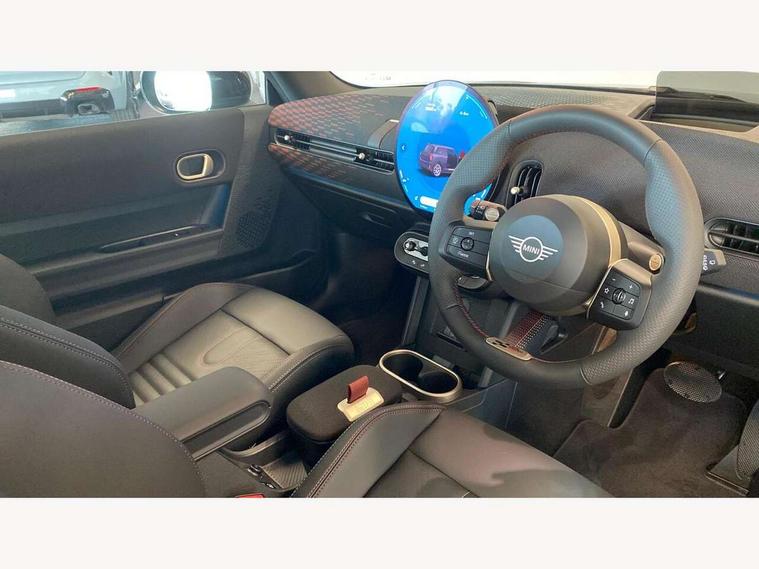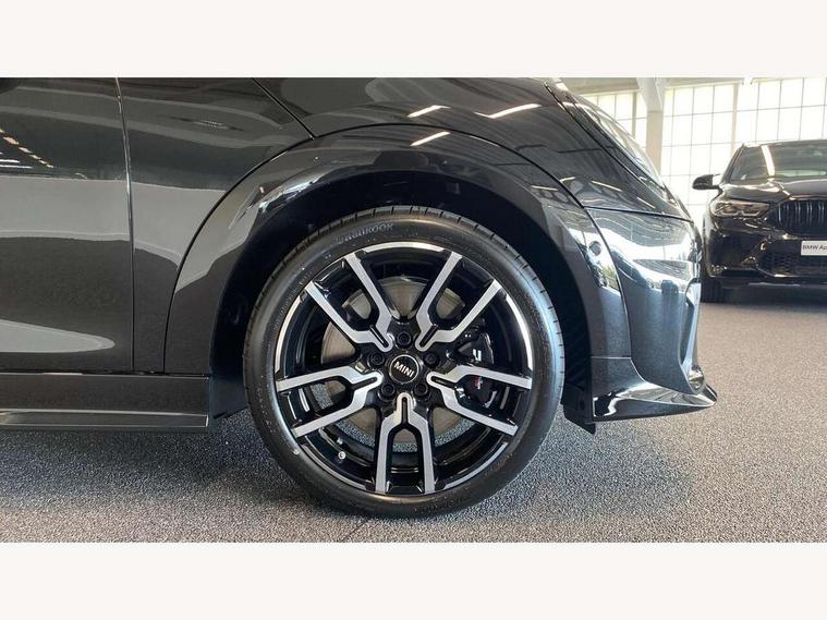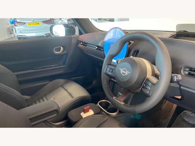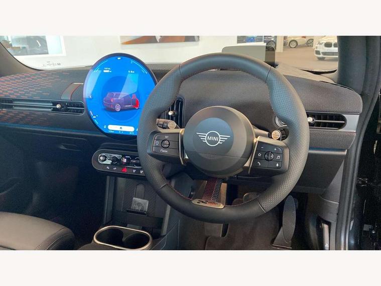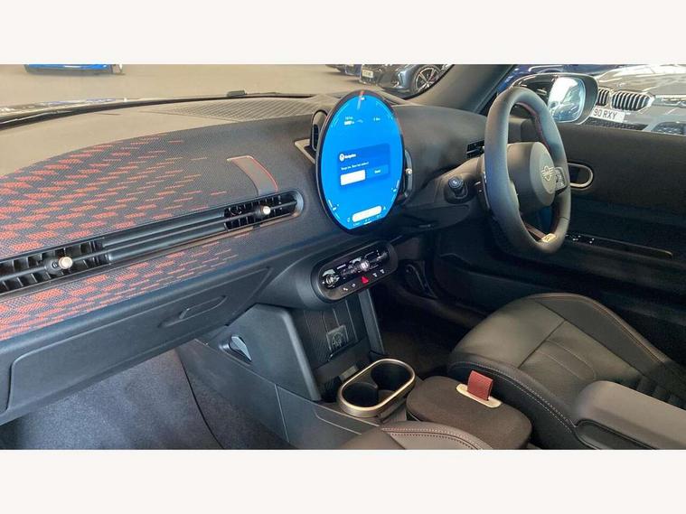 Central toggle bar, Circular OLED Screen, Compatible mobile phone bluetooth with audio streaming, Cruise control, Digital instrument cluster, Electro-mechanical speed dependant steering assistance, Emergency call service, MINI Experience Modes, Mini navigation system, On board computer, Service interval indicator, Tailgate, 7 speed steptronic transmission with double clutch, Adaptive suspension, DAB Digital radio, Personal eSim, Adaptable light signatures, Auto headlights, Electric adjustable heated door mirrors, Electric front windows, Front and rear apron, Heated rear window, Heated windscreen washer jets, High gloss black wheel arches, High gloss hexagonal patterned grille surround, JCW body kit, LED 3rd brake light, LED daytime running lights, LED indicator lights, LED rear lights, Rain sensor window wipers, Rear fog lights, Rear roof spoiler with airblades, Rear window wiper, 2 seat bench in second row, 2 zone automatic air conditioning, 60/40 rear seat bench, Ambient lighting, Black lower band in high gloss, Cupholders, Dark headliner, Front and rear head restraints, Front compact armrest, Front floor mats, Heated steering wheel, Height adjustable passenger seat, Lidded storage box in Black/Red knit, Luggage compartment lighting, Partially perforated vescin steering wheel with red accent, black/red decorative strap, Single front passenger seat, Steering wheel paddle shift, Sunvisors with vanity mirrors, Vescin/Cord combination JCW upholstery includes dash knit in black with red accents, Driving assistant pack - Cooper Hatchback, Level 1 pack - Mini Hatchback, Park assistant pack - Cooper Hatchback, 3 point seatbelts on all four seats, 6 Airbags - front, side, head and seat belt tensioners, Anti-lock braking system (ABS), Brake caliper in Black with JCW badge, DSC - Dynamic Stability Control, Electronic parking brake, Front and rear disc brakes, Front ISOFIX (iSize), Front passenger airbag deactivation, JCW Sport Brakes, Traction control, Tyre pressure monitoring system, Alarm, Immobiliser, Remote central locking, Black/Red decorative dash strap, Tyre repair kit,