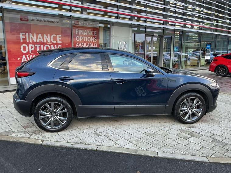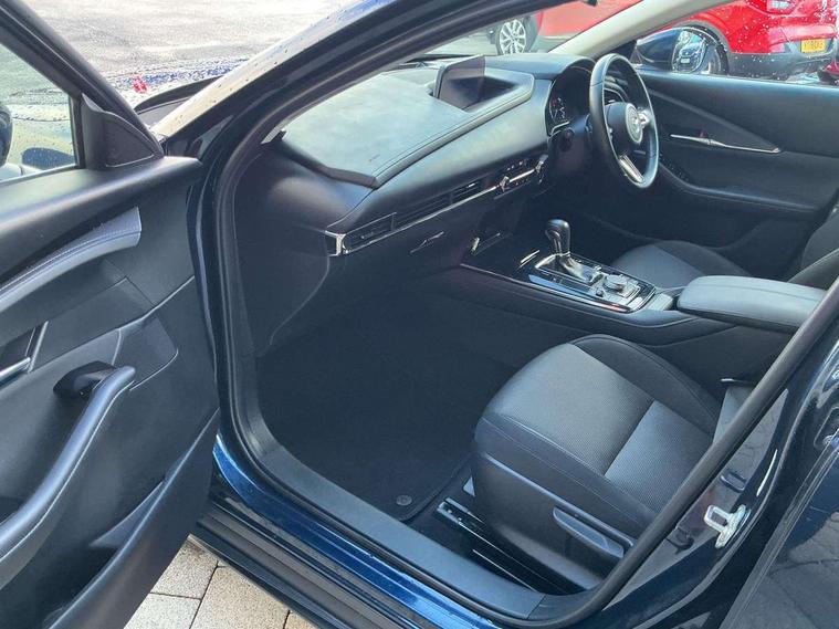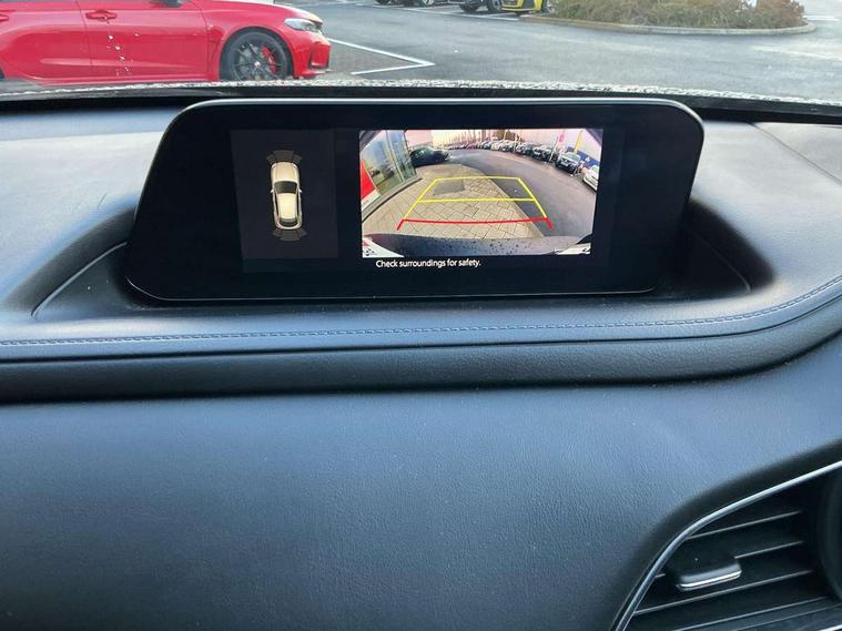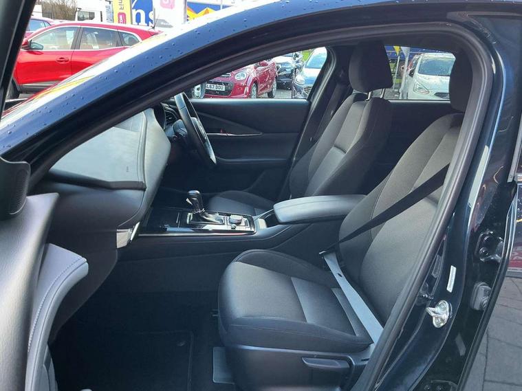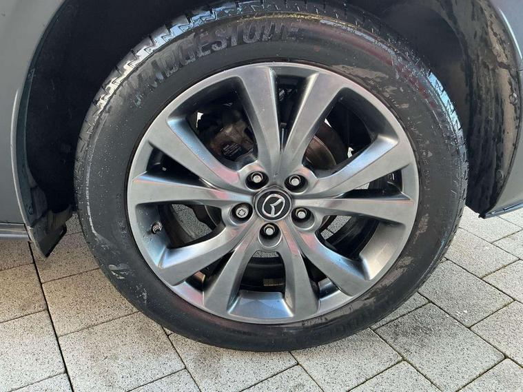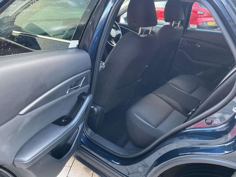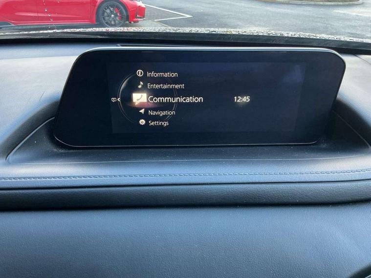 7" TFT Colour driver instrument panel display, 8.8" Colour centre touch screen display with Mazda Connect infotainment, Adaptive cruise control (Mazda radar cruise control) features stop and go, Apple car play/Android Auto, Blind spot monitoring with rear cross traffic alert, Drive mode selector, Driver attention alert system, E-call with GPS, Emergency stop signalling system, Engine start/stop button, Front and rear parking sensors, Integrated bluetooth, Integrated Mazda navigation system, Intelligent speed assist, Lane keep assist system (LAS) with Lane departure warning system (LDWS), PAS, Power lift gate, Reversing camera, Service indicator, Trip computer, Window projected colour active driving display (head up display) with traffic sign recognition, i-stop, 2 USB charging ports, AM / FM / DAB radio with 8 speakers, Multimedia Commander including separate volume dial, Steering wheel mounted audio/bluetooth controls, Adaptive LED Headlights, Auto dimming driver's door mirror, B-pillar and C-pillar garnishes in piano black finish, Body coloured, electrically adjustable, heated auto power folding door mirrors with integrated indicators, Coming/leaving home lighting function, Dual chrome exhaust, Dusk sensing headlights, Electric front/rear windows with one touch auto up/down, Frameless auto dimming interior rear view mirror, Front grille in piano black finish, Front kodo turn signal, High beam assist, Piano black rear roof spoiler, Power tilt/slide sunroof, Privacy glass (rear side windows and rear screen), Rain sensing front wipers with adjustable speed and intermittent wipe, Rear fog lights, Rear wiper, Signature front LED daytime running lights, Signature LED rear combination lights with LED rear turn lights, 60/40 split fold down rear seats, Chrome centre bezel steering wheel, Chrome horn pad ring, Cloth door panel inserts, Cloth upholstery with interior accents, Dashboard, door cards and front centre armrest in navy blue cloth, Driver and front passenger visors with covered vanity mirror and driver ticket holder, Driver seat manual slide, recline and height adjust, Driver, Front passenger and two rear grab handles with coathooks, Dual zone climate control air conditioning with rear air vents, Electrical power outlet, Folding rear centre armrest with two cup holders, Front and rear (x3) head restraints, Front and rear door pockets, Front and rear LED lighting, Front armrest, Front centre storage with two cupholders, Front passengers seat manual slide, recline and height adjustment, Glove box handle with chrome surround, Glovebox illumination, Heated front seats with 3 stage setting, ISOFIX child seat anchorage points attached on outer rear seats, Leather wrapped gear shift knob, Leather wrapped steering wheel with telescopic and tilt adjustment, Luggage compartment light, Paddle shift controls, Rear passenger seat map pockets, Roof mounted sunglasses holder, 3 point ELR front seat belts x2 with pretensioners, 3 point ELR rear seat belts, Anti-lock braking system (ABS), Driver/Front Passenger airbags, Drivers knee airbag, DSC - Dynamic Stability Control, Electronic parking brake with auto disengage function and auto hold function, Front and rear curtain airbags, Front passenger airbag cut-off switch, Front side airbags, Front smart city brake support, G-Vectoring control plus, Hill launch assist, Mild Hybrid system with regenerative braking, Seatbelt reminder for driver/front passenger and rear seats, Traction control system (TCS), Tyre pressure monitoring system (TPMS), Remote central locking with deadlocking and automatic door lock when driving, Smart keyless entry, Thatcham accredited alarm and immobiliser, 18" Bright silver metallic alloy wheels, Emergency tyre repair kit,