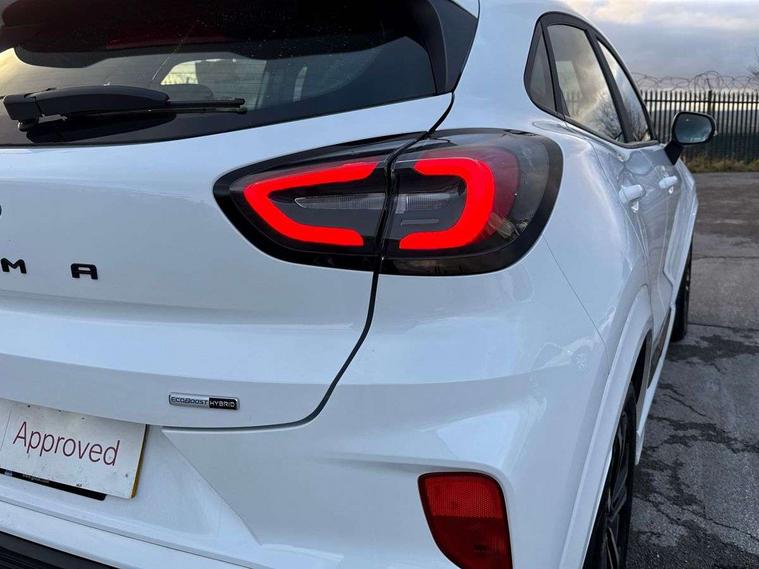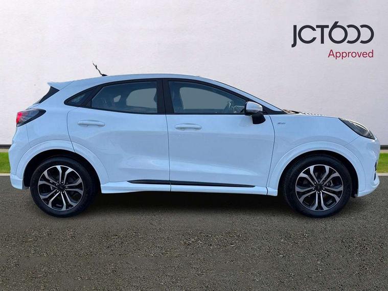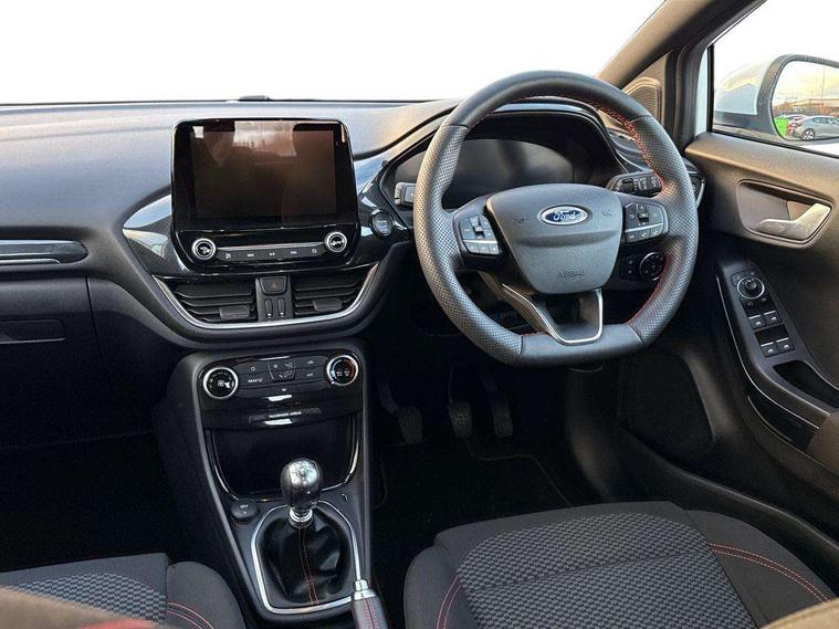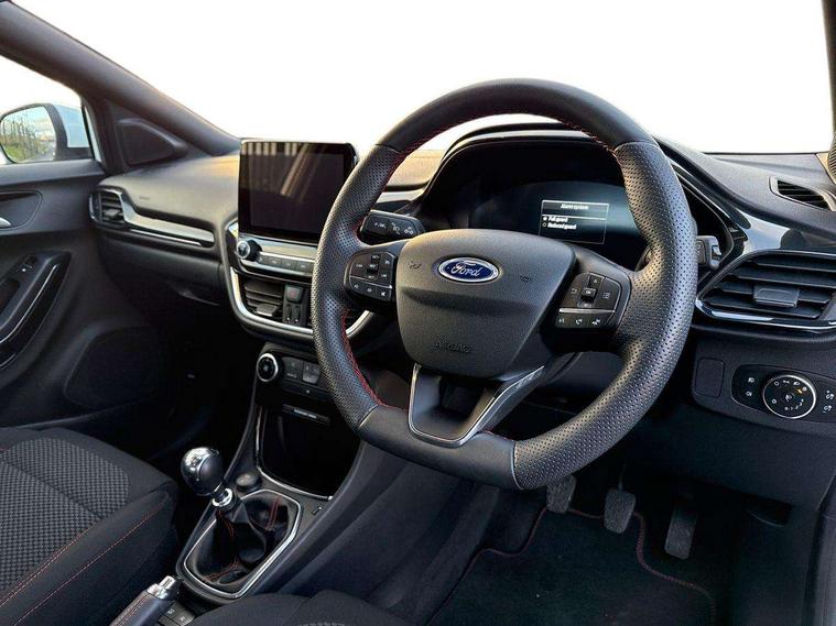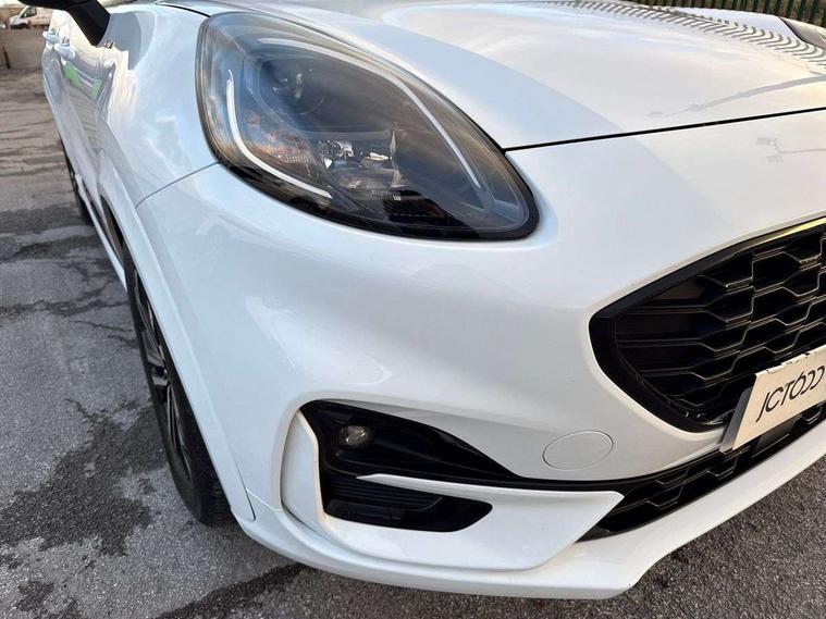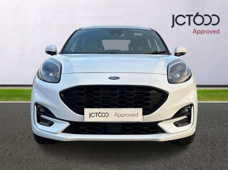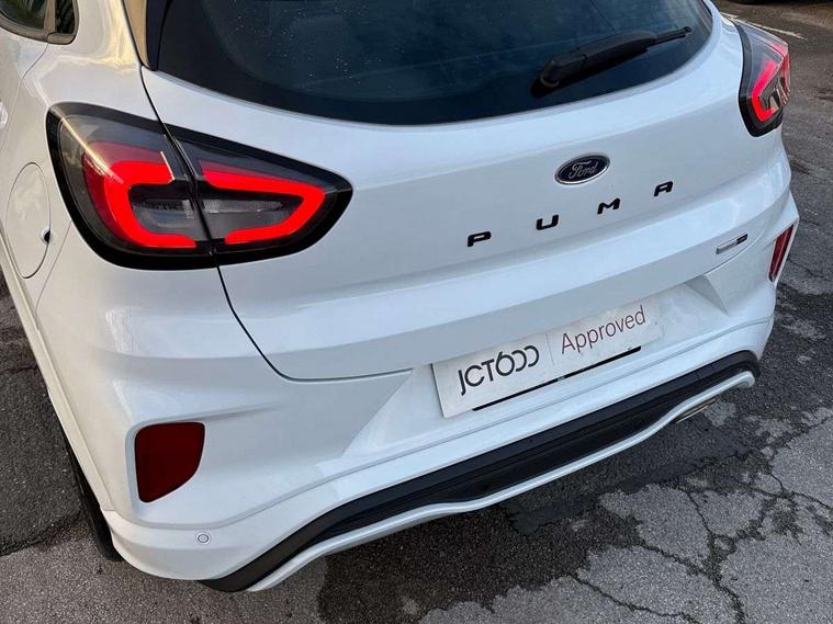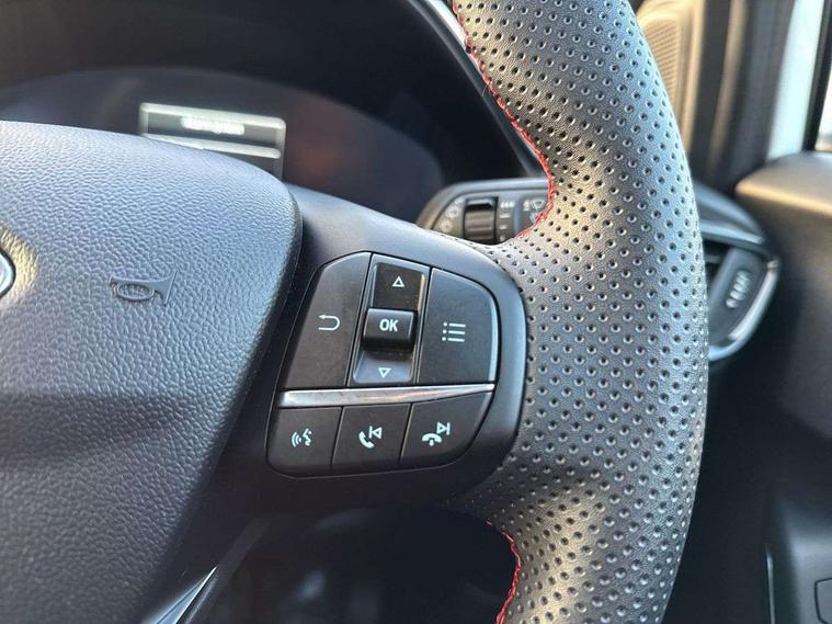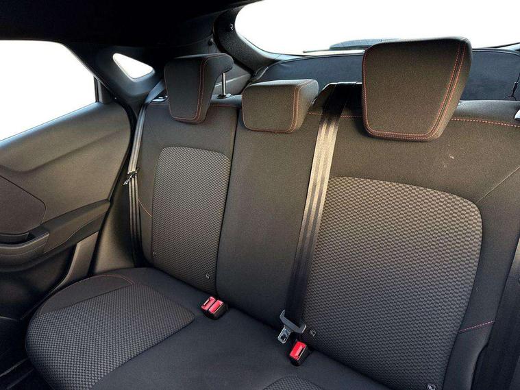 Driver impairment monitor, Emergency call service, Ford easy fuel, Full digital 12.3" instrument cluster, Lane keeping aid with lane departure warning, Power assist steering, Power start button, Rear parking sensor, Selectable drive modes(Normal, Eco, Sport, Slippery and Trail), Speed sign recognition, Sport suspension, Automatic headlights with auto high beam, Automatic rain sensing wipers, LED rear lamps, Power foldable heated door mirrors with puddle lamps, Projector headlamps with LED day time running lights and front fog lamps, Quickclear heated windscreen, Rear side wing doors, Rear wiper, ST-Line body styling kit with unique grille and large body colour rear spoiler, Third brake light, 3 seat bench in 2nd row, Centre console with armrest and stowage, Ford megabox extended bootspace, Front and rear head restraints, Front floor mats, Manual 2 way passenger seat adjustment, Manual 4 way driver seat adjust with lumbar adjustment, Single front passenger seat, ST- Line cloth trim with red stitching, ST-Line flat bottomed sensico leather steering wheel with leather handbrake and aluminium gear knob, Ford SYNC 3 navigation pack - Puma, 3 rear seatbelts, Child safety lock, Electronic stability control (ESC) and hill start assist, Pedestrian/cyclist detection & post-collision braking, Pre collision assist system, Tyre pressure monitoring system (TPMS), Thatcham alarm,