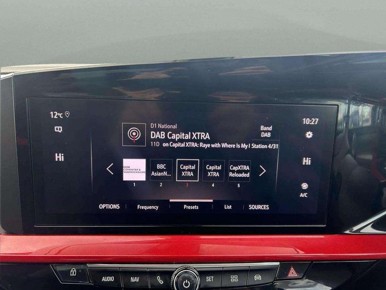 Automatic adaptive cruise control, Driver drowsiness alert system, Engine start/stop button, Front and rear parking distance sensors, Front camera system, Lane keep assist system (LAS) with Lane departure warning system (LDWS), Lights on audible warning, Multi function trip computer, Panoramic rear view camera, Power assisted speed sensitive steering, Side blind spot alert and flank guard, Smartphone integration compatible with Apple CarPlay and Android Auto, Speed sign recognition, Sports switch with engine sound enhancement, Start/stop system, Vauxhall connect with e-Call, 6 speed manual transmission, Chassis drive line front wheel drive, Electronic fuel system, Front chassis equipment, Rear chassis equipment, Standard chassis suspension system ride handling, Bluetooth A2DP audio streaming function (Advanced audio distribuition profile), Flexible Roof Mounted Radio Aerial, Front USB connection, Mobile phone portal - bluetooth connect, vehicle microphone, handsfree calls, SMS read out and reply, phone book access, Multimedia Navi pro infotainment with satellite nav, 10" colour touchscreen, 6 speakers, DAB radio, 12" instrument panel, Apple carplay/Android auto, Steering wheel mounted controls, Two rear USB sockets, 3rd brake light, Adaptive brake lights, Automatic lighting control with tunnel detection, Automatically dimming anti dazzle rear view mirror, Black door mirror housings, Black Griffin logo and vizor frame, Black rear spoiler, Black skid plates, Body colour door handles, Body colour front and rear bumpers, Dark tinted rear side windows + tailgate window, Electrically adjustable, heated and folding door mirrors, Electrically operated front and rear windows with safety auto reverse and one touch up/down facility, Hazard warning lights, Heated rear window+rear wash/wipe, High beam assist, LED daytime running lights, LED front fog lamps, LED side repeat indicators, LED tail lights, Manual headlamp level control, Rear foglight, Rear side wing doors, Rear wiper, Reversing light, Two speed rain-sensitive windscreen wipers with variable intermittent wipe, Windscreen and side window demist vents, 12V Accessory socket, 3 seat bench in 2nd row, 3 spoke flat bottomed leather steering wheel with satin chrome bezel, 4 speed fan with illuminated controls, 6 way manual adjustable driver fore/aft, up/down with reclining seatback, 6 way manual adjustable front passenger fore/aft, up/down with reclining seatback, Air recirculation system, Alloy sports pedals, Black headliner, Cabin particulate filter - removes dust, airborne particles and pollen, Centre console with two cup holders at front and one in rear, Chrome effect interior door handles, Door pockets with two litre capacity, Driver and passenger seat pocket, Driver and passenger sun visors with vanity mirror, Electronic climate control (ECC), Fabric/leather upholstery with jet black fabric side bolsters, Four adjustable facia vents, Four load restraint lashing eyes, Front centre armrest with storage, Front map reading lights, Front seat back storage pockets, Fully carpeted load area, Heated front seats, Heated steering wheel, Height adjustable front/rear head restraints, Illuminated load area, Interior courtesy light, Interior tailgate handle, Luggage compartment cover, Luggage compartment lighting, Reach + rake adjustable steering column, Single front passenger seat, Twin gas assisted tailgate struts, 2x Isofix child seat fitting on outer rear seats, 3x3 point rear seat belts, Anti-lock braking system (ABS), Automatic emergency city braking, Child proof locks on rear doors, Cornering brake control, Deactivation switch for front passenger front and side impact airbags, Drag torque control, Driver and front passenger airbags, front seat side impact airbags, full size curtain airbags, Electronic brake force distribution, Electronic Stability Programme (ESP), Emergency brake assist, Forward collision alert at all speed, Hill start assist, Inertia reel lap and diagonal seatbelts for all seats, Seatbelt unfastened audible warning and warning light, Straight line stability control, Traction control, Tyre pressure monitoring system, Electronically protected audio equipment, Freewheeling door locks, Immobiliser, Key left in ignition audible warning, Keyless entry and start, Locking wheel nuts, Remote control ultrasonic security alarm system, Visible vehicle identification number, Atlantis black trim inserts of front doors, Black facia with red trim insert, Instrument panel bar in Light Gravel, 18" bi colour alloy wheels with red accents,