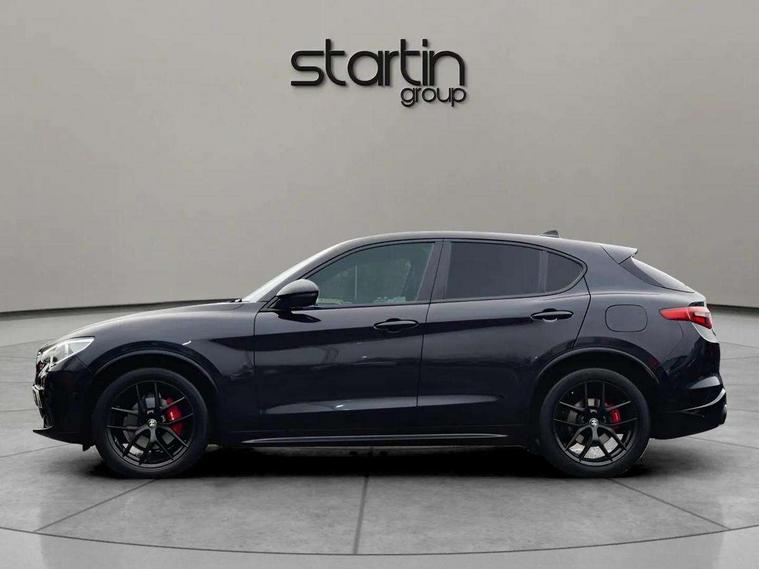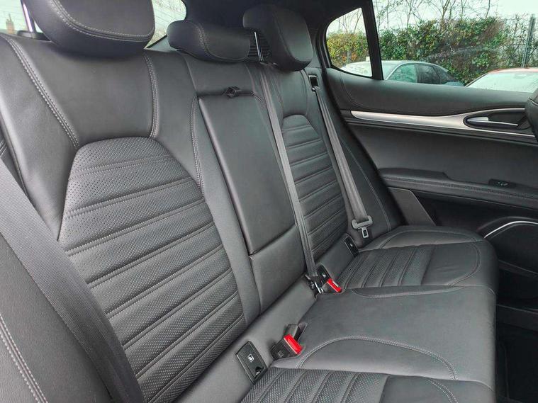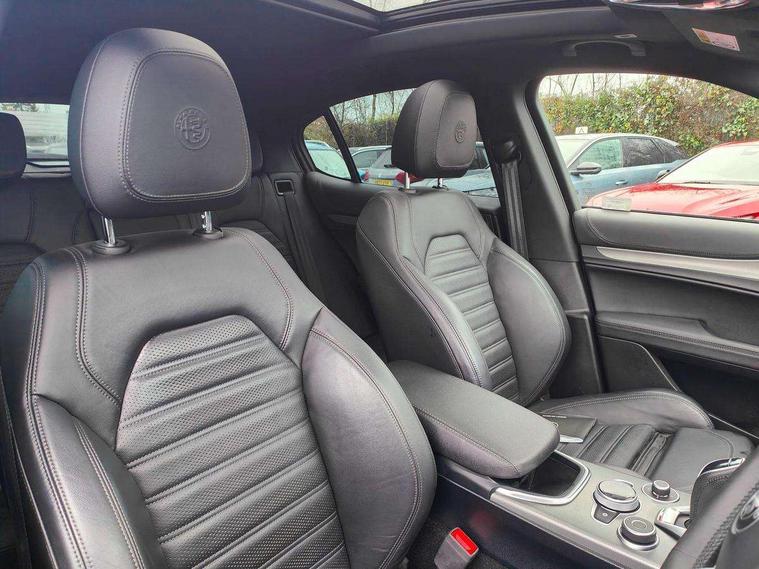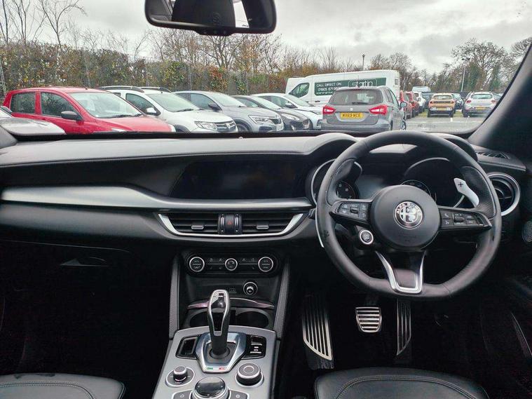 7 - inch colour TFT instrument cluster, 8.8" screen colour display, Alfa Connect 3D Nav 8.8" Infotainment system (radio, 3D Nav, MP3, aux-in, bluetooth), Alfa connect box, Alfa connected services, Alfa Romeo DNA driving mode selector, Apple car play/Android Auto, Forward collision warning, Front and rear parking sensors, PAS, Rear view camera, Remote tailgate release with key fob button, Rotary pad, Stop/start system, TMC Pro, Trip computer, West European Map, Wireless charging pad, DAB digital audio broadcast, USB and Aux in armrest, 35W Bi-xenon headlamp with AFS function, Alfa romeo assistance sticker, Aluminium tunnel cover, dashboard insert and door handle surround, Automatic headlights with dusk sensor, Automatic rain sensing wipers, Body colour bumpers, Body coloured side skirts, Body coloured wheel arches, Dark tinted rear windows, Darkened LED rear tail lights, Daytime running lights, Electrically adjustable and folding door mirrors, Gloss black Q4 badge, Gloss black side window surrounds, Headlight washers, LED brake lights, Transportation protection cover, Twin chrome exhaust tailpipes, Veloce badge front wing, 12V outlet on dashboard, 230V/50hz auxiliary power outlet in trunk, Aluminium kick plate, Aluminium metal sport pedals and footrest, Aluminium scuff plates, Aluminium shift paddles on steering column, Black painted interior bezels, Dark headlining, Dual zone auto temp control with humidity sensor, English handbook, Front head restraints, Front/rear floor mats, Leather upholstery, Rear climate control vent, Sport leather steering wheel with multifunctional controls and engine start button, Sports leather gear knob, Sports Leather with 6 way power adjust, power adjustable bolster support and heating, Third rear headrest, Cold weather pack - Stelvio, Convenience pack - Stelvio, Electrically adjustable seats pack, 3x3 point rear seatbelts, ABS, Autonomous emergency braking, Electronic parking brake, Electronic stability control, Hill descent control, Integrated brake system, Passenger airbag deactivation system, Traction control, Tyre pressure monitoring system, Alarm system with bonnet and intrusion protection, Immobiliser, Remote central locking, Thatcham vehicle theft alarm with hood protection and intrusion sensor, Monotone wheel centre caps, Summer tyres,
