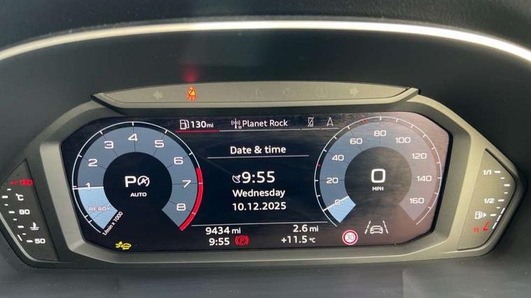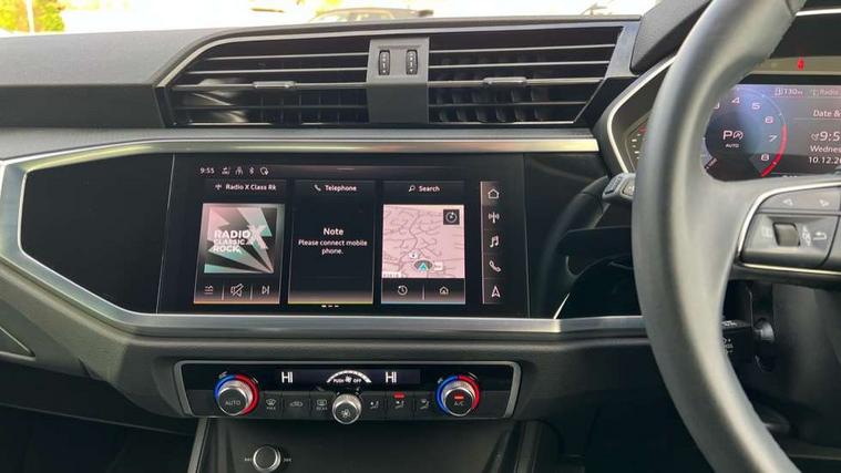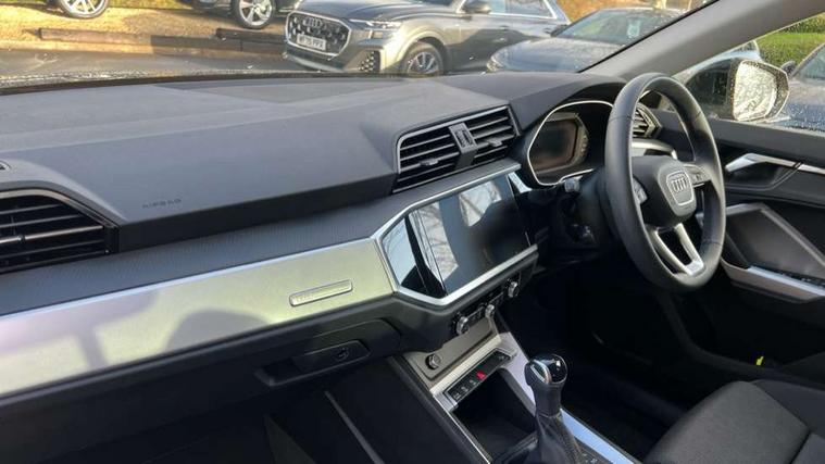 Audi connect safety and service, Audi drive select, Audi lane departure warning, Audi smartphone interface includes wireless Apple carplay/Android Auto, Audi Virtual Cockpit - 10.25" display, Bluetooth interface, Camera based traffic sign recognition, Distraction and Fatigue warning, Legal emergency call, MMI Navigation Plus with high resolution 10.1 inch touchscreen colour display, Power operated tailgate, Progressive steering, Service interval indicator, Start stop system with recuperation, Voice control system with natural language interaction, Sports suspension, 2 USB-C ports with charge and data functions, 6 passive loudspeakers, DAB digital radio module, Acoustic windscreen, Aluminium window trim, Auto dimming door mirrors, Auto dimming frameless rear view mirror, Bumpers and underbody protection in contrasting manhattan grey paint finish, Diffuser grille in grained matt black, Diffuser trim in manhattan grey metallic, Door sill trims with illuminated aluminium inlay, Electrically folding, adjustable and heated door mirrors with integrated LED side indicators and kerb view function for passenger side, Front and rear electric windows, Front fog lights, Front side air inlets in Manhattan grey metallic, Grille surround in aluminium silver matt, High gloss black finish B and C pillars, Honeycomb design radiator grille in matt anthracite black, LED headlights with LED daytime running lights, LED third brake light, Rain and light sensors, Rear side wing doors, Rear wiper, Variable front intermittent wipers, 12V socket in rear centre console, 3 seat bench in 2nd row, 3 spoke multi-function leather steering wheel, 40:20:40 folding with manual adjustment for 60:40 forwards/backwards position and backrest angle, Dual zone electronic climate control, Electric lumbar support, Front and rear floor mats, Front and rear headrests, Front centre armrest, Height and reach adjustable steering wheel, ISOFIX child seat mounting for front passenger with airbag deactivation and outer rear seat including top tether attachment point for outer rear seats, Luggage compartment sill protection in stainless steel, Lunar silver cloth headlining, Manual front seats with height adjustment, Single front passenger seat, Non smoking pack - Q3, 3x3 point rear seatbelts, 6 airbags - Driver, front passenger, curtain and side windows, Audi pre-sense front with pedestrain and cyclist recognition, Electrically operated child locks on rear doors, Electromechanical parking brake, Electronic stabilisation control including ABS, ASR and EDL, Front seatbelt reminder, Hill descent control, Hill hold assist, Pre sense basic, Seatbelt monitoring, Tyre pressure warning, Warning triangle and first aid kit, Anti theft alarm, Anti theft wheel bolts, Immobiliser, Remote central locking, Aluminium look interior elements, Detail dashboard around MMI touch colour display in glass look, black with surround in aluminium look, Micrometallic silver inlay,