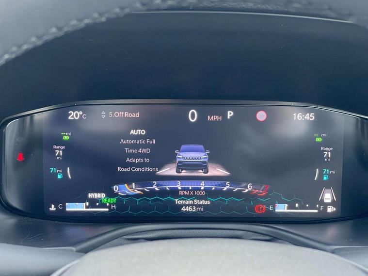 160 MPH primary speedometer, Active lane management, Active speed limiting device, Adaptive cruise control with Stop and Go, Drowsy driver detection, E-call, Electric power steering, English owners handbook, Full speed forward collision warning plus mitigation, Instrument cluster- 10.25" TFT Colour display, Instrument panel, Intelligent speed assist, Media centre electronic storage, Outside temperature display, Selec terrain system with sport mode, Tachometer, TBM - Connected services (e-call), Traffic sign recognition (TSR), Vehicle information centre, Wireless charging pad, Battery run - down protection, Battery skid plate, CO2 improvement, E- launch, E-creeping, E-Parking, E-Queueing, Electric drive, Electronic roll mitigation, EV/PHEV mode 2 charging cable, 6 speakers, Bluetooth audio streaming, DAB Digital radio, Global telematics box module (TBM), Media hub (USB A-C TYPE), Steering wheel mounted audio controls, USB A and C type - second row, USB host flip, 4XE badge/e-Hybrid badge, Accent/body colour bumpers, Aspherical driver's exterior mirror, Auto dimming rear view mirror, Auto high beam, Automatic headlights, Belly pan - underbody protection, Black mic grille with chrome rings, Black side roof rails, Body colour door handles, Carry back MHEV, Chrome window surround, Coastdown and run-in optimization, Compass badge, Deep tint privacy glass, Door mirrors: power adjustable and folding, heated with auto folding function and indicators, Exterior door mirrors with heating element, Front fascia/belly pan skid plate, Gloss black exterior door mirrors, Headlamp leveling system, Headlamp off time delay, Heated rear window, Jeep badge, LED front fog lamps, LED rear lights, LED reflector headlamps high with segmented DRL, LED tail lights, Limited badge, Lower bodyside cladding in black, Partial body cover protection, Power windows - driver and passenger express up/down, Rain sensitive windscreen wipers, Rear fascia, Rear fog lamps, Rear side wing doors, Rear windshield washer/wiper, Removable short mast antenna, Smartbeam headlights, Third brake light, Trailer sway damping, UK front number plate bracket, Windshield wiper de-icer, 12V auxiliary power outlet - 2nd row, 3 rear seat head restraints, 3 seat bench in 2nd row, 6 way manual adjust front passenger seat, 60/40 split folding rear seat, All weather floormats with Jeep logo, Cargo area lights, Cargo compartment carpet, Cargo compartment cover, Cargo compartment organiser, Cargo load floor, Cargo tie down loops, Centre console with sliding armrest, Centre rear 3 point seat belt, Child seat anchorage points, Cloth/vinyl upholstery, Coat hooks, Dash insulation, Driver assist handle, Driver seat 6 way manual adjust, Driver seat height adjust, Dual zone temperature control with preconditioning capability and heater, Fold flat front passenger seat, Front head restraints, Front height-adjust seatbelts, Front map pocket LED lamps, Front map reading lights, Front seats back map pockets, Full length centre console, Glovebox light, Glovebox with damped door, Heated front seats, Heated steering wheel, Illuminated door entry system, Interior door handle LED lamps, Internal rear grab handles, Leather wrapped gear knob, No Alternator, Overhead console, Overhead dome LED lamps, Passenger assist handles, Power 2-way driver lumbar adjustment, Rear air conditioning and heater vents, Rear seat armrest with cupholder, Single front passenger seat, Spare wheel storage insulation, Sunvisors with illuminated vanity mirrors, Tilt/telescopic steering column, Vinyl wrap steering wheel, AEB with pedestrian and cyclist detection, All speed traction control, Automatic electronic hold brake, Driver's front airbag, Dual note electric horns, Dual tyre pressure - lum changes, Electrical steering column shaft lock, Electronic parking brake, Electronic stability control, Energy recovery system, Front and rear side curtain airbags, Front passenger airbag, Front side airbags, Hill descent control, Hill start assist, Jeep call assistance label, Passenger airbag deactivation switch, Rain brake support, Rear door child protection locks, Rear seat belt reminder, Tyre pressure monitoring display, Capless fuel filler, Occupant detection system, Passive entry and keyless go (Key fob without panic button), Power locking fuel filler door, Premium security alarm, Front and rear air vents, Speakers in satin chrome silver,