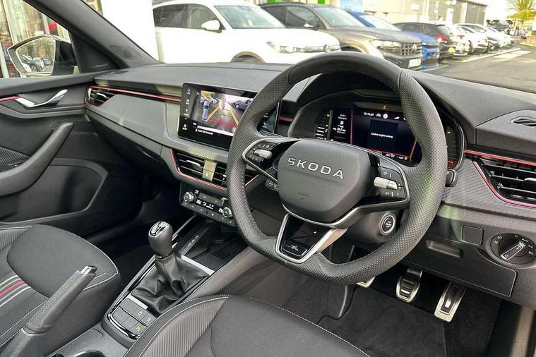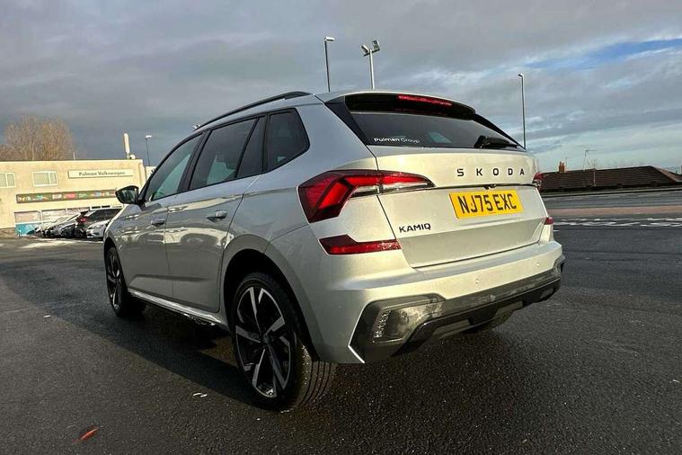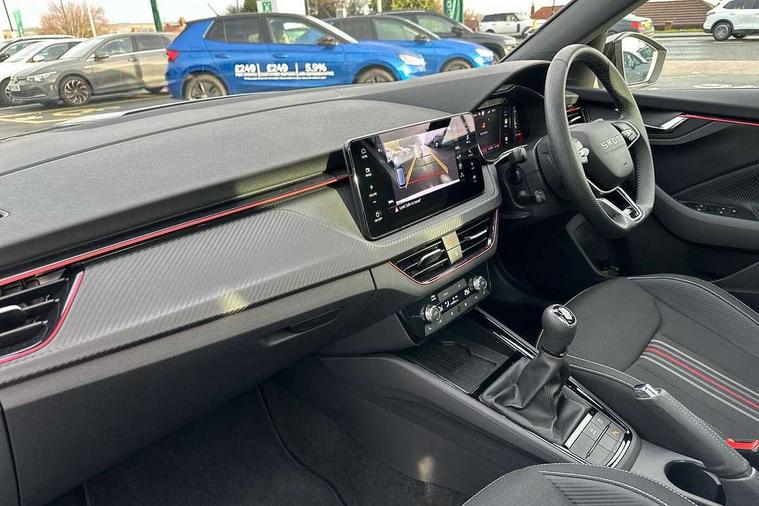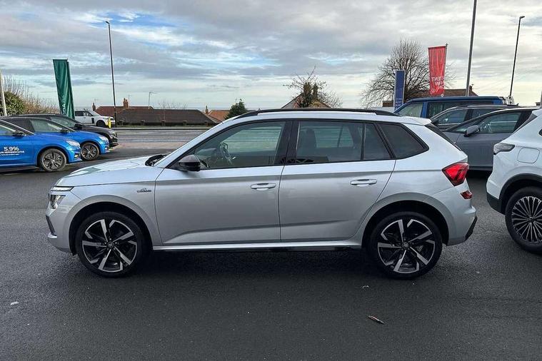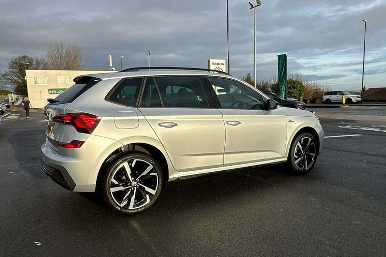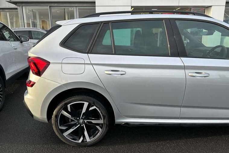 Advanced driver attention and drowsiness monitor, Bluetooth system, E-call, Front assist system, PAS, Rear parking sensors, Rear view camera, Service indicator, Speed limiter, Traffic sign recognition, Virtual cockpit with 10.25" display, Voice control system, Wireless smartlink, 4 USB C ports, 8 Speakers, 9.2" Skoda navigation display, DAB Digital radio, Auto dimming rear view mirror, Automatic headlight control with coming home and leaving home feature, Black door mirrors, Black radiator grille, Black rear diffuser, Black roof spoiler, Body colour bumpers, Body colour door handles, Boot lettering in black, Extended tailgate glass, Fixed panoramic sunroof with black roof rails, Front and rear electric windows, Heated rear window, LED daytime running lights, LED high beam, LED low beam, LED third brake light, Light sensors, Monte carlo plaque, Privacy glass, Rear side wing doors, Rear wiper, Ticket holder inside windscreen, 12V socket in luggage compartment, 3 seat bench in 2nd row, Aluminium pedals, Ambient lighting in white/red, Art leather carbon decor inserts, Art leather carbon door inserts, Black roof lining, Cargo elements, Chrome inner door handles, Driver and passenger sun visors with vanity mirror, Dual zone climate control, Front and rear roof lights, Front centre armrest, Front head restraints, Glove compartment with illumination, Height adjustable driver seat, Height adjustable front passenger seat, Ice scraper, Inner circulation control with pollen filter, ISOFIX on front passenger seat, Isofix preparation for back seats, Leather gearknob and handbrake lever, Manual lumbar support for front seats, Monte Carlo cloth upholstery, Net package and top tether hooks in boot space, Net under rear shelf, Pocket on the back of both front seats include mobile phone pockets, Rake/reach adjustable steering wheel, Reading lights, Rear centre armrests, Red hotstamping, Single front passenger seat, Sports seats, Textile floor mats, Third rear headrest, Top tether for front passenger seat, Umbrella in driver's door, Light and view plus package - Kamiq, 3x3 point rear seatbelts, Airbags - driver and front passenger, Disc brakes, ESP, Extended and predictive pedestrian/cyclist protection, Front passenger airbag deactivation switch, Front side airbags with curtain airbags, Hill hold control, Manual leather parking brake, Manual rear child locks, One tone horn, Seatbelt reminder for driver an co-driver, Traction control, Tyre pressure monitor, Anti-theft alarm system with interior monitoring, backup horn, towing protection and remote central locking with SAFE system, Anti-theft wheel bolts, Electronic engine immobilizer, 18" Ursa black diamond cut alloy wheels,
